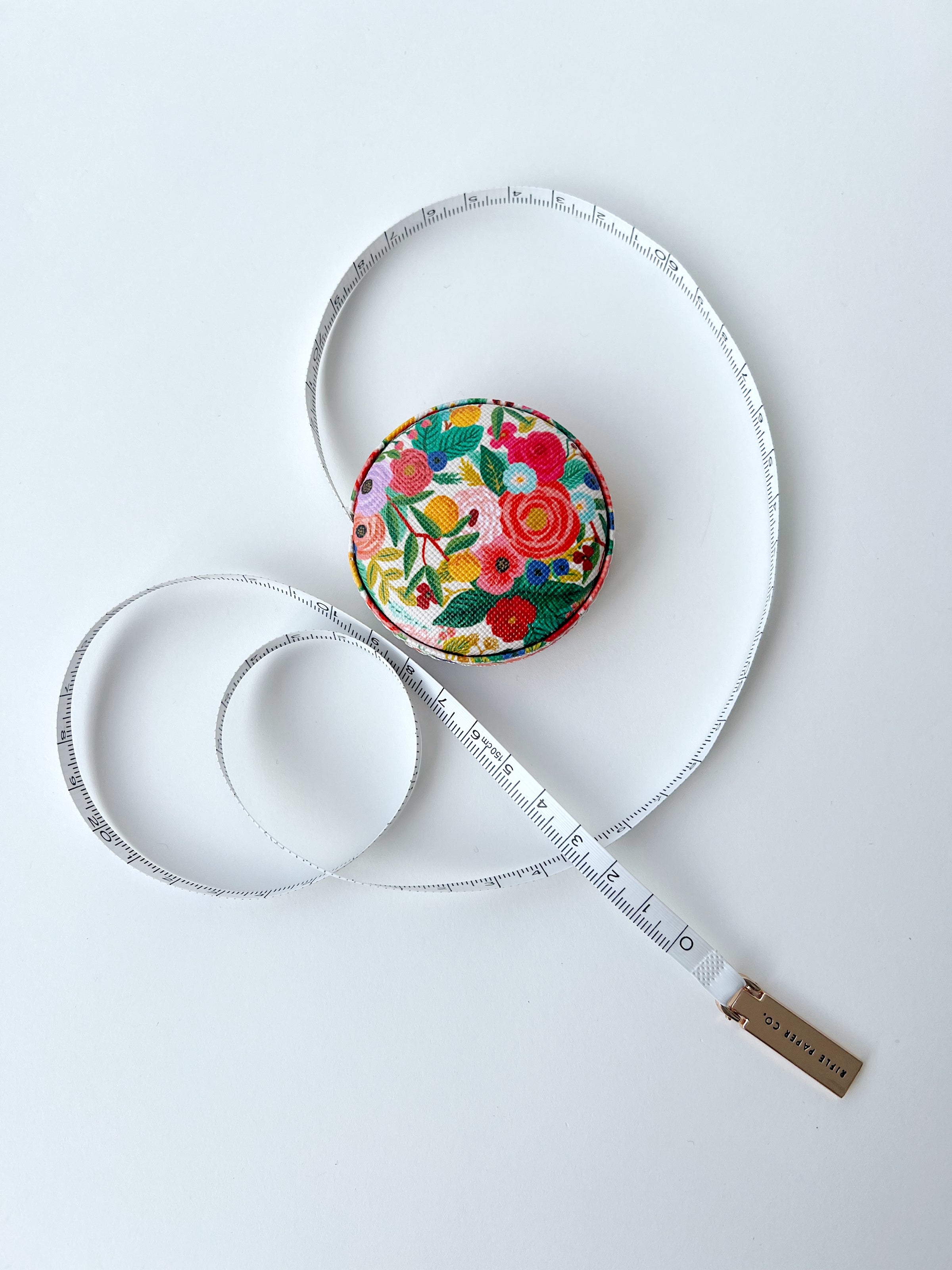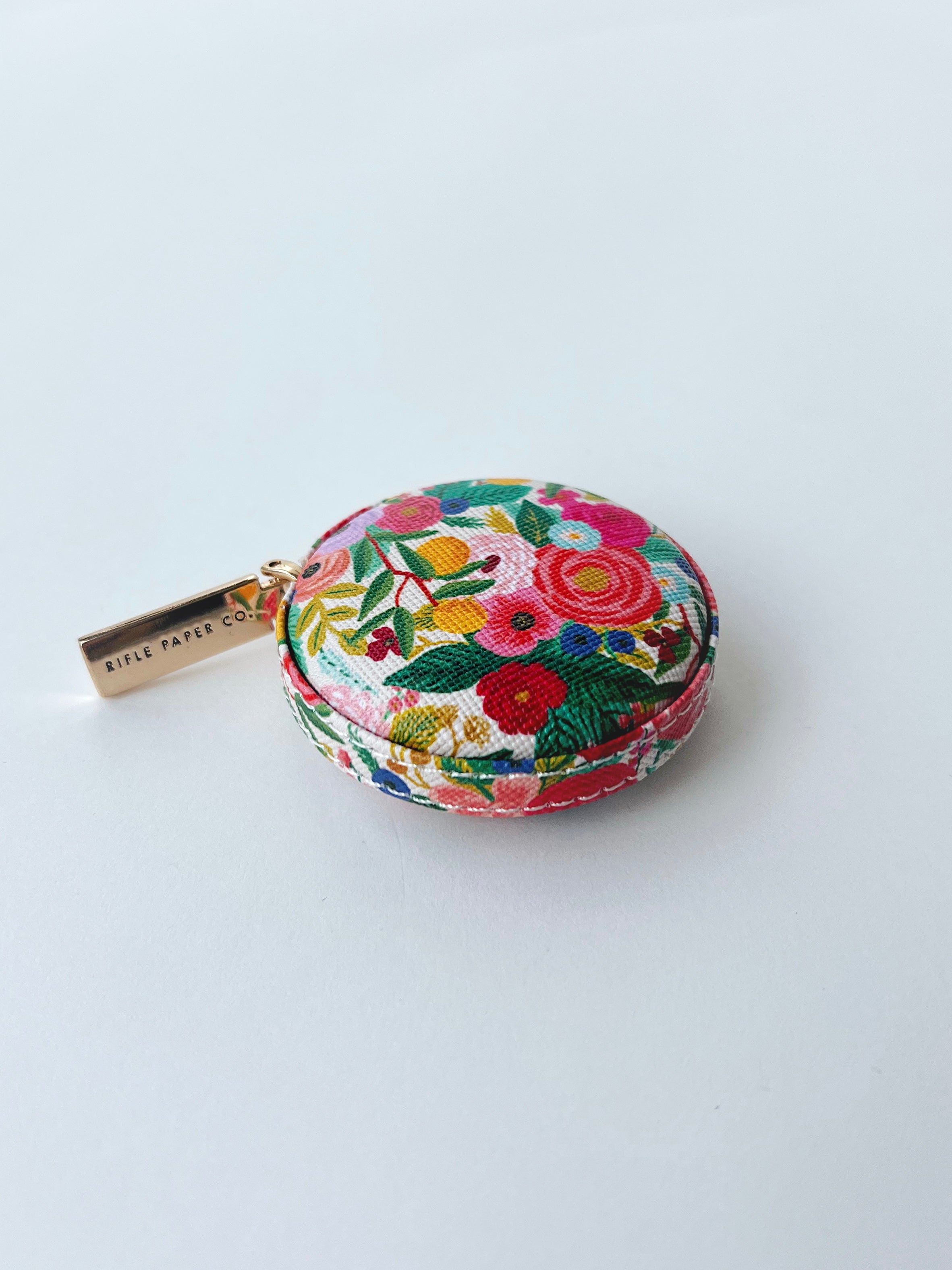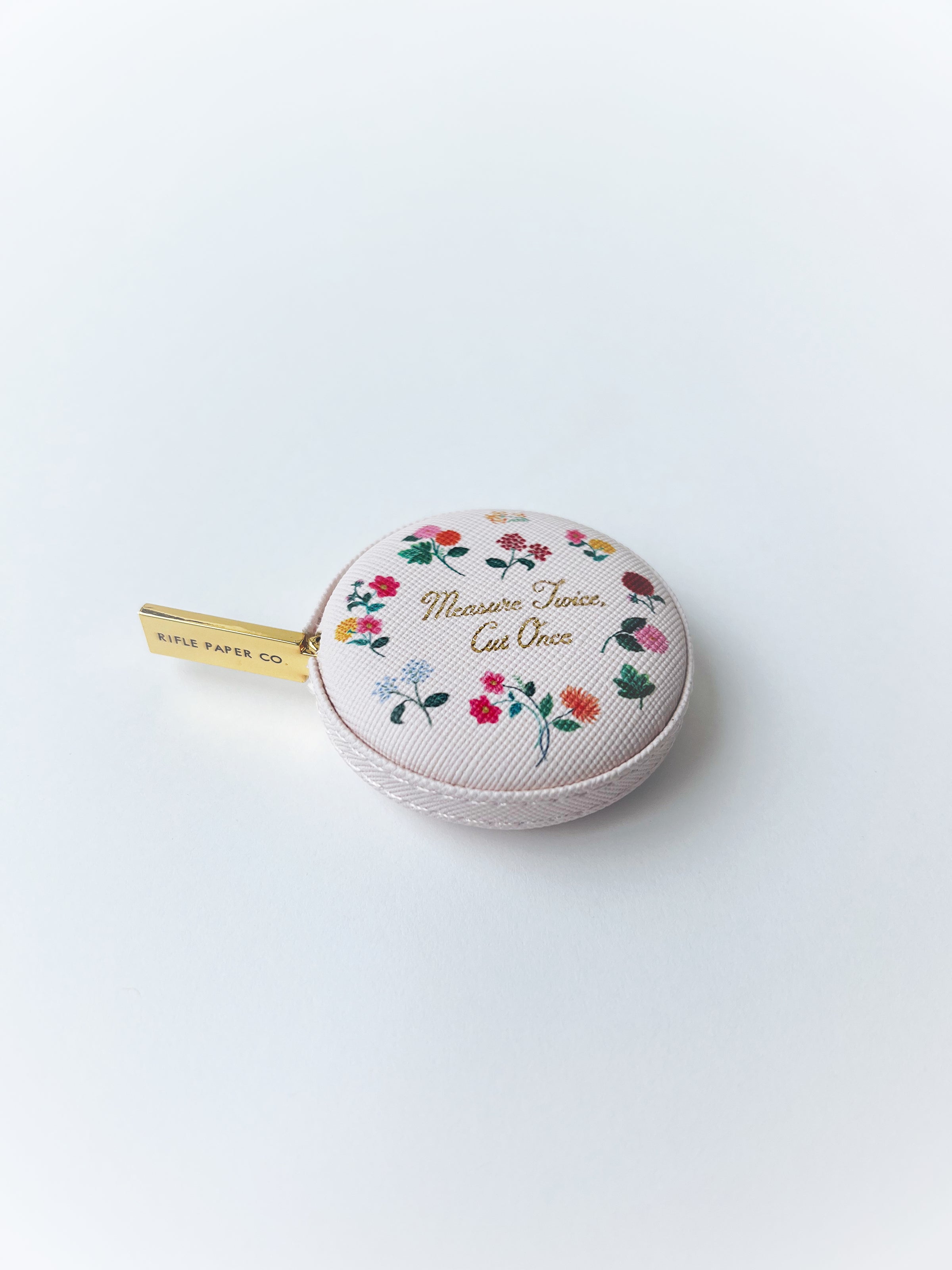 This retractable measuring tape is housed in an illustrated case with brass hardware and a hidden button release. Keep this handy tool in your sewing box, at your desk, or in your purse. The tape measures 60 inches or 152.4 centimeters. DETAILS - 2.25" L × 2.25" W - Textured PU with metal hardware - Printed in full color - 5 foot retractable tape - Wipe clean - Imported