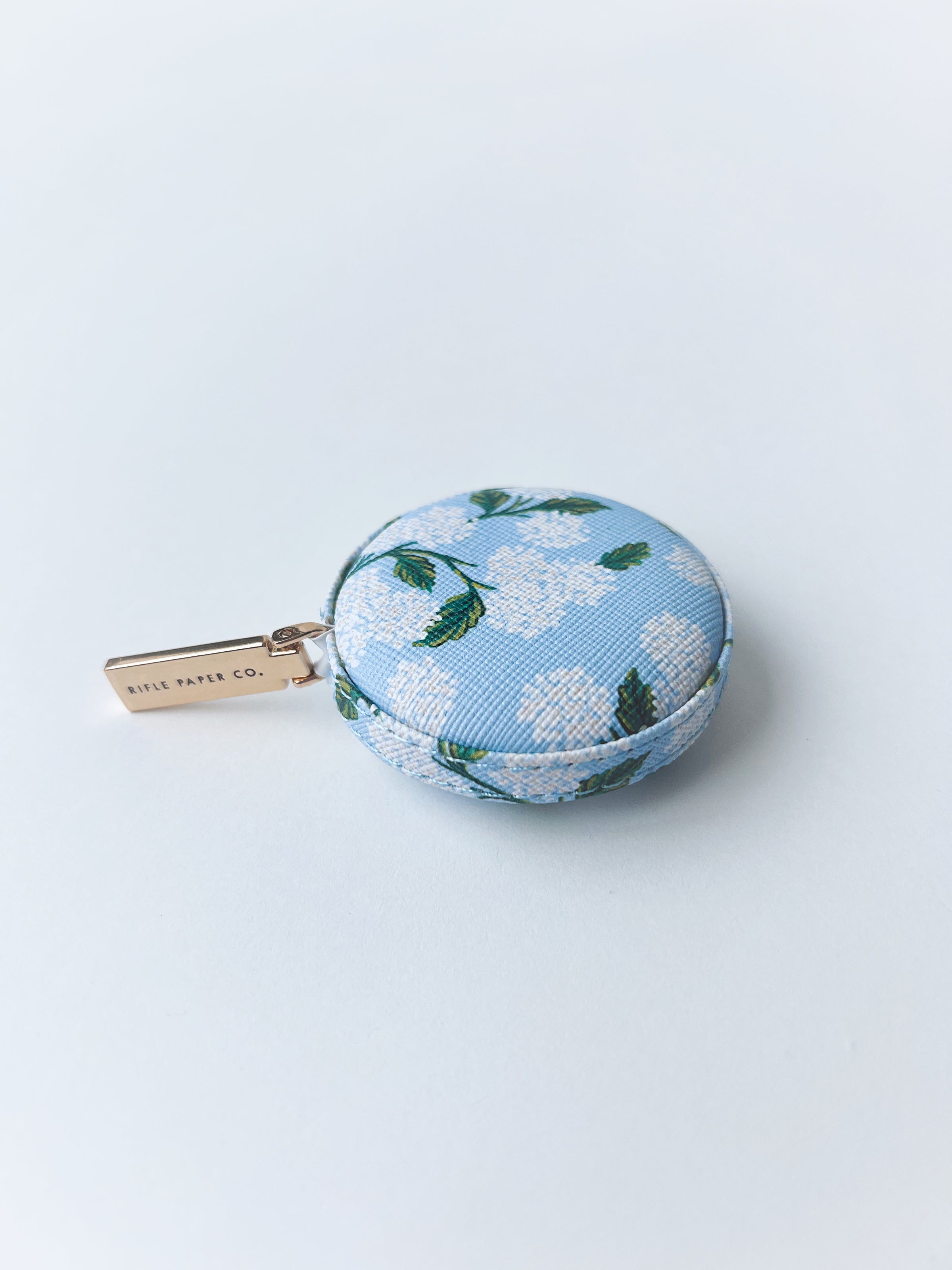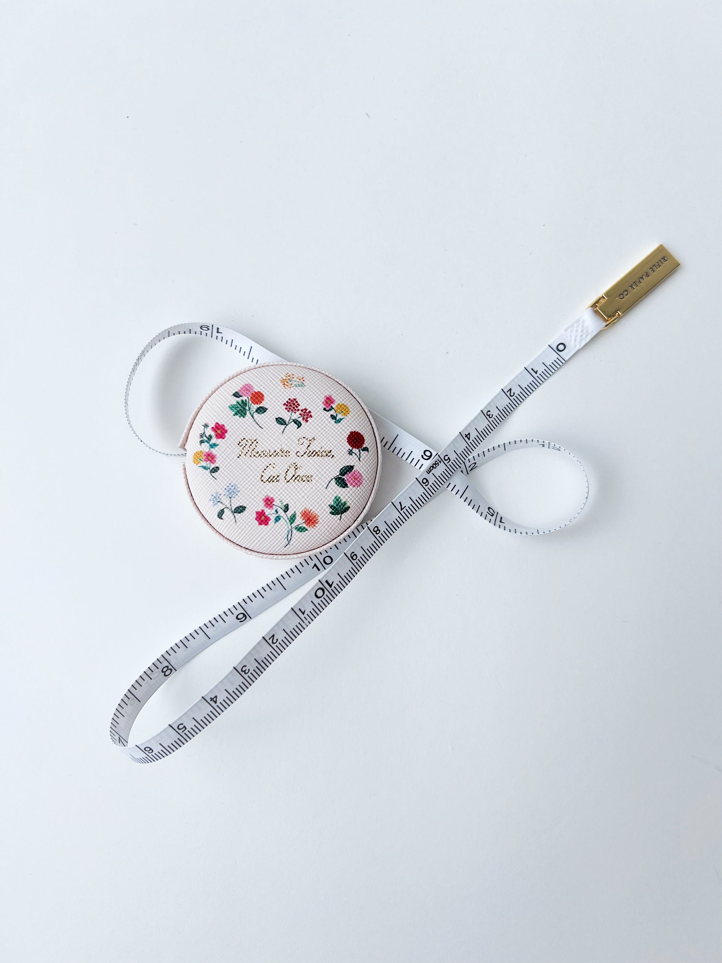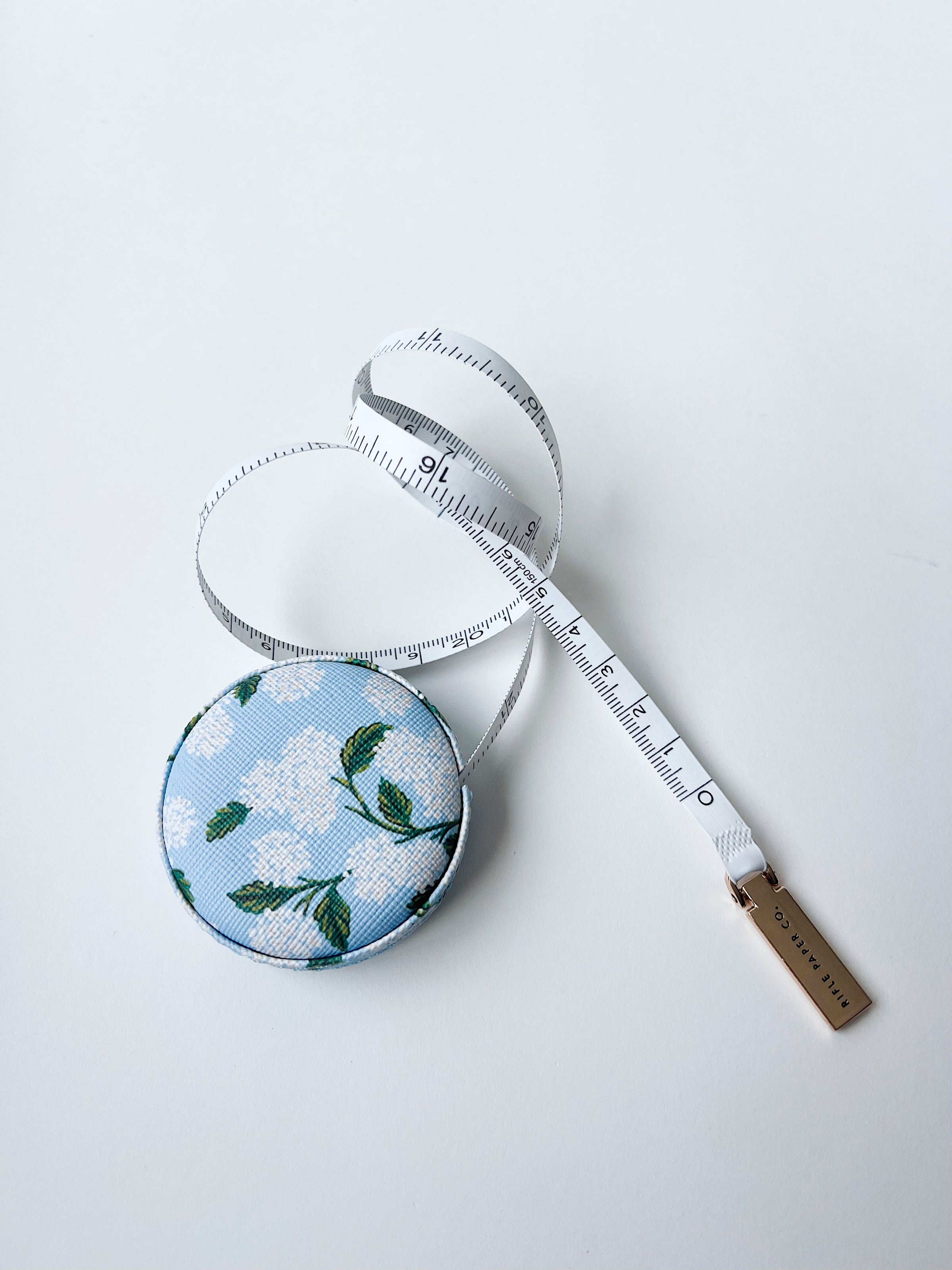 This retractable measuring tape is housed in an illustrated case with brass hardware and a hidden button release. Keep this handy tool in your sewing box, at your desk, or in your purse. The tape measures 60 inches or 152.4 centimeters. DETAILS - 2.25" L × 2.25" W - Textured PU with metal hardware - Printed in full color - 5 foot retractable tape - Wipe clean - Imported
