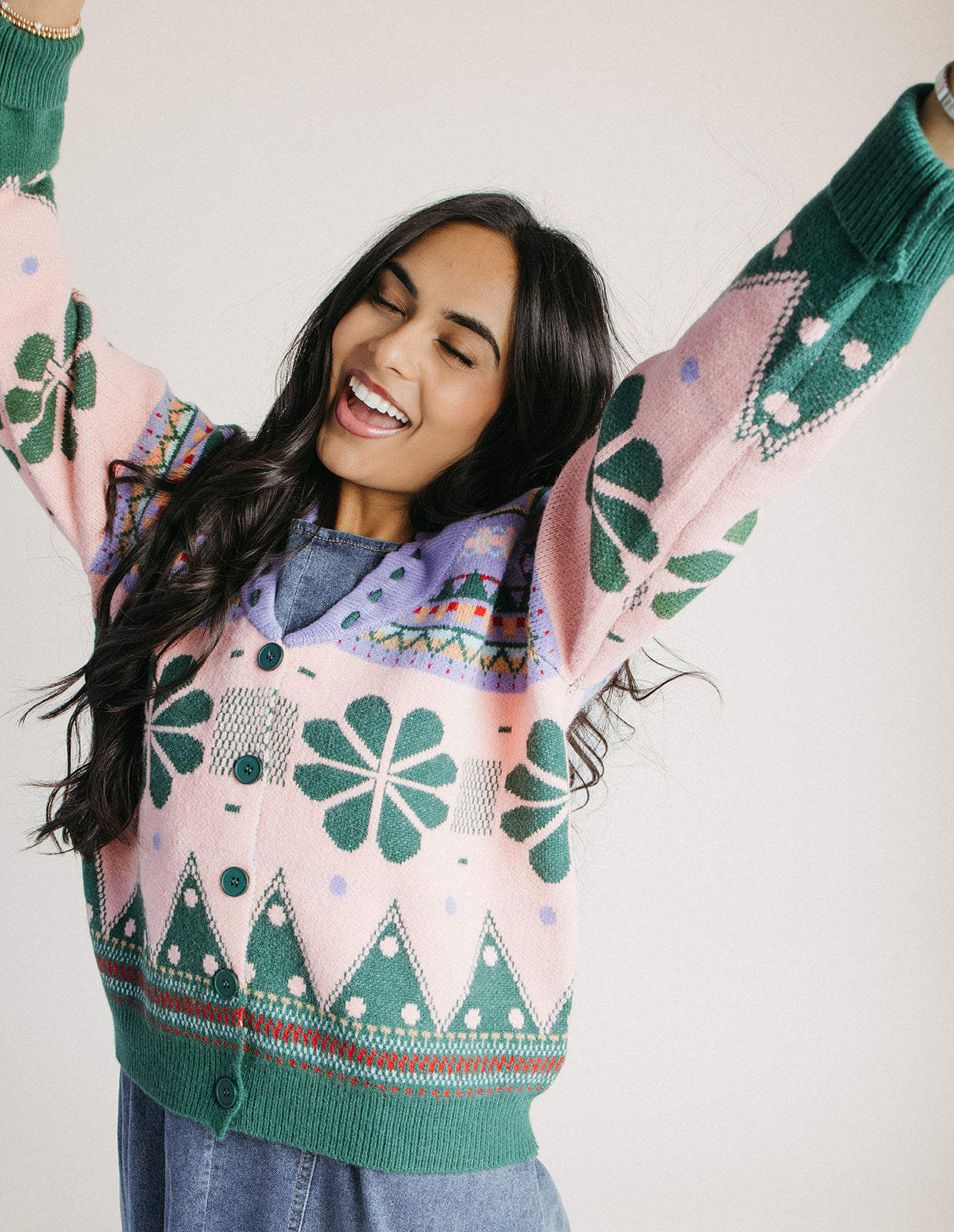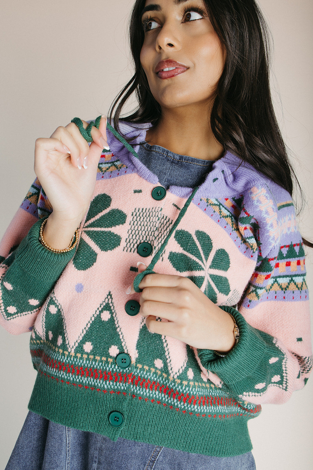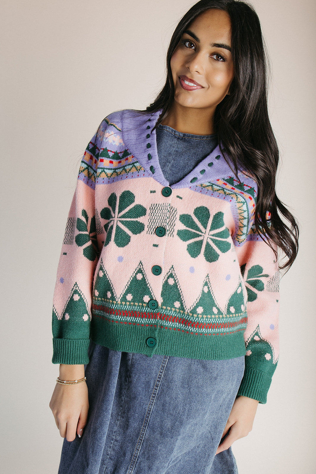 Meet your new favorite layering piece—a collared cardigan that refuses to be boring. The dreamy lavender and vibrant green color combo is giving main character energy, while the crisp collar keeps things polished and put-together. Slip it on over a dress, a tee, or basically anything in your closet and instantly level up your vibe. Cozy enough for lounging, stylish enough for stepping out, this cardigan is your ticket to looking effortlessly chic without breaking a sweat.