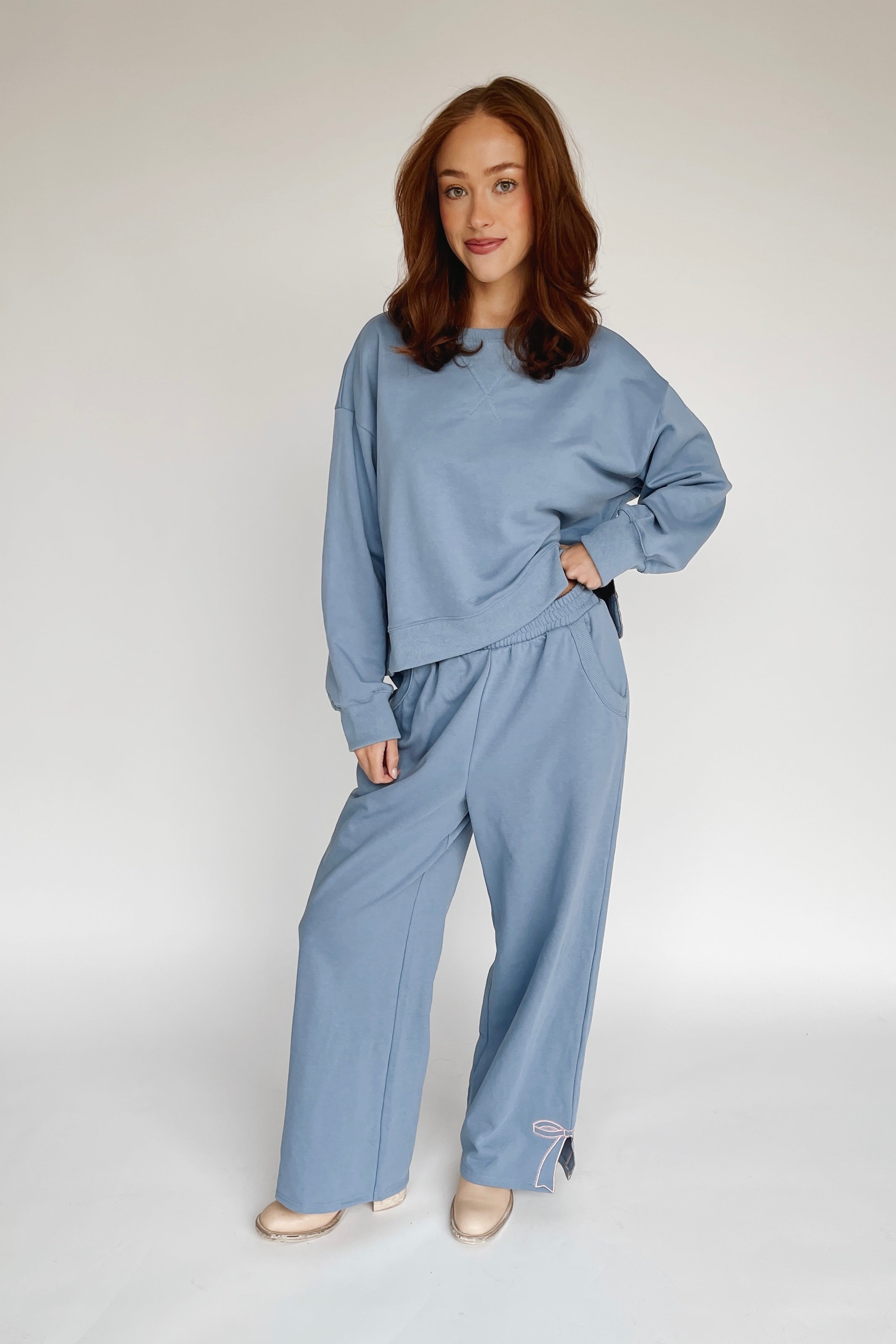 The Stevison Bow Embroidered Pant in Dusty Blue