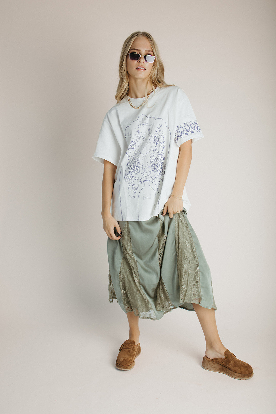The Vanna Lace Panel Silk Maxi Skirt in Light Olive