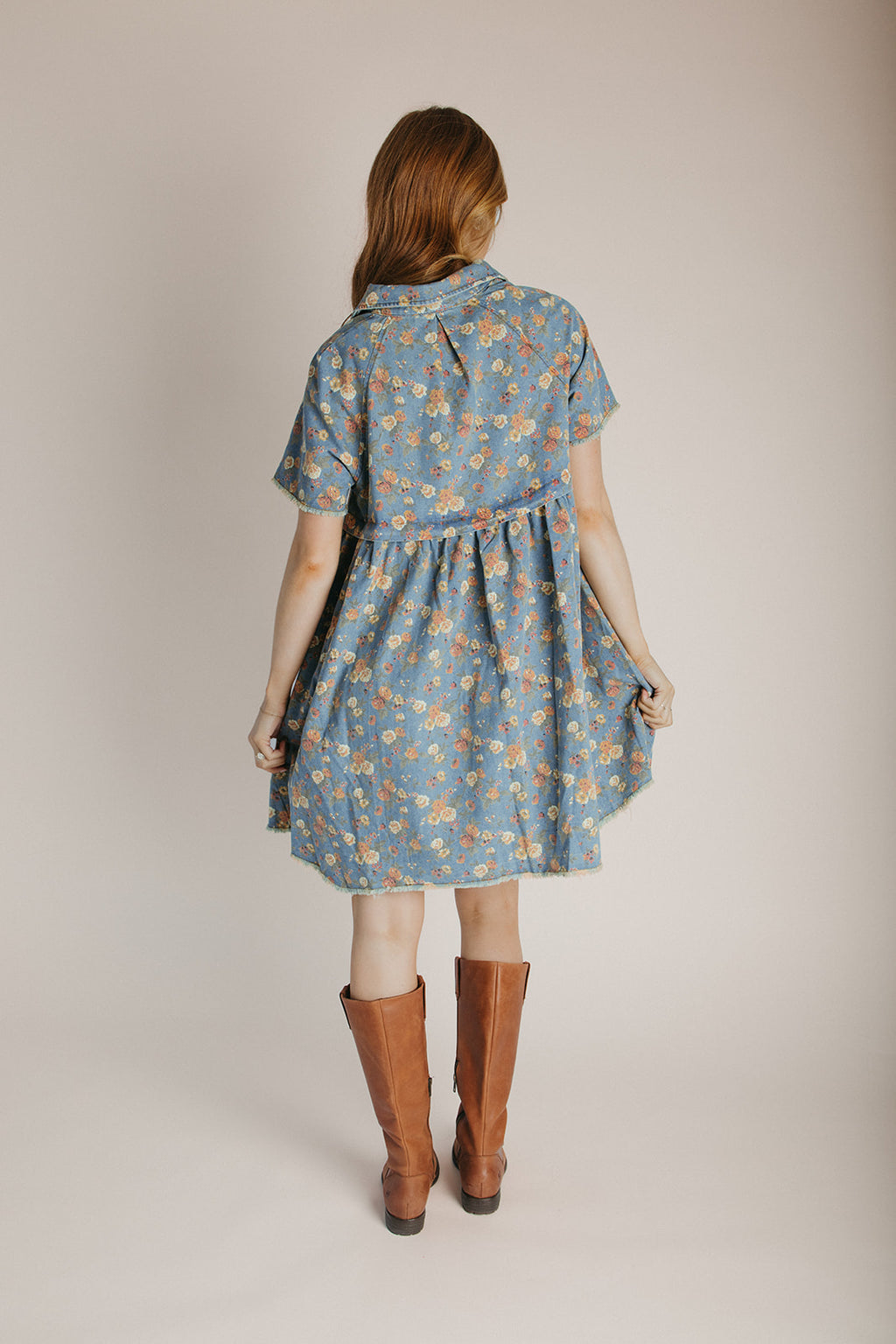 The Snook Smocked Floral Midi Dress in Blue + Fuchsia