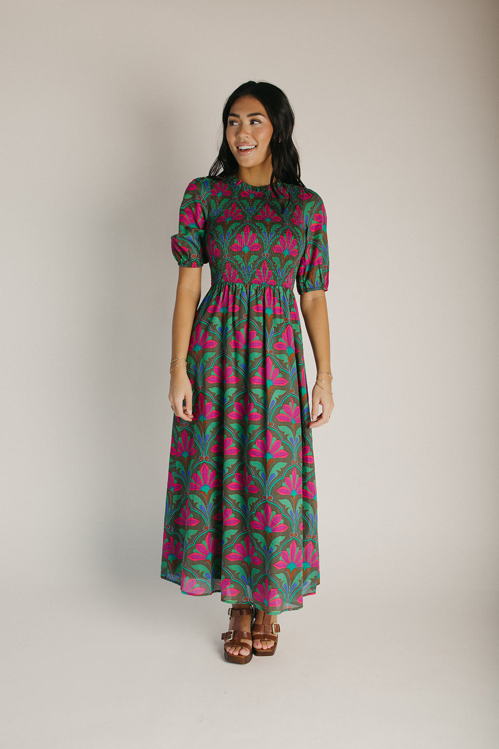 The Kristin Floral Smocked Maxi Dress in Kelly Green + Pink