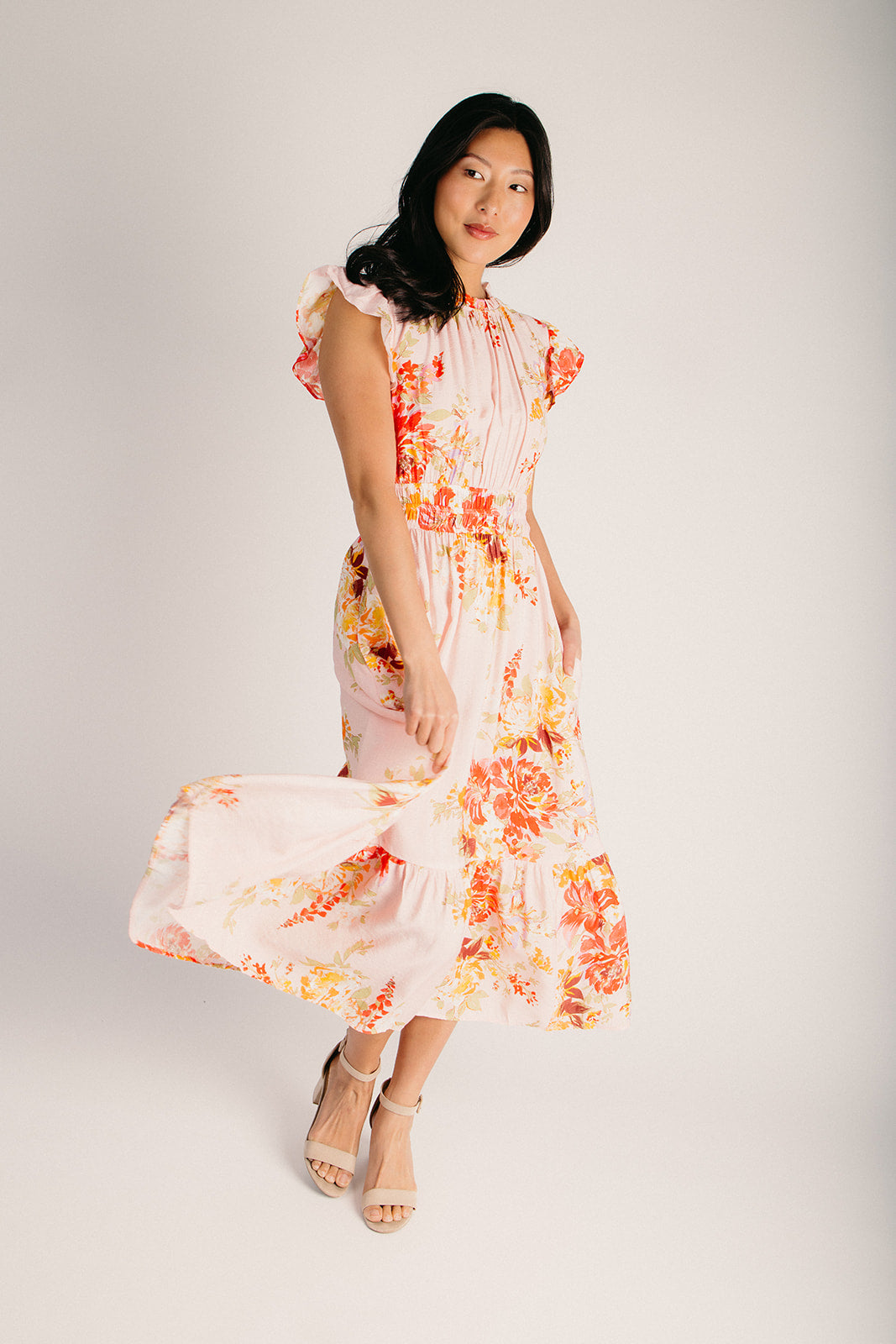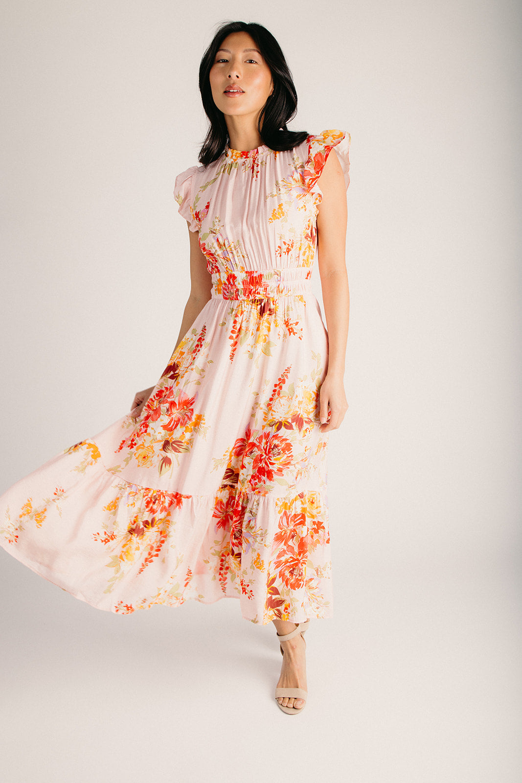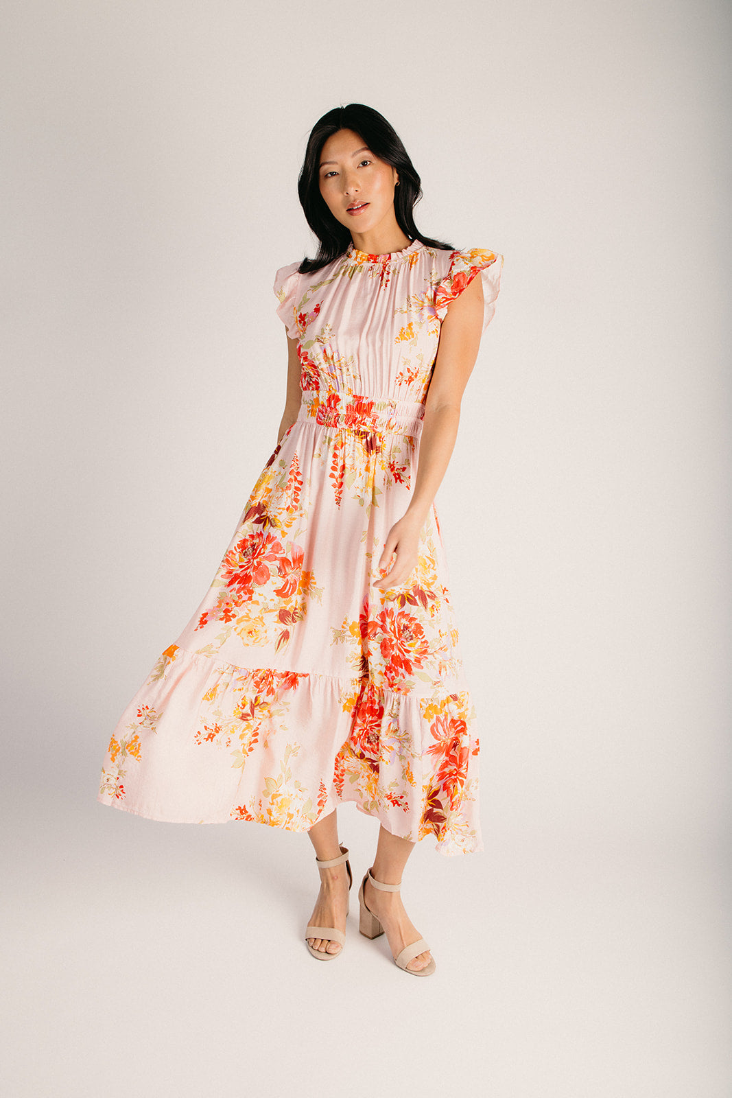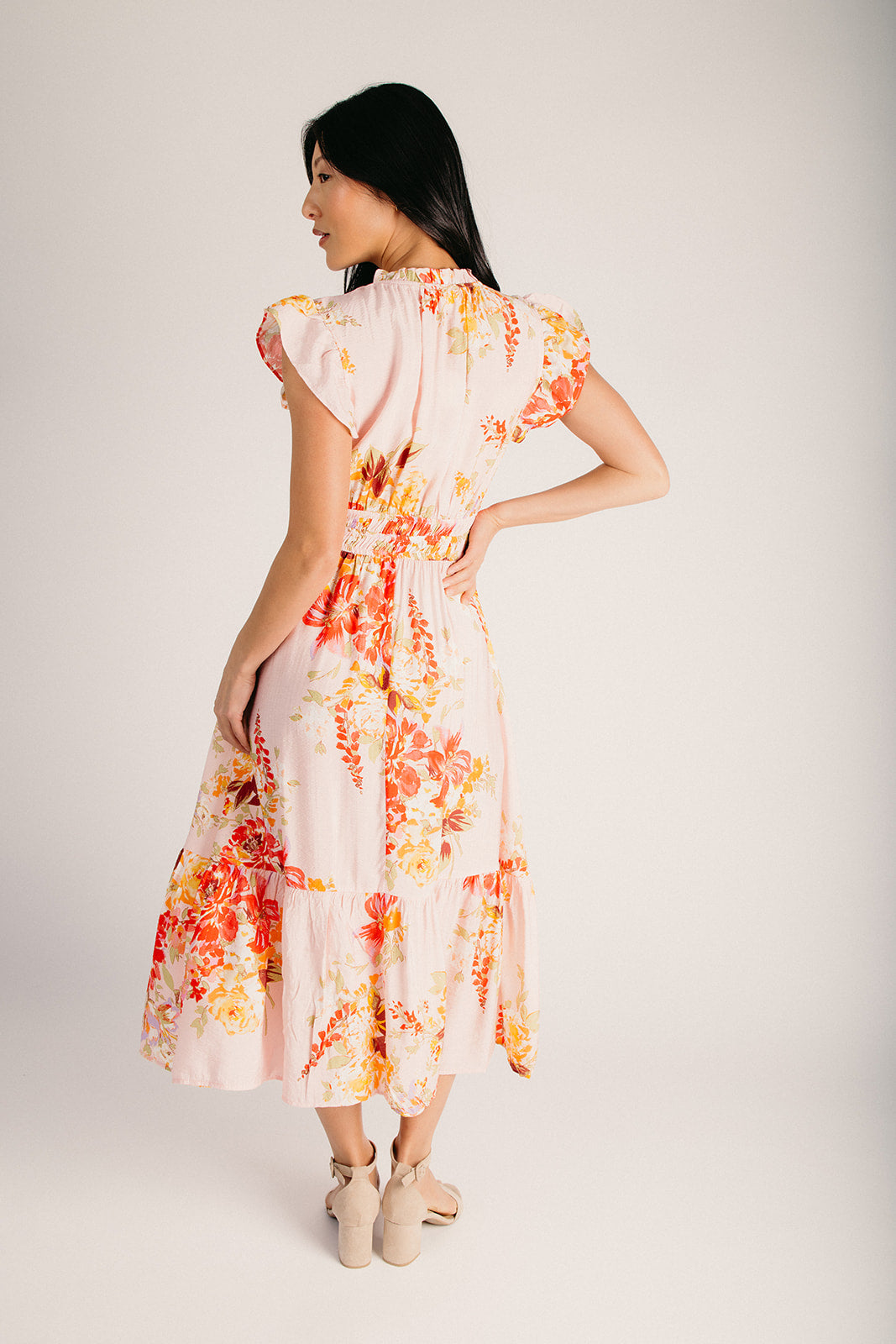 The Hunley Floral Flutter Sleeve Midi Dress in Blush Multi