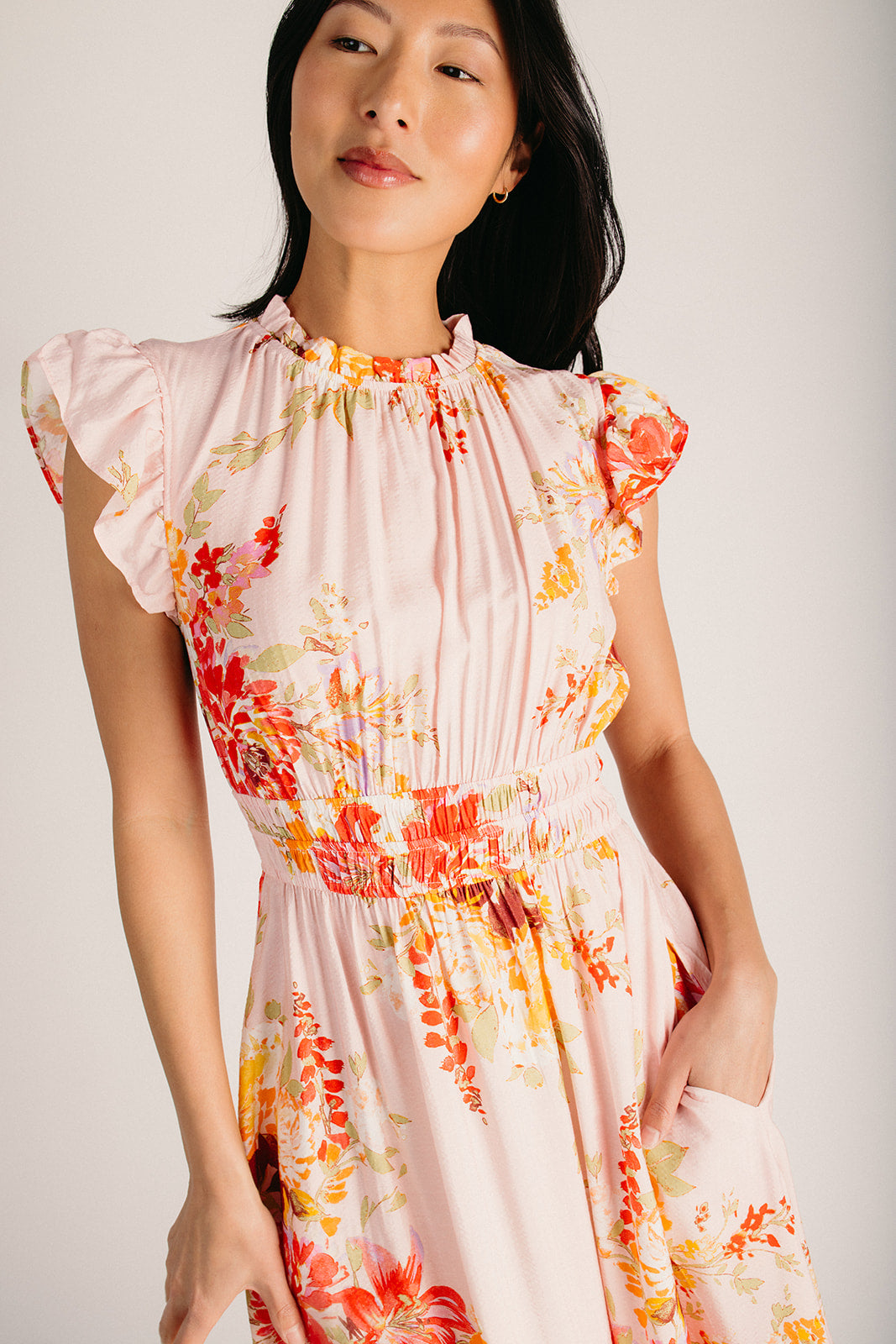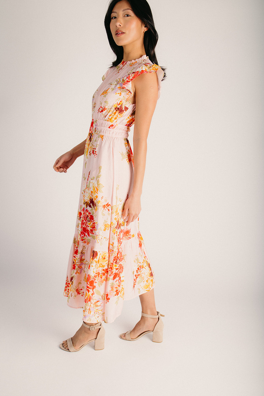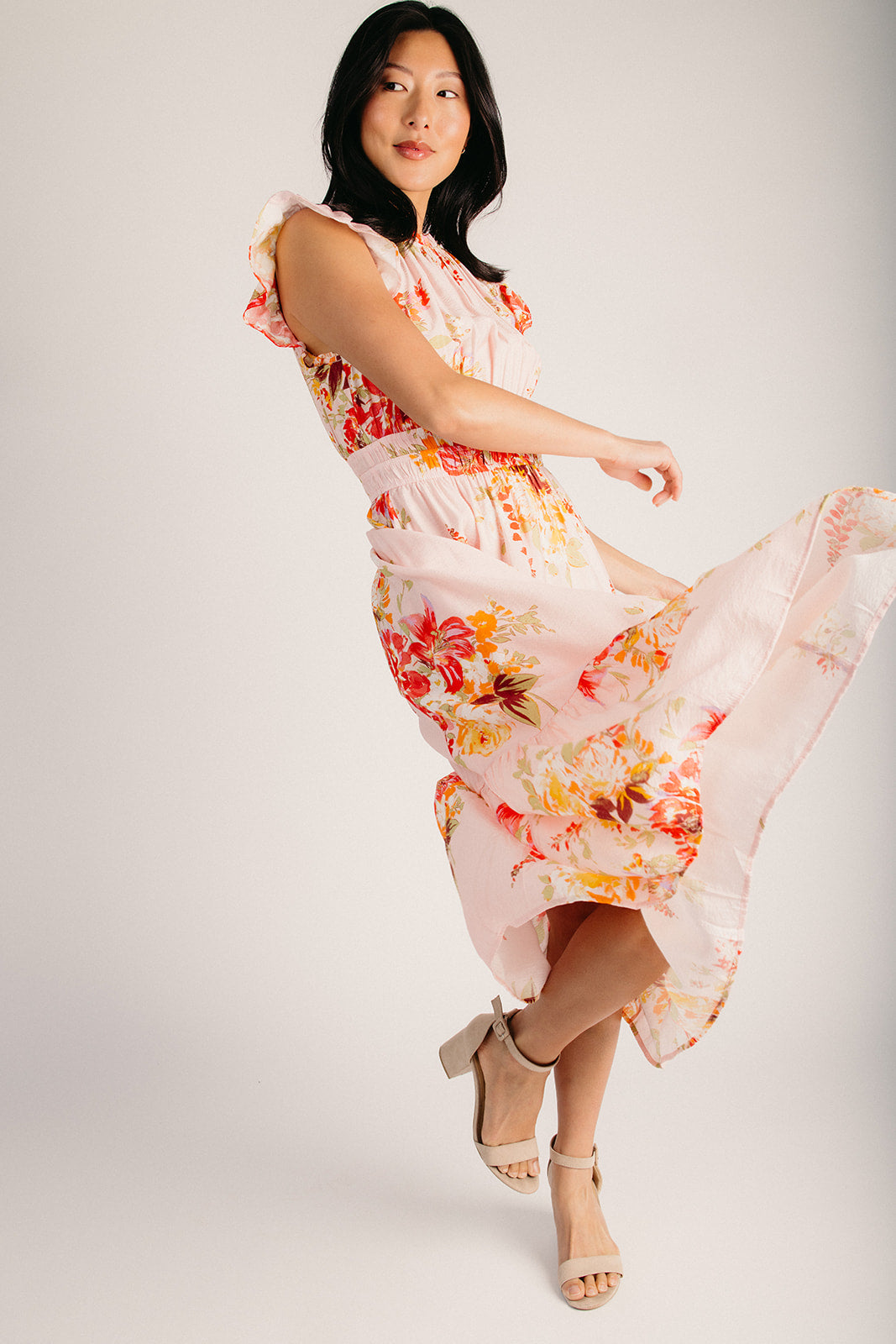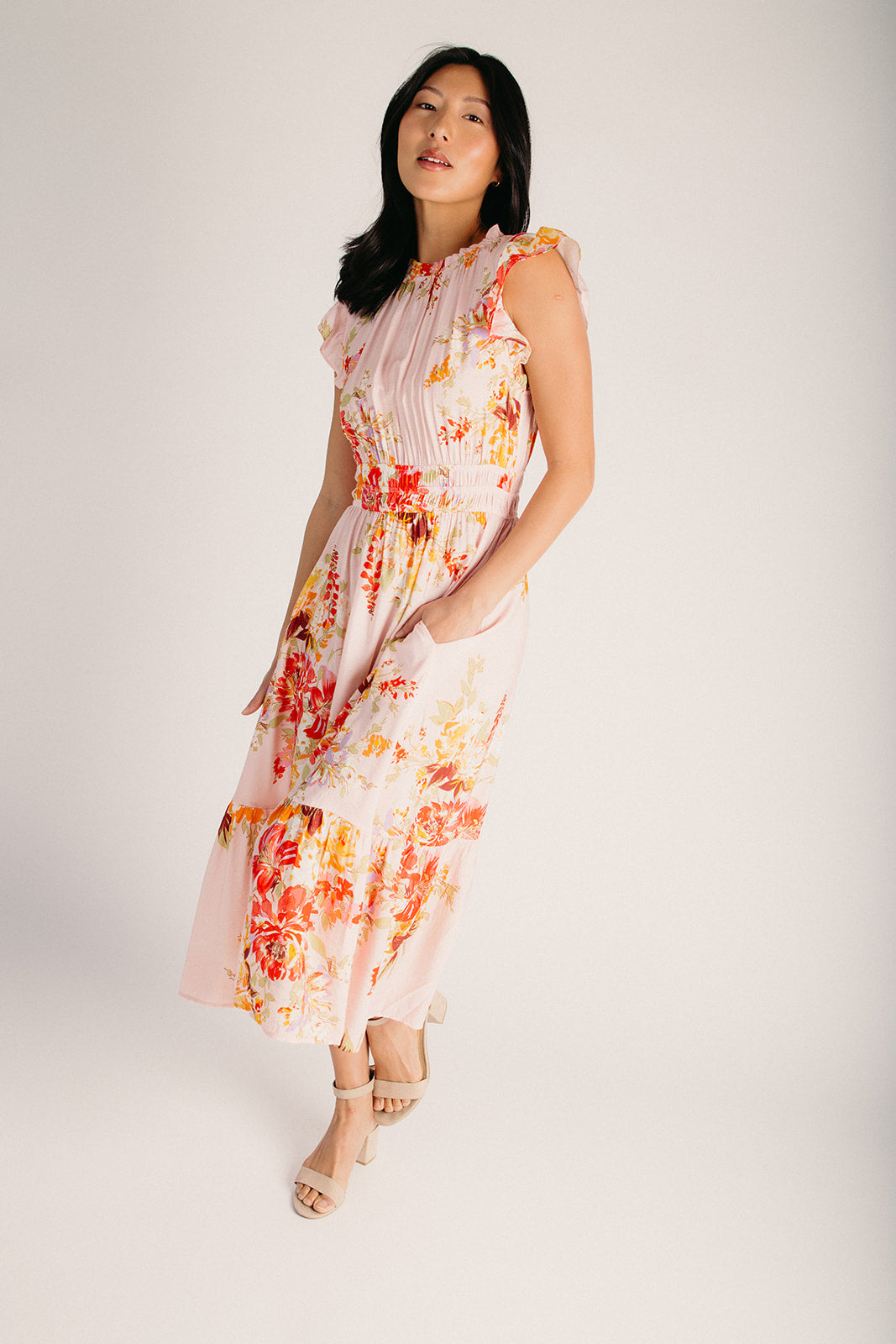 The Hunley Floral Flutter Sleeve Midi Dress in Blush Multi