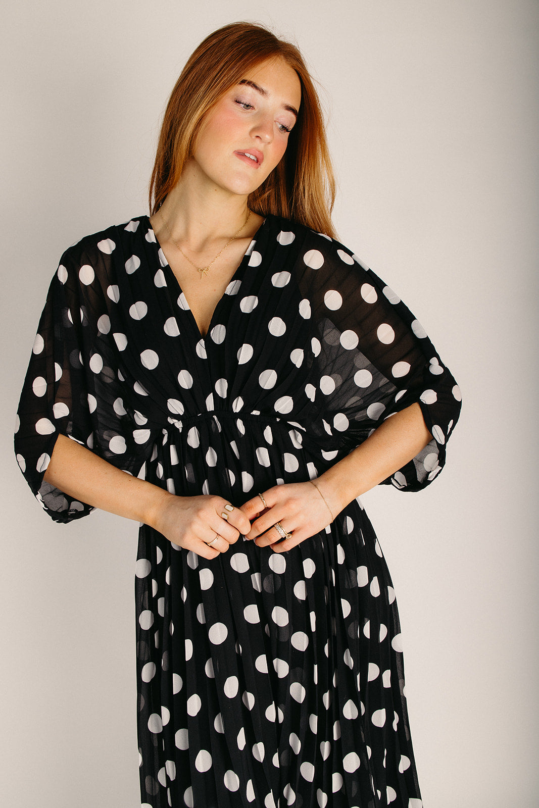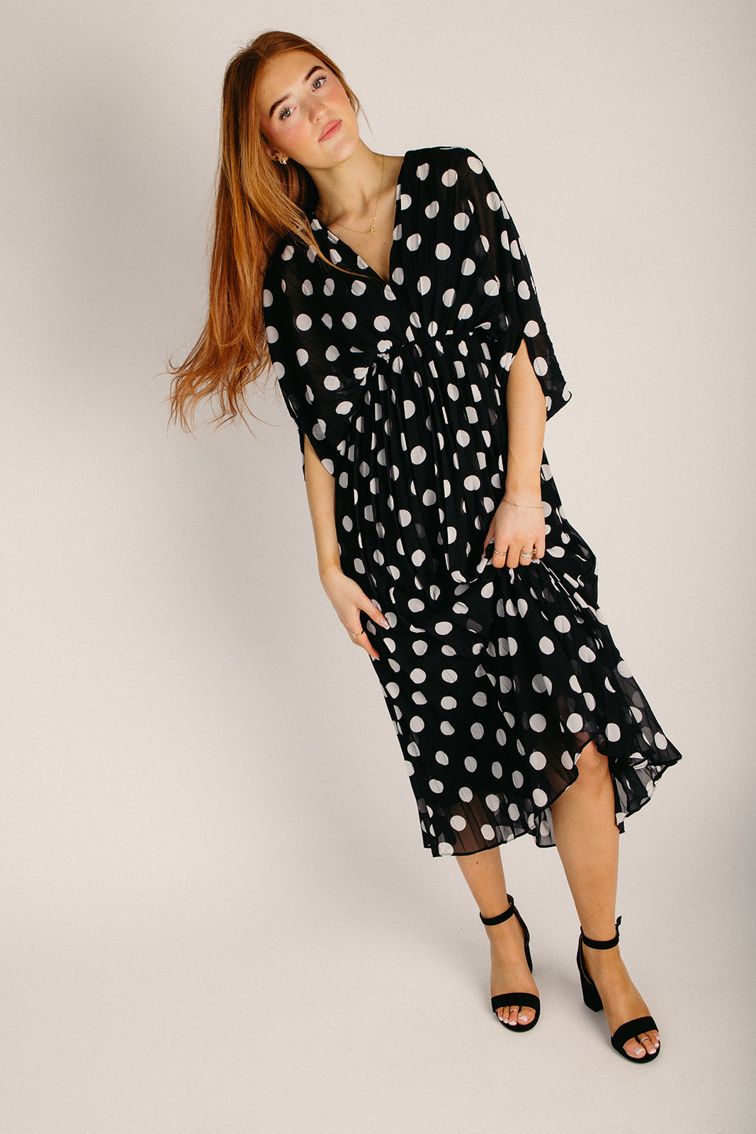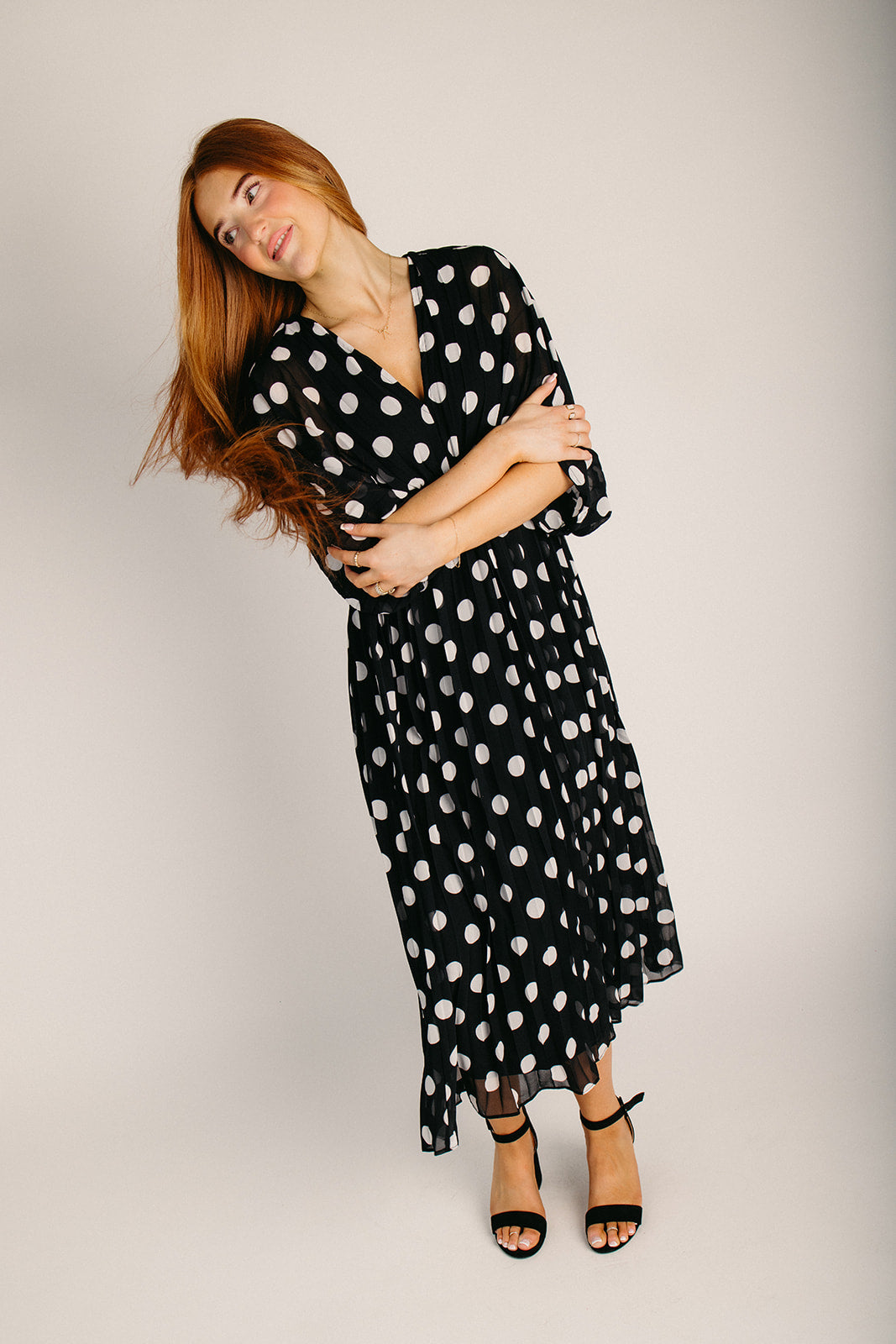 The Lindquist Pleated Dot Midi Dress in Black