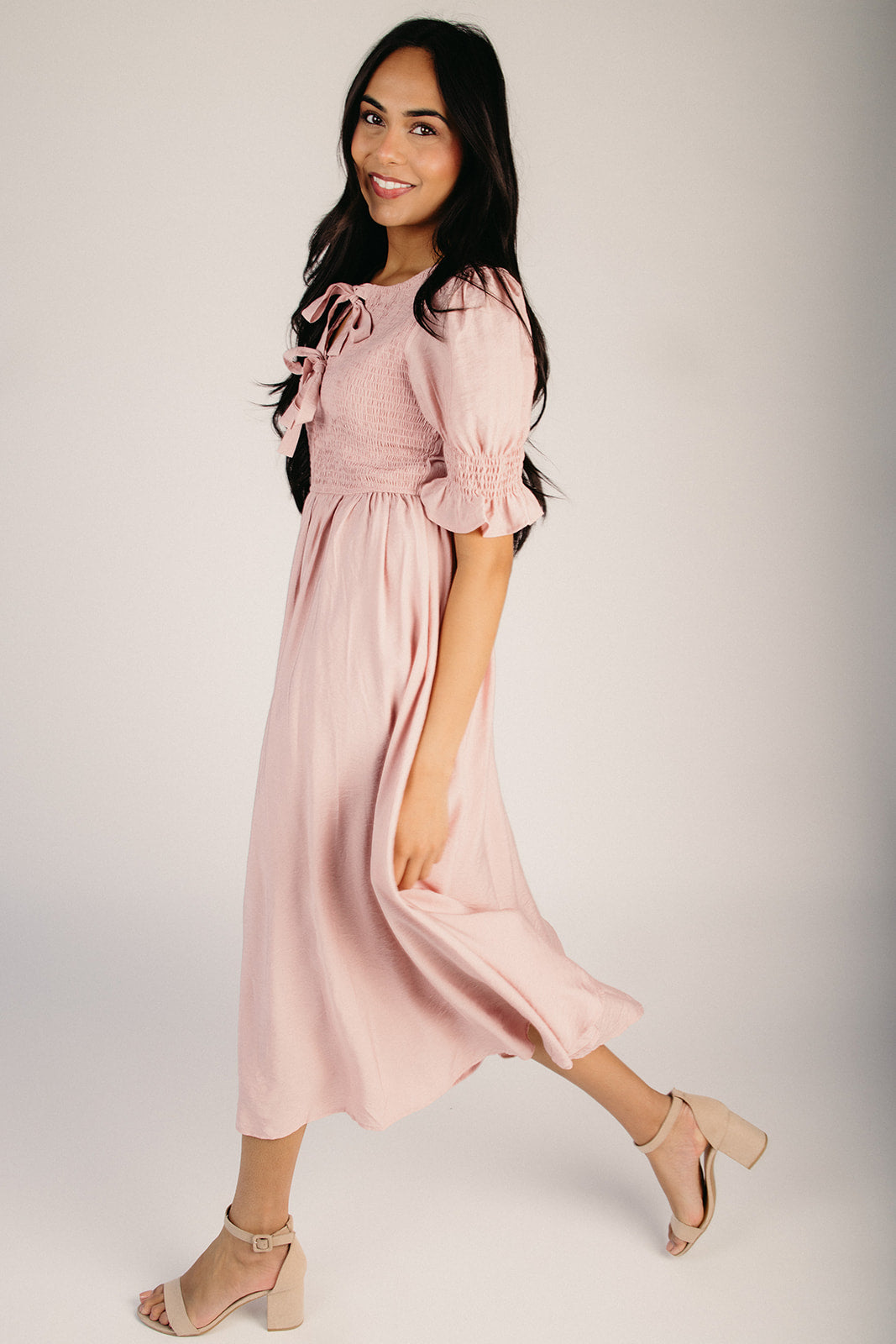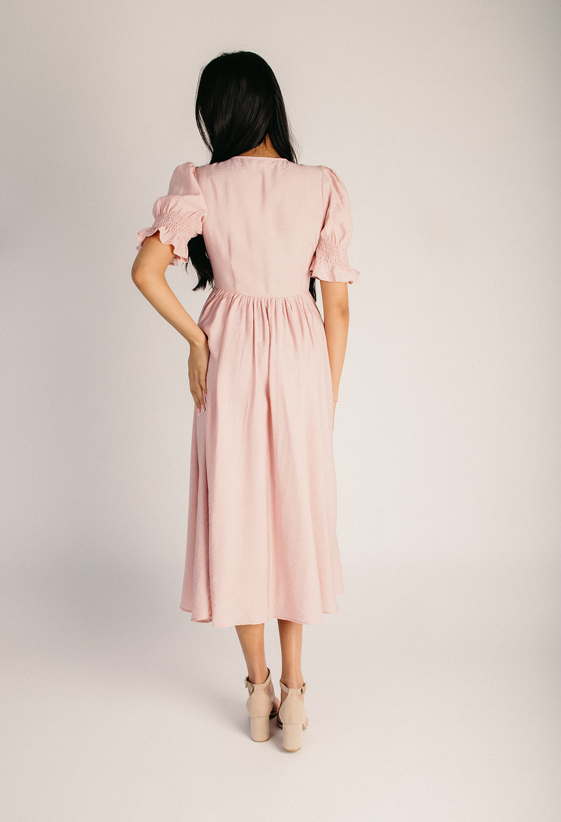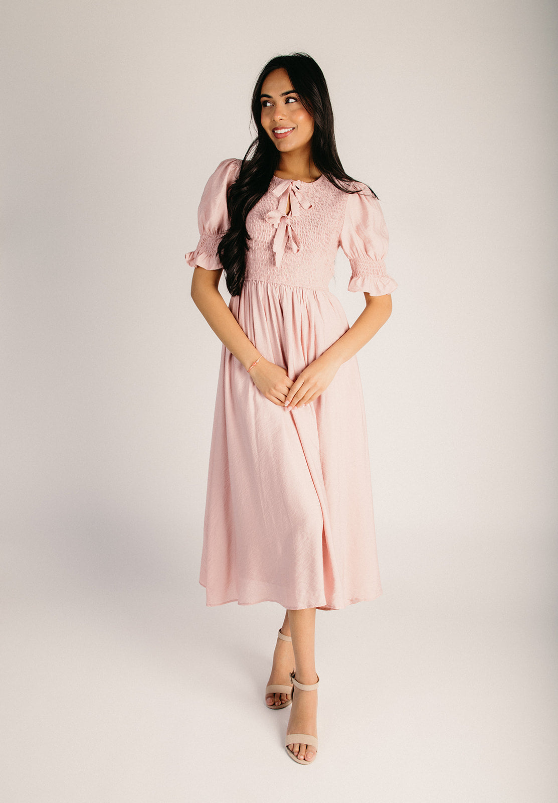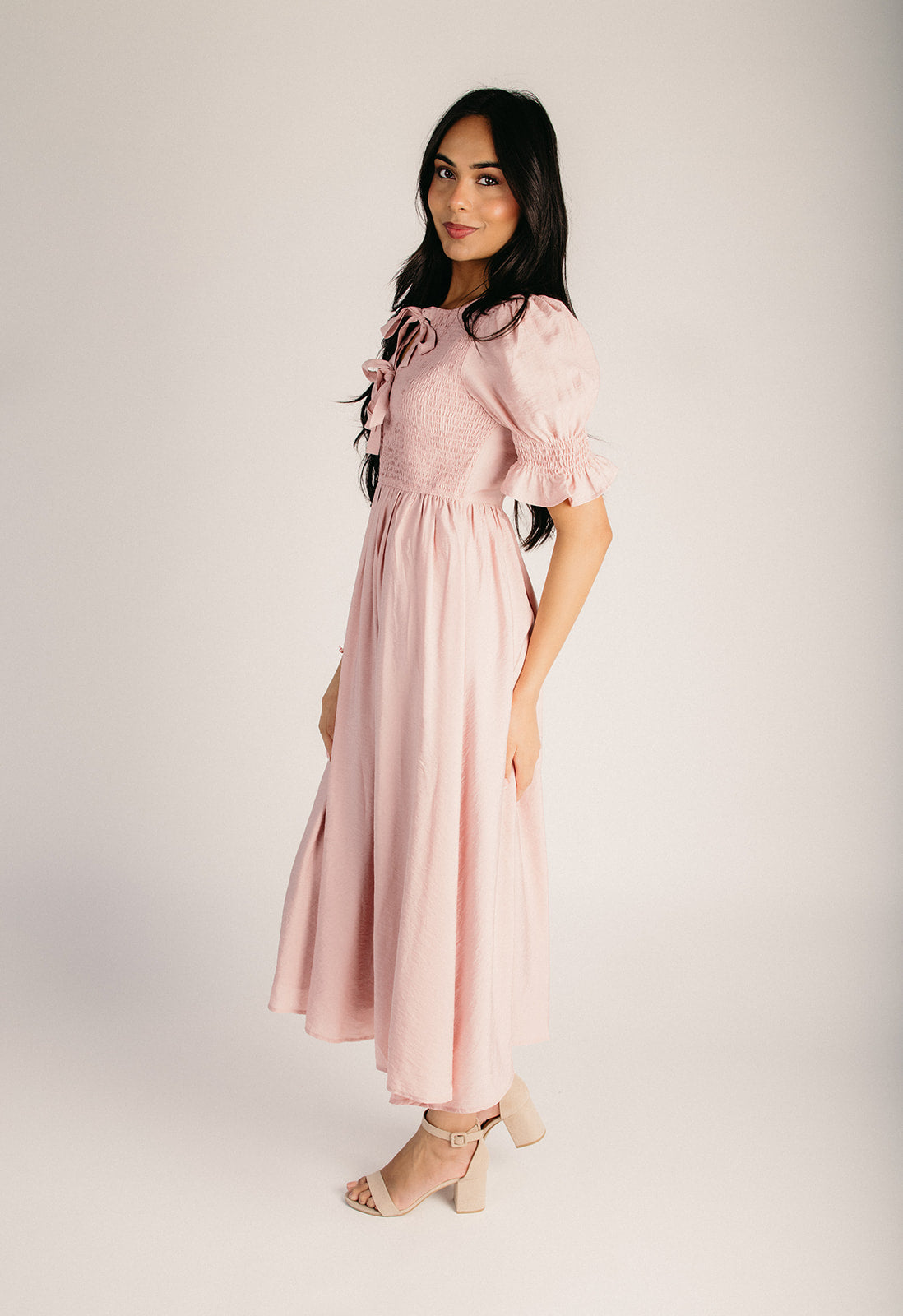 The Melland Smocked Woven Midi Dress in Blush