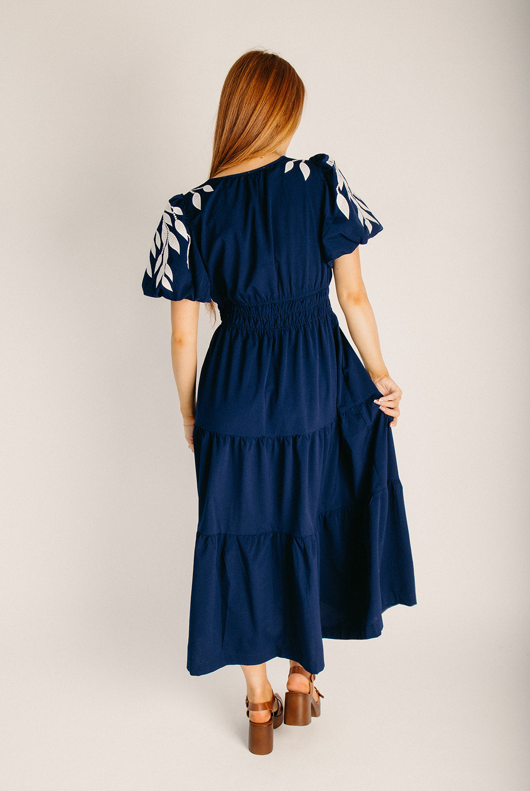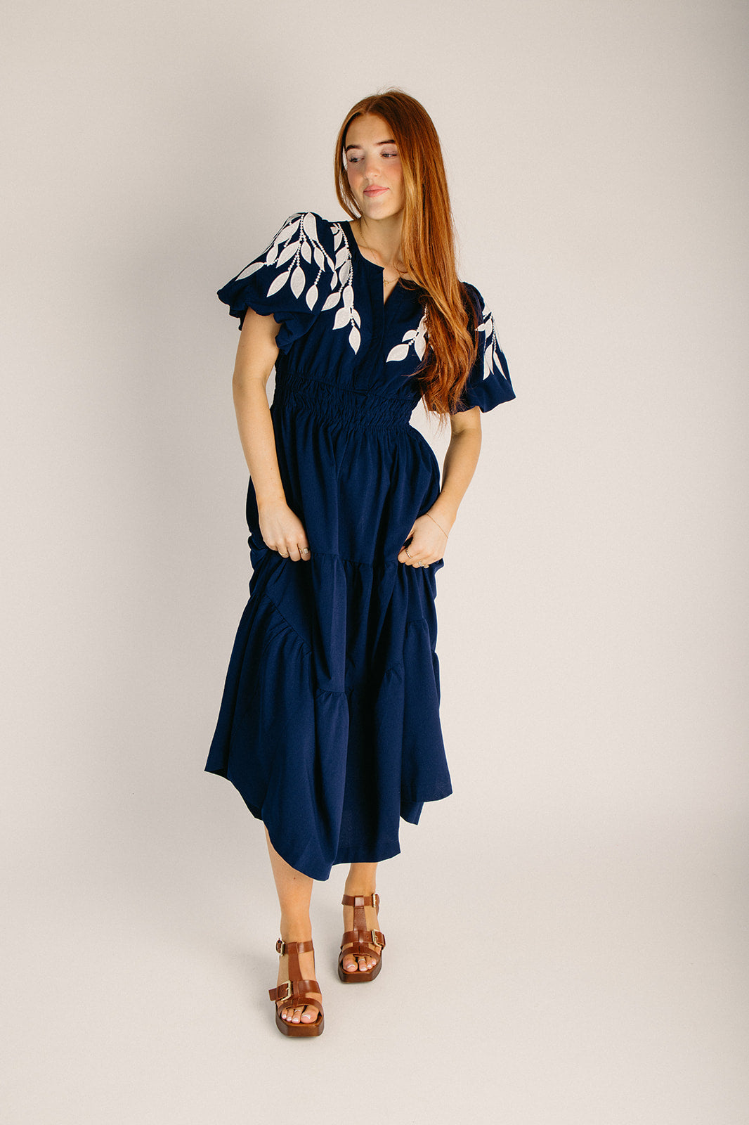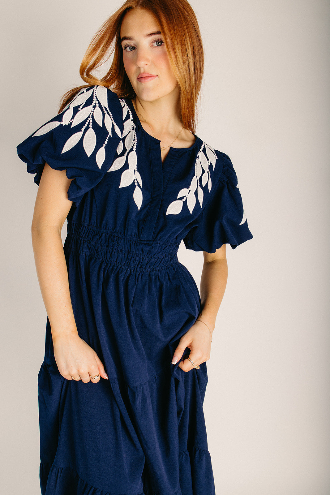 Introducing The Nicki Embroidered Midi Dress in Navy — your new go-to for effortless elegance. This stunning midi features delicate embroidery that adds just the right amount of personality to your wardrobe. With a flattering fit that skims the body beautifully, this dress is the perfect canvas for your personal style. Pair it with your favorite sneakers for casual vibes or dress it up with heels for a night out. Available in sizes small through large, The Nicki is designed to make you feel confident and fabulous.