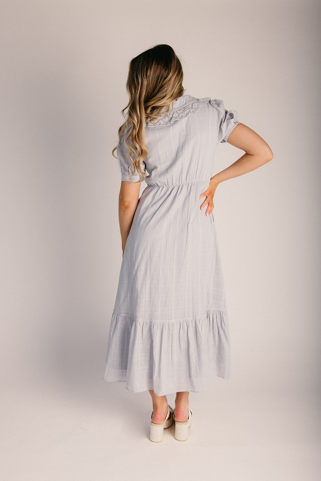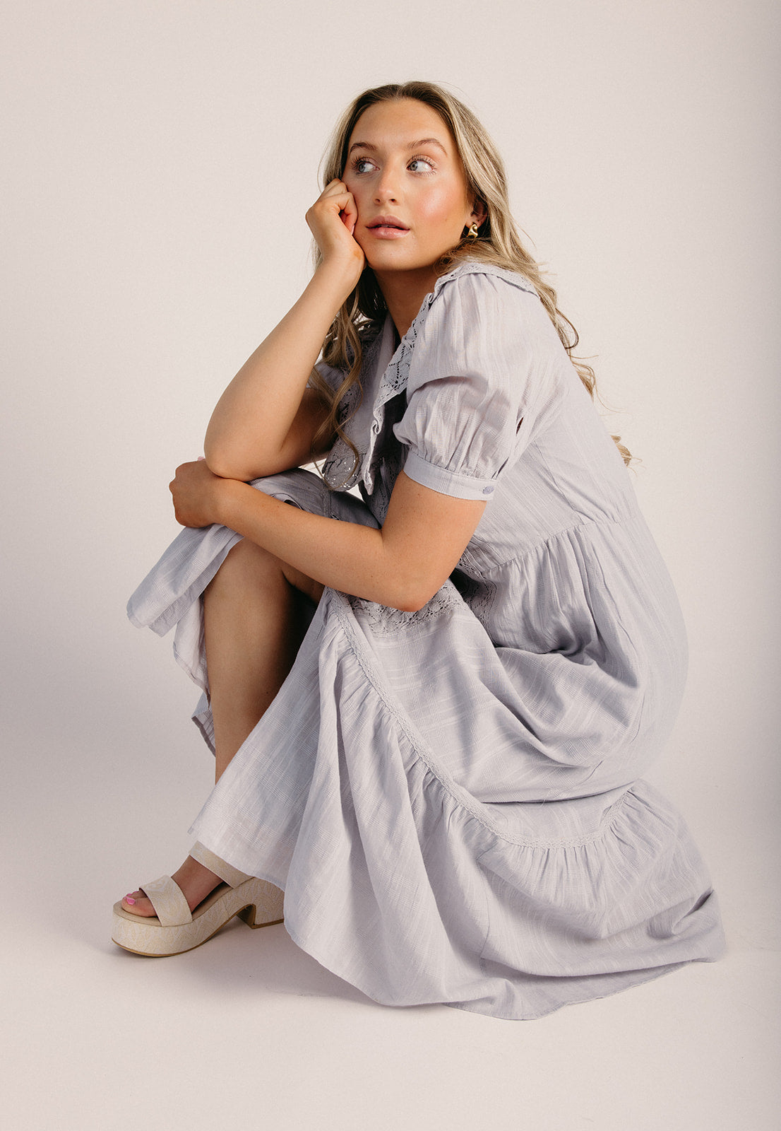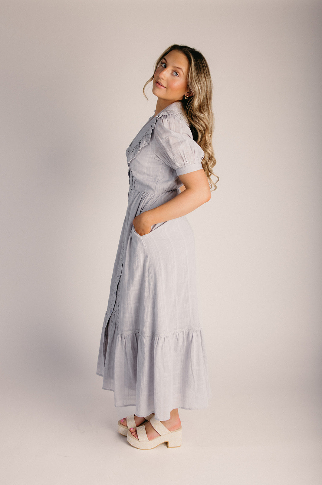The Vandalia Ruffle Collared Maxi Dress in Misty Blue