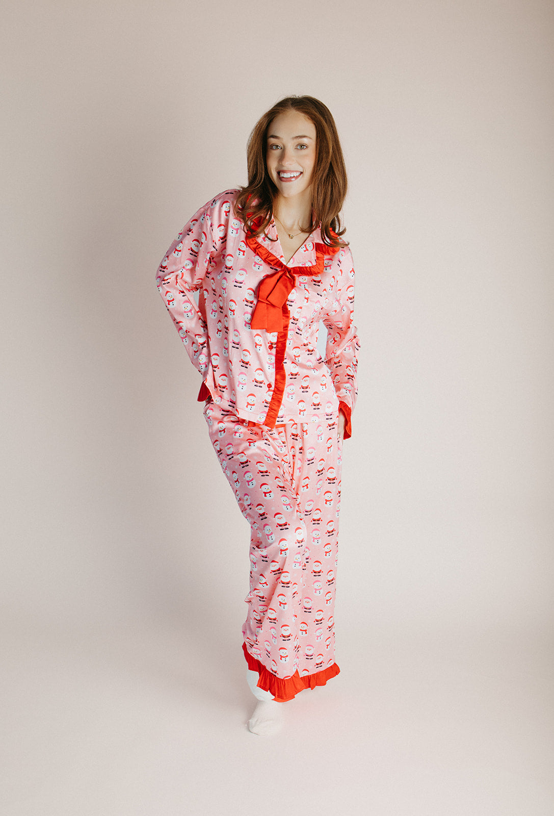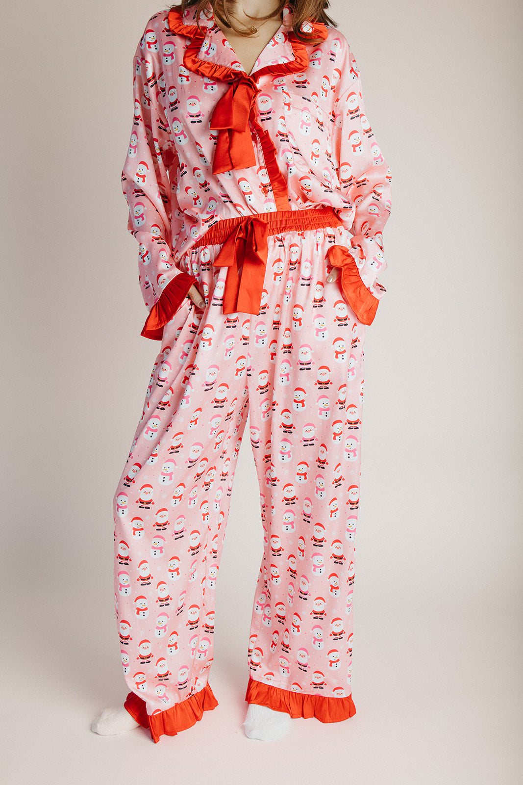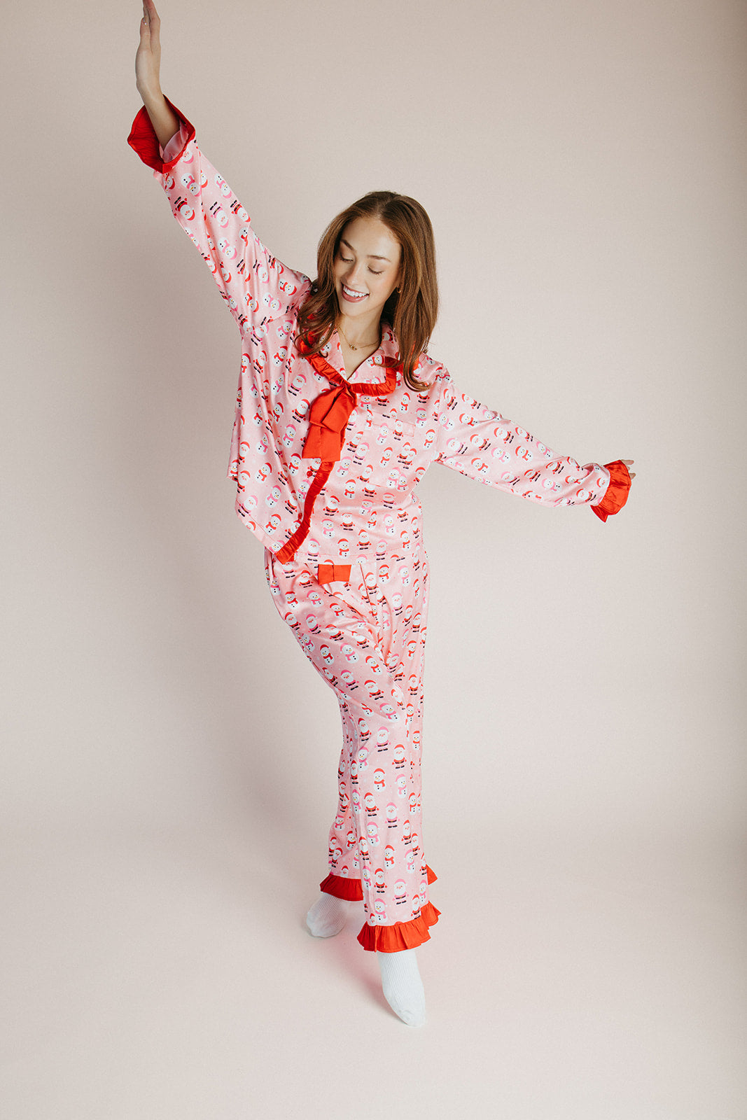 Wrap yourself in holiday cheer with this festive pajama set featuring cheerful pink and red hues. The charming ruffle details add a playful touch perfect for cozy nights in or festive family gatherings. Soft, comfortable fabric keeps you snug through the season, while the jolly color combo spreads Christmas spirit from bedroom to breakfast table. Ideal for holiday photos, gift-giving, or treating yourself to seasonal comfort that's as fun as it is functional.