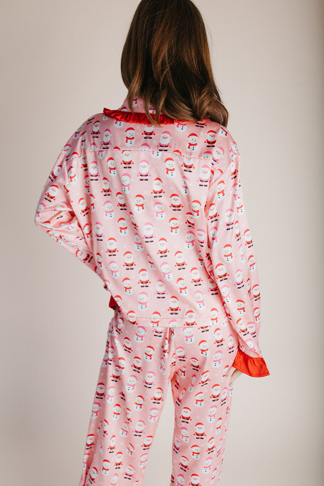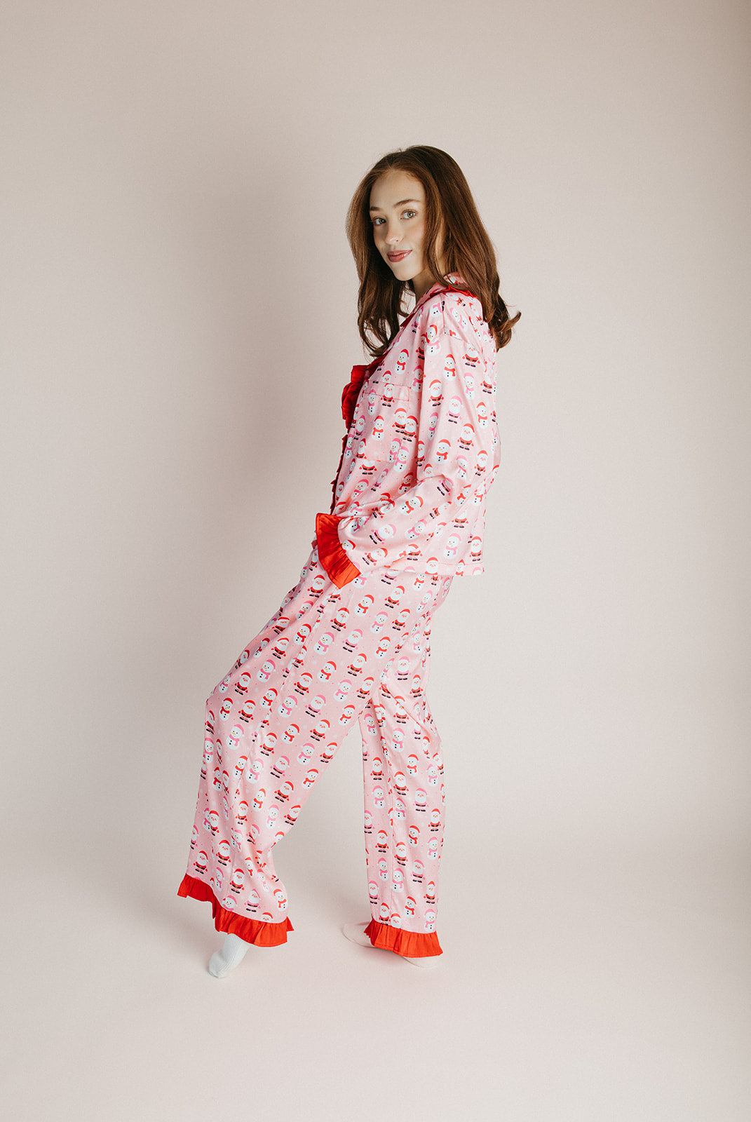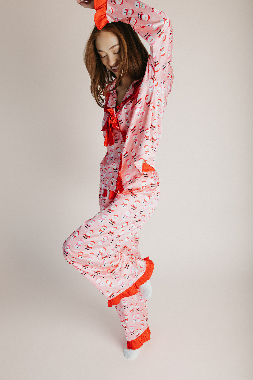 Wrap yourself in holiday cheer with this festive pajama set featuring cheerful pink and red hues. The charming ruffle details add a playful touch perfect for cozy nights in or festive family gatherings. Soft, comfortable fabric keeps you snug through the season, while the jolly color combo spreads Christmas spirit from bedroom to breakfast table. Ideal for holiday photos, gift-giving, or treating yourself to seasonal comfort that's as fun as it is functional.