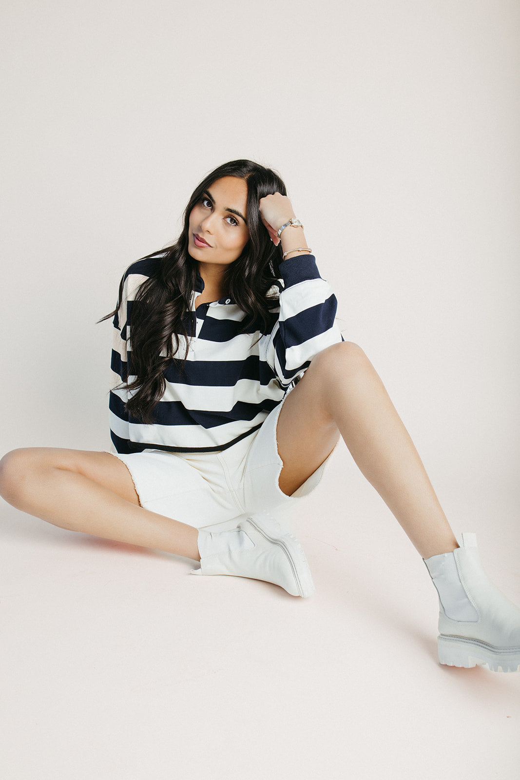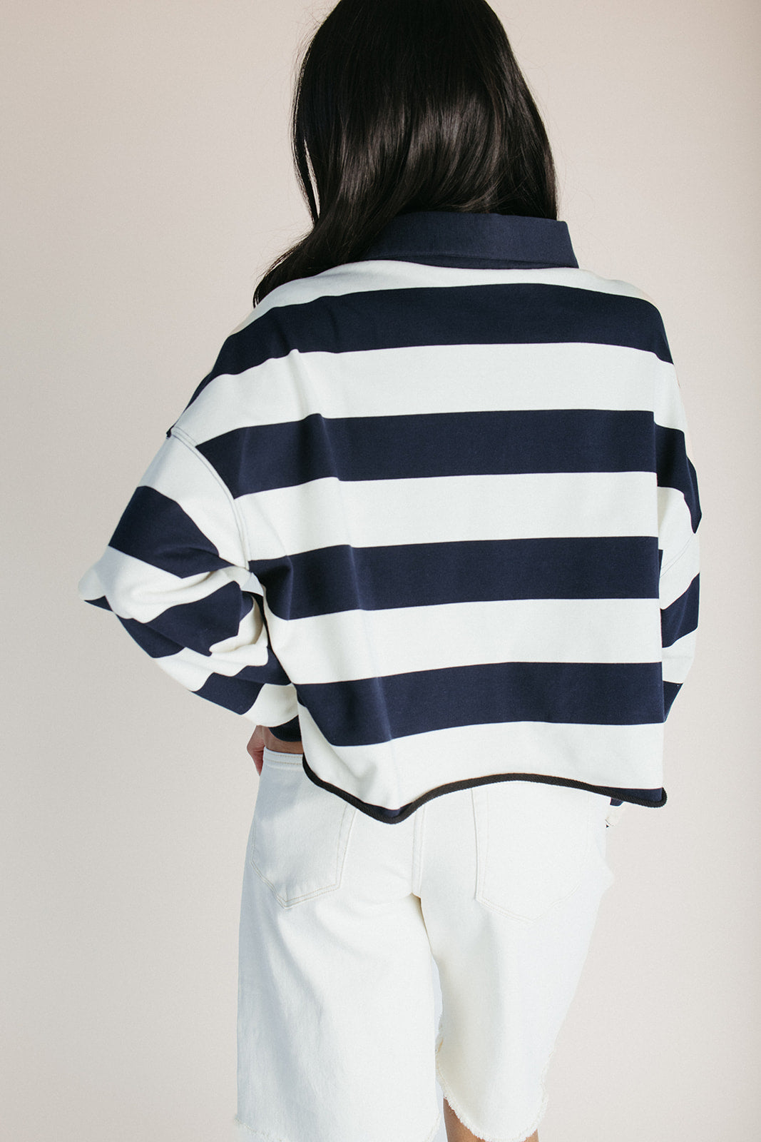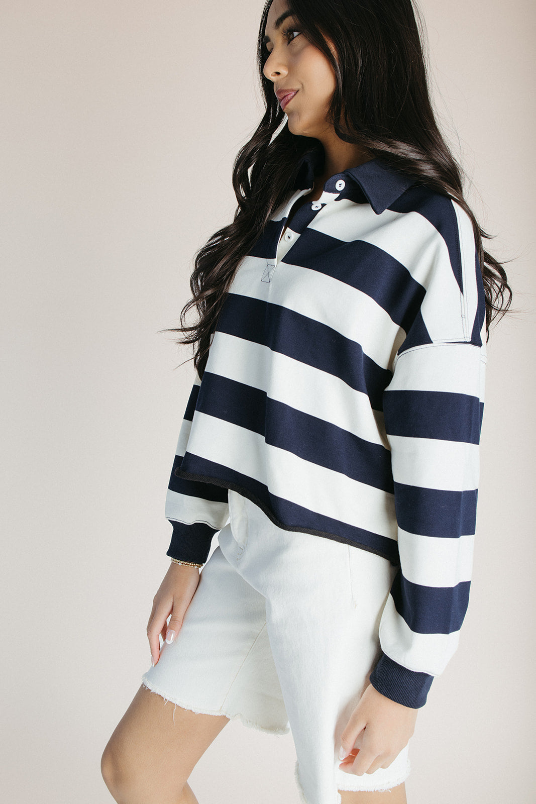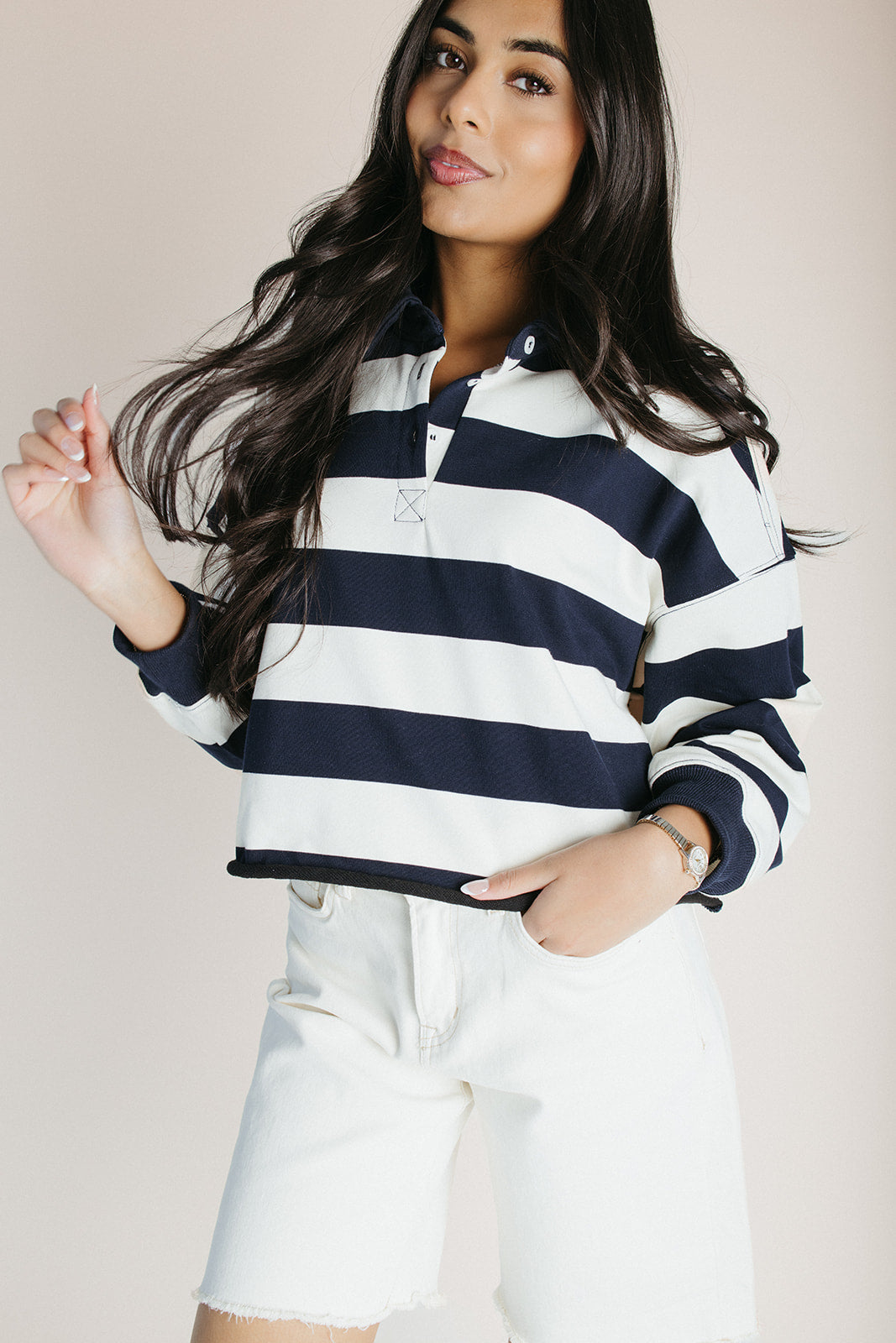 Add fun to your wardrobe with the Kenra Rugby Polo Blouse! This stylish top comes in classic navy and white colors and features a unique, playful design. This blouse will keep you comfortable and chic all day long.