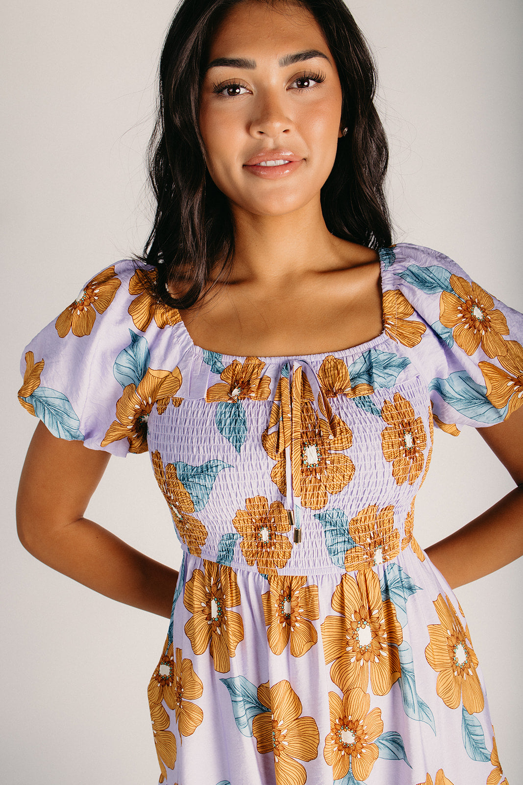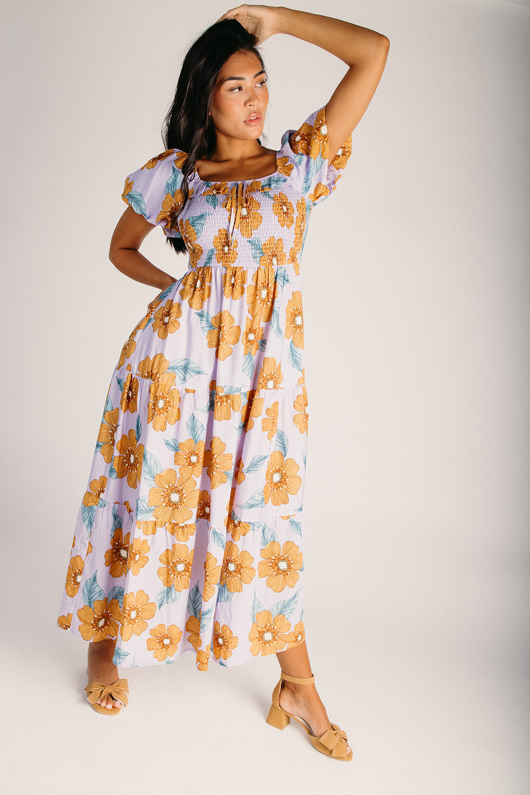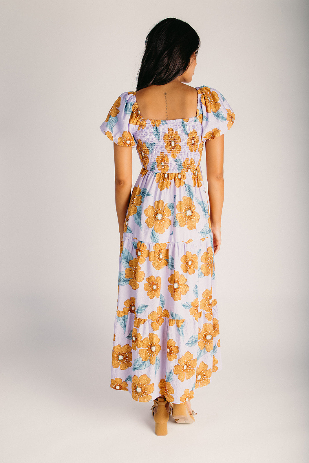 The Bonham Puff Sleeve Midi Dress in Orange + Lilac