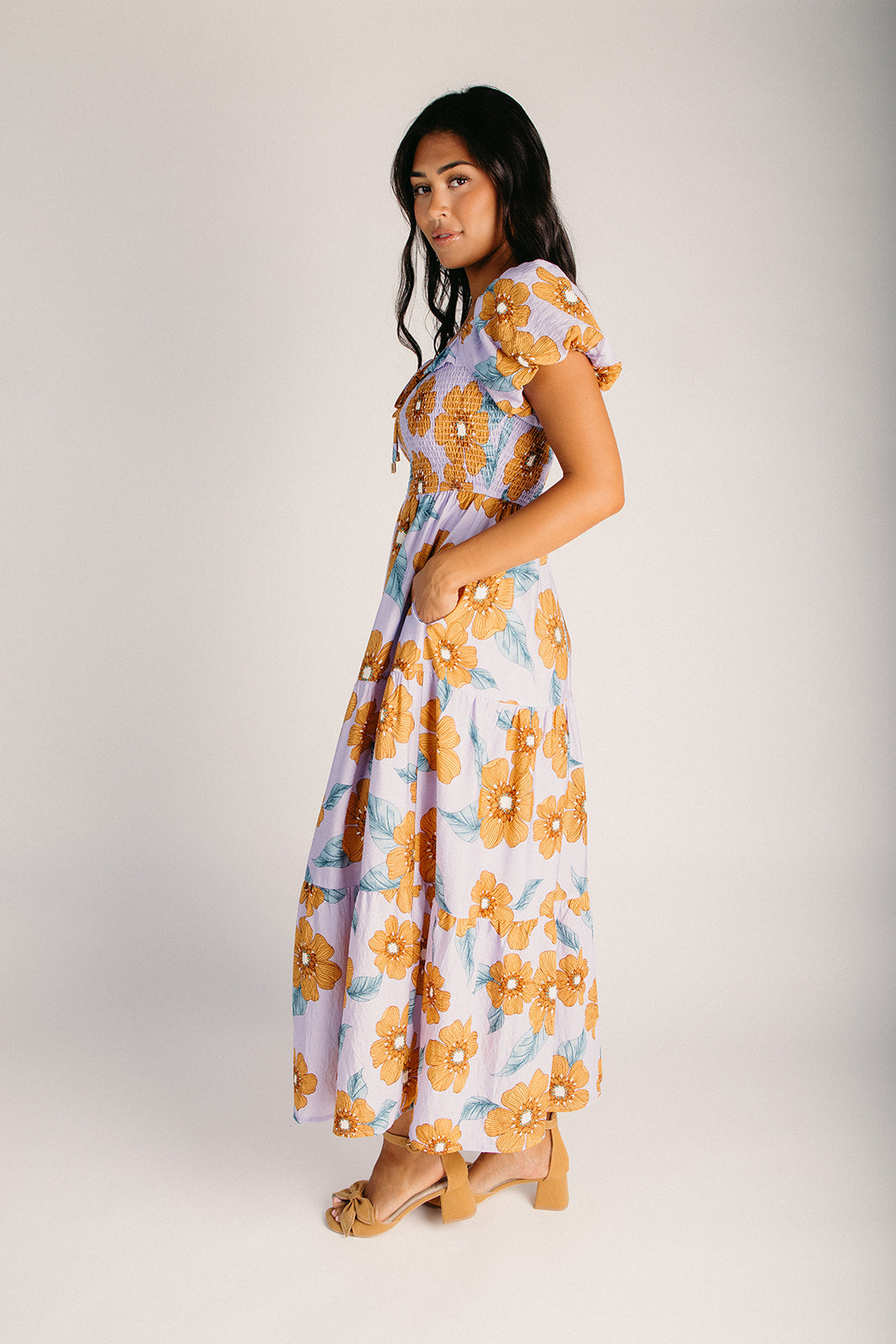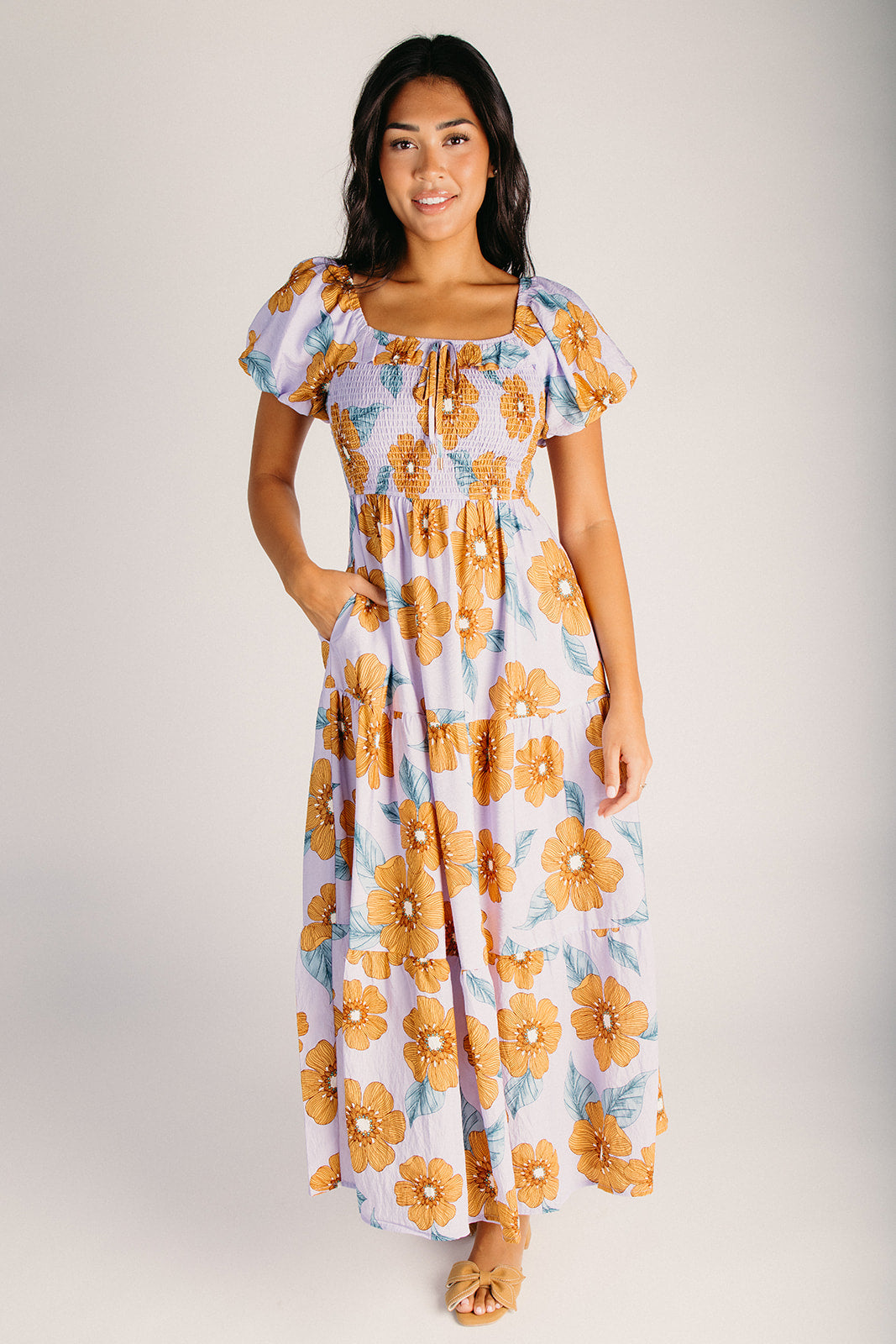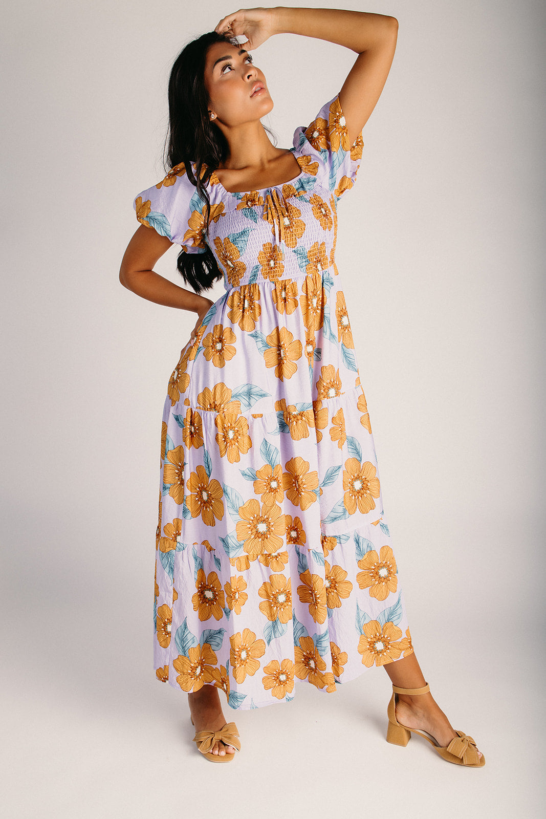 The Bonham Puff Sleeve Midi Dress in Orange + Lilac
