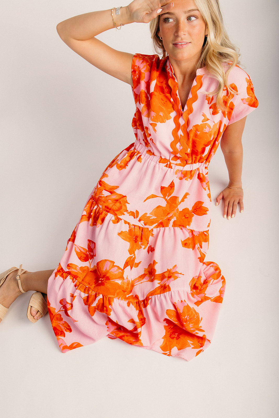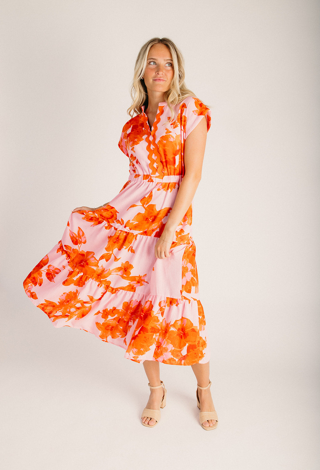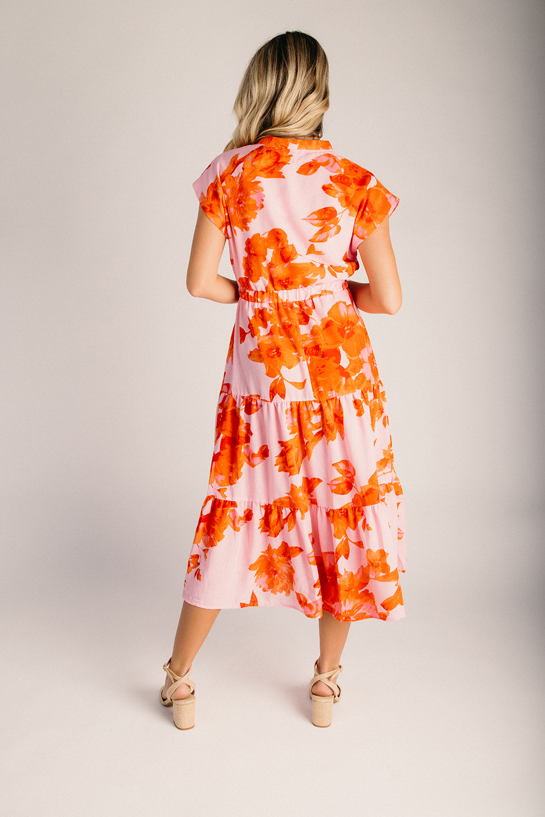 The Colvard Tiered Floral Midi Dress in Pink + Red Multi
