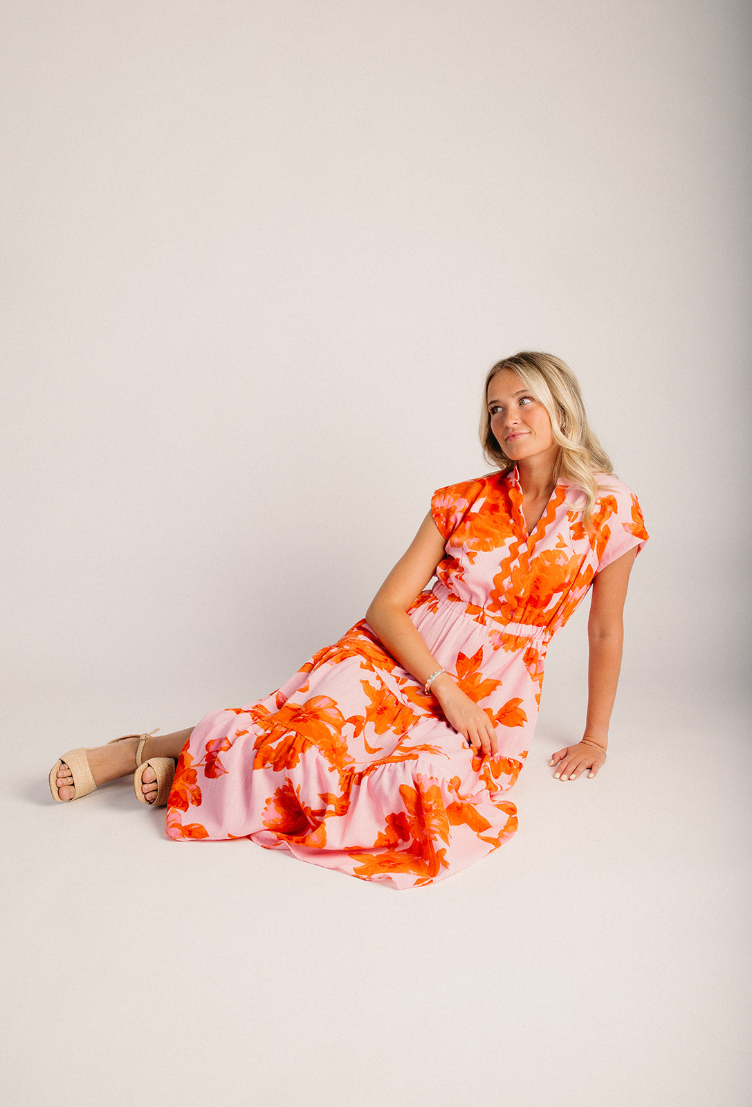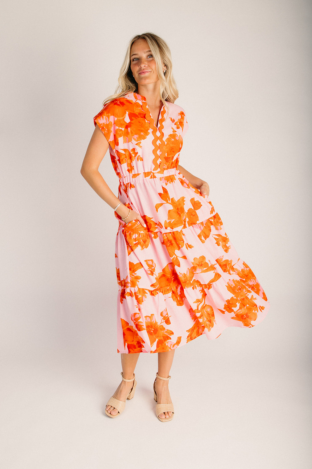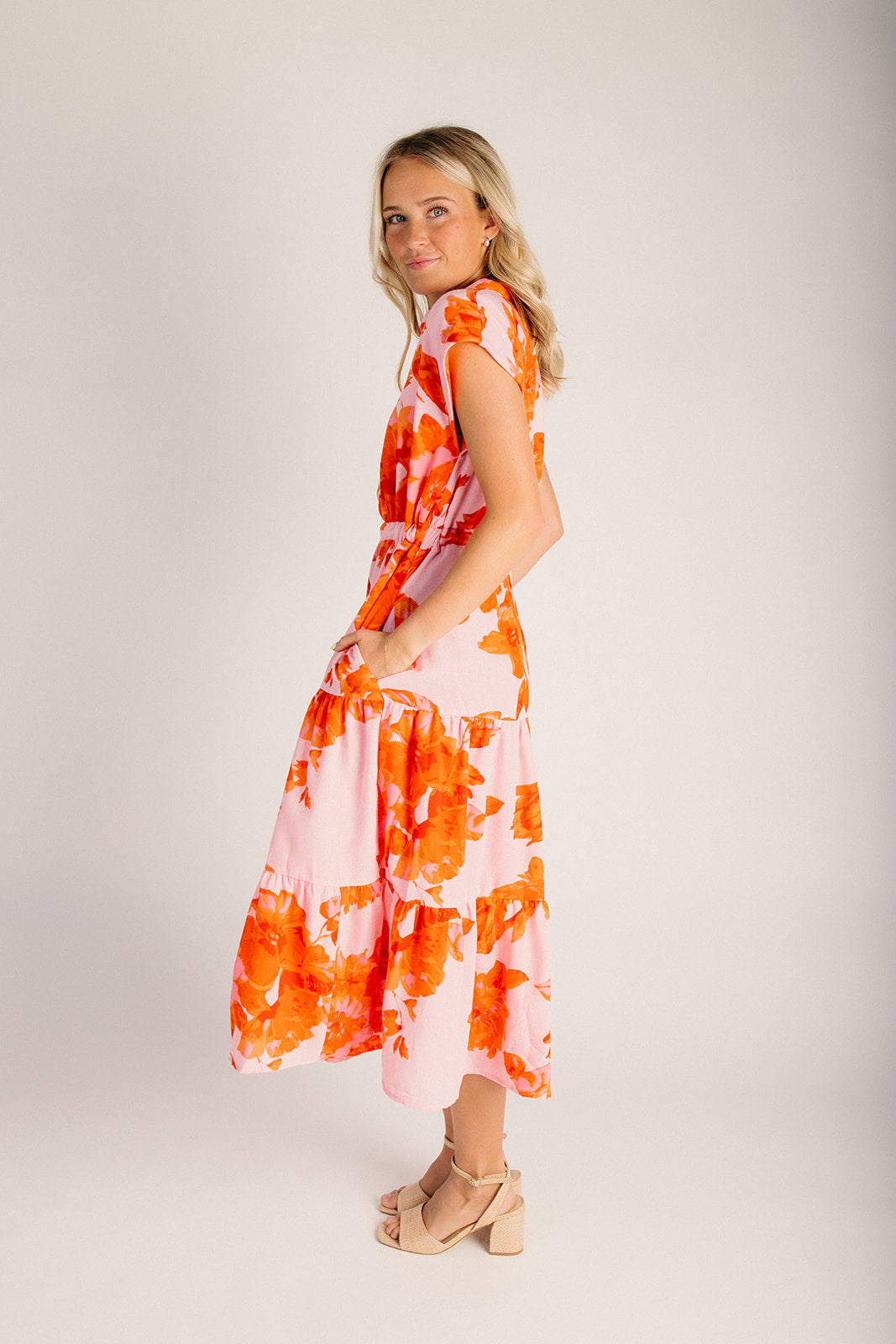 The Colvard Tiered Floral Midi Dress in Pink + Red Multi