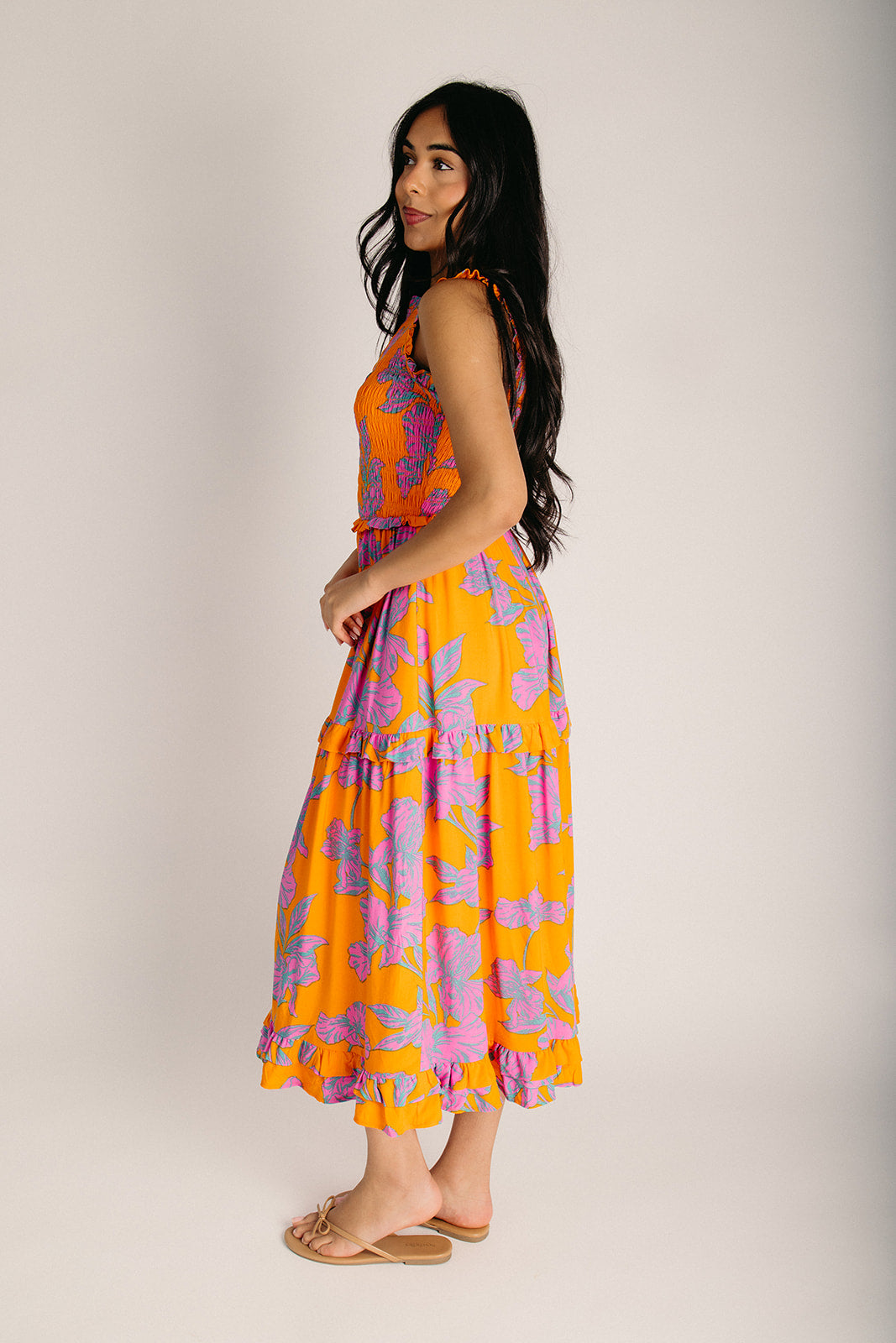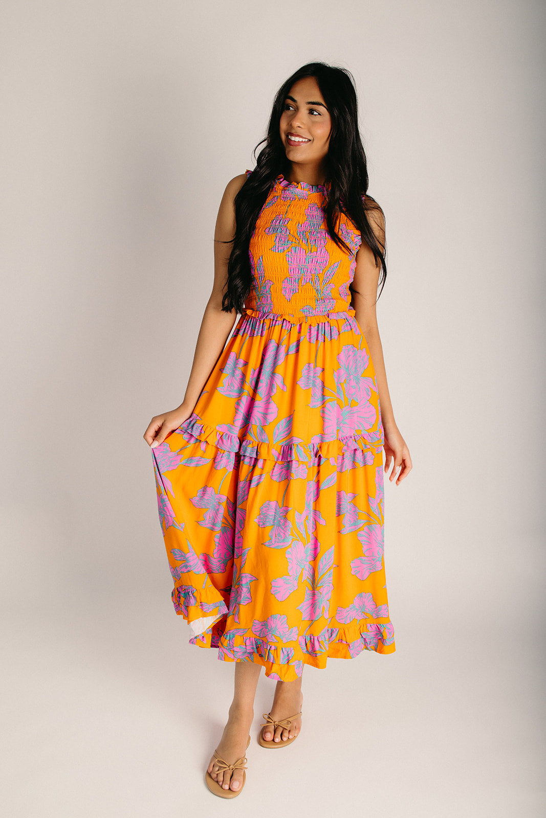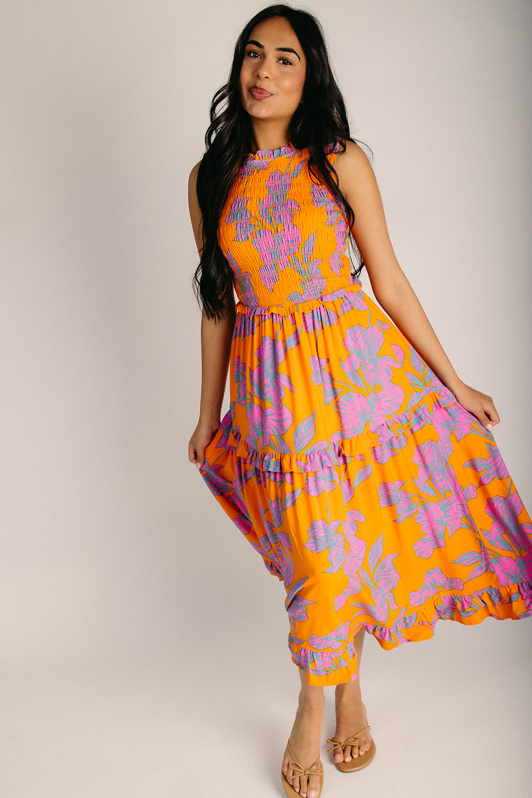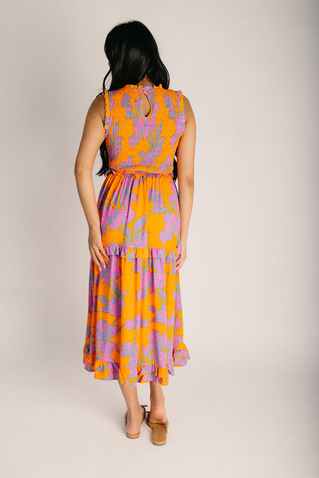 The Kathia Smocked Floral Midi Dress in Orange + Pink