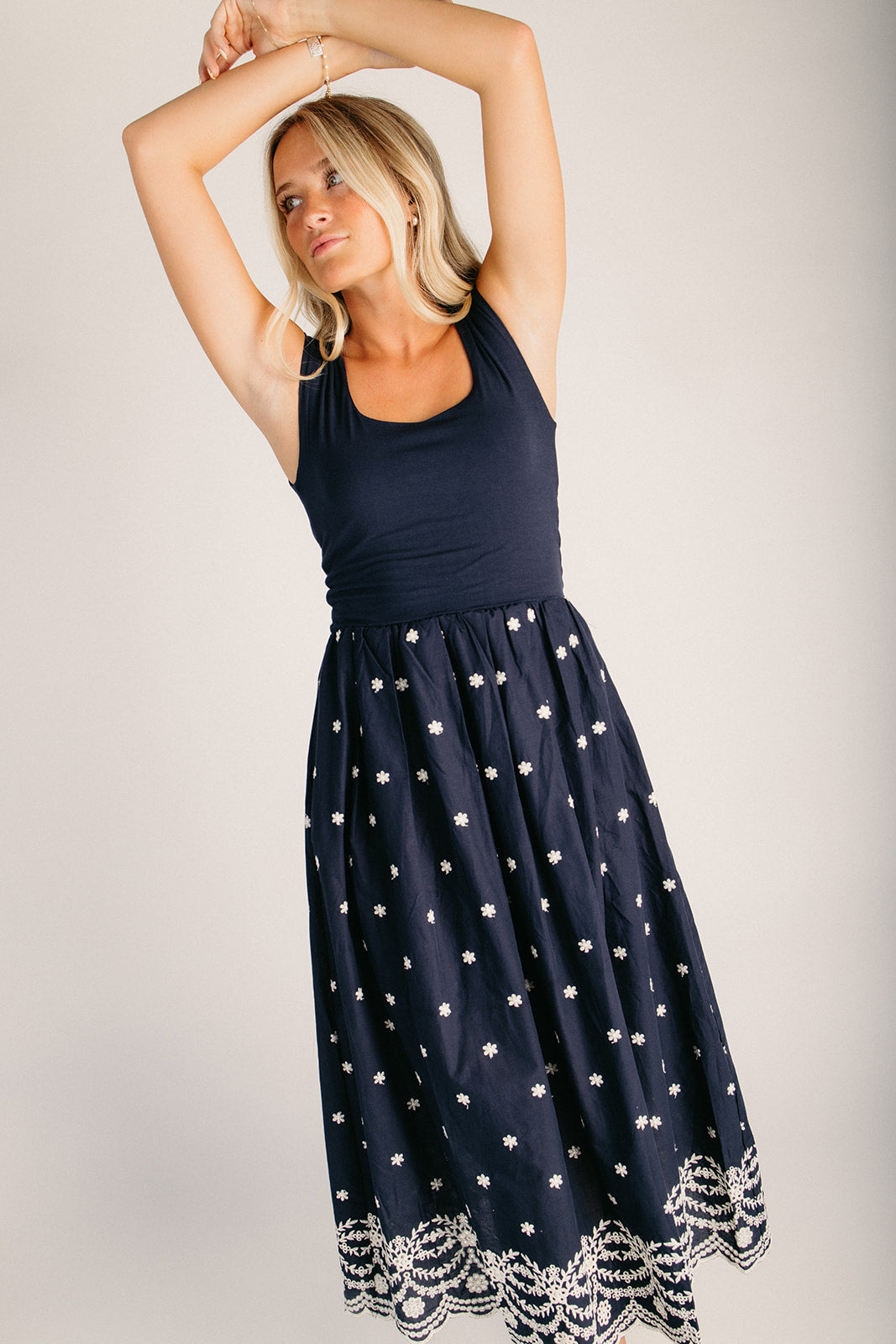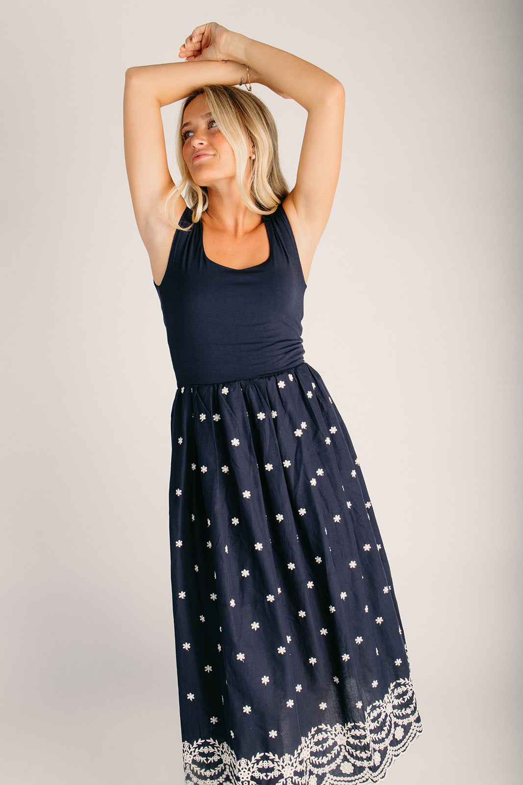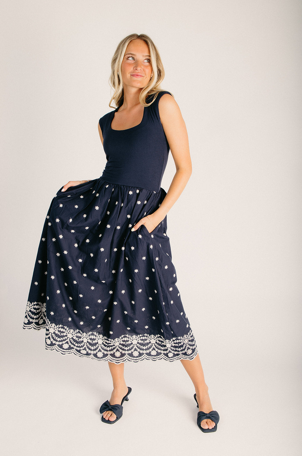 The Wiggins Scoop Neck Embroidered Dress in Navy is your new go-to for effortless style. This charming dress features delicate embroidery details and a flattering scoop neckline that works for everything from brunch dates to casual Fridays. The relaxed fit skims your silhouette beautifully without clinging, while the classic navy hue pairs with practically everything in your closet. Whether you're dressing it up with heels or keeping it casual with sneakers, this dress delivers all-day comfort with a touch of personality.