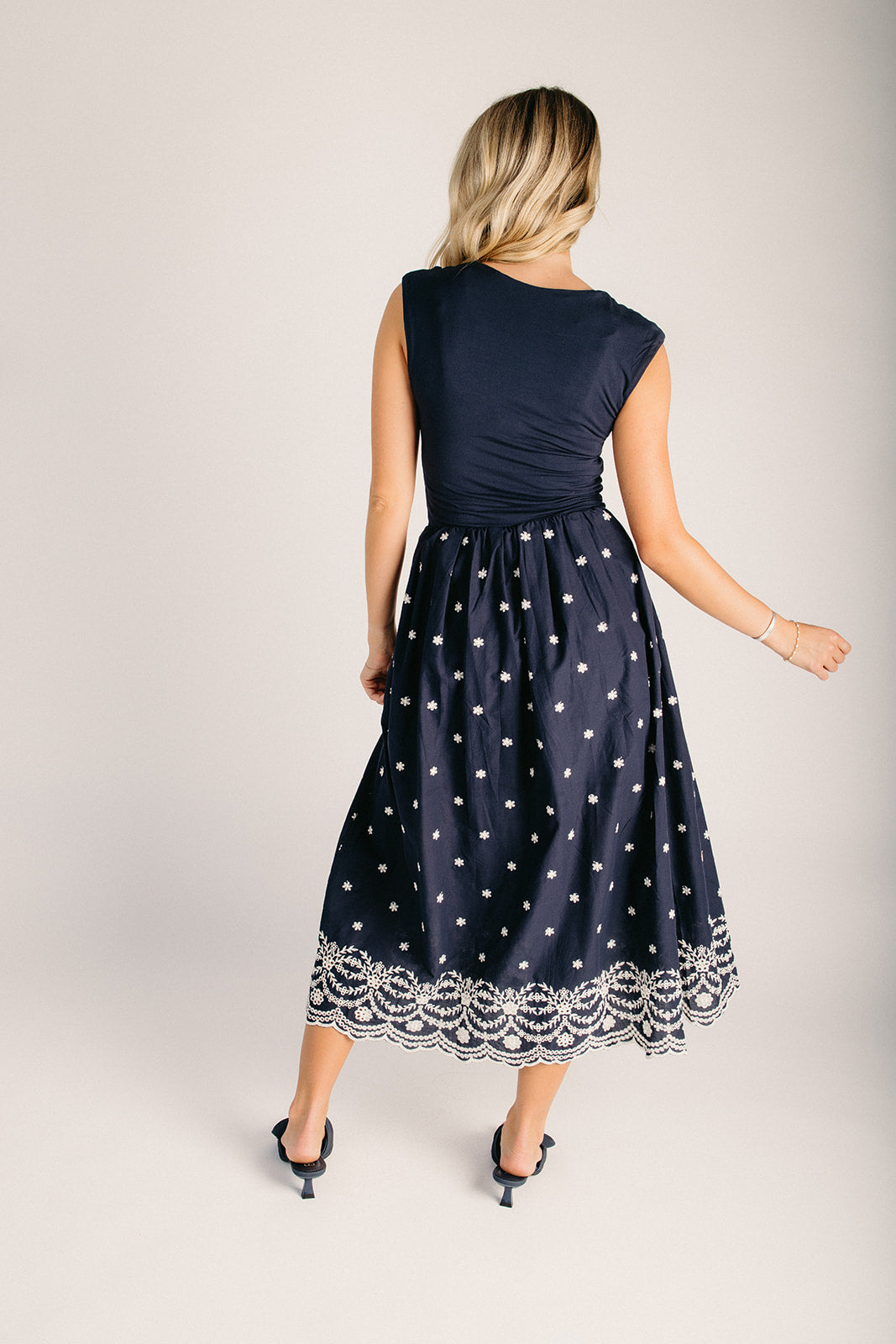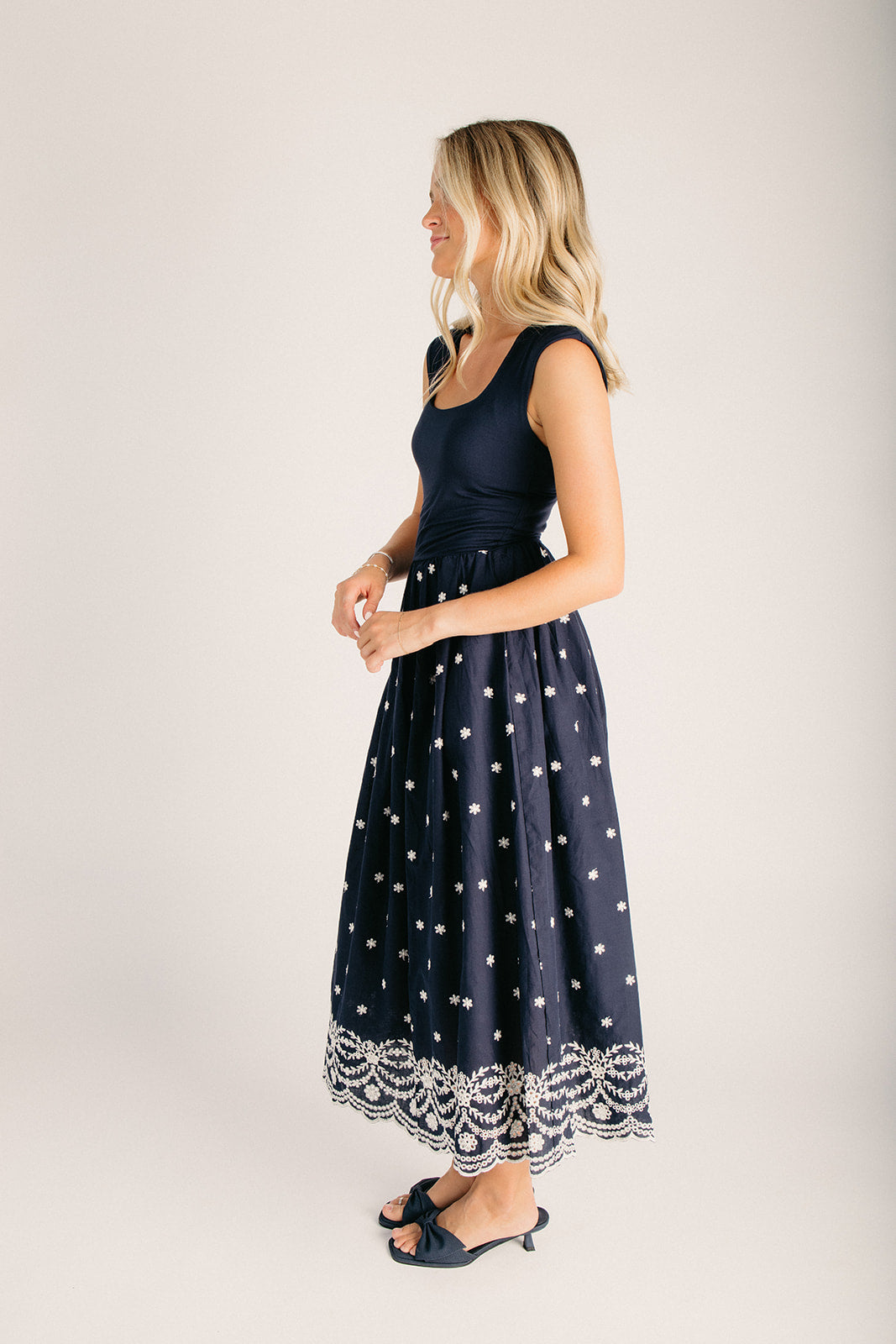 The Wiggins Scoop Neck Embroidered Dress in Navy