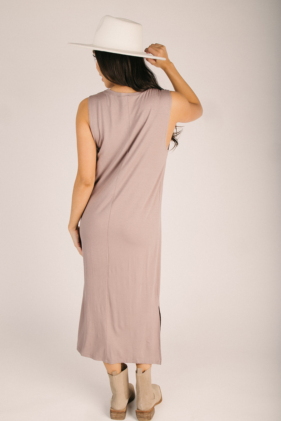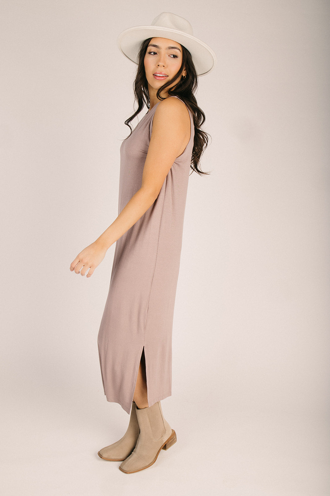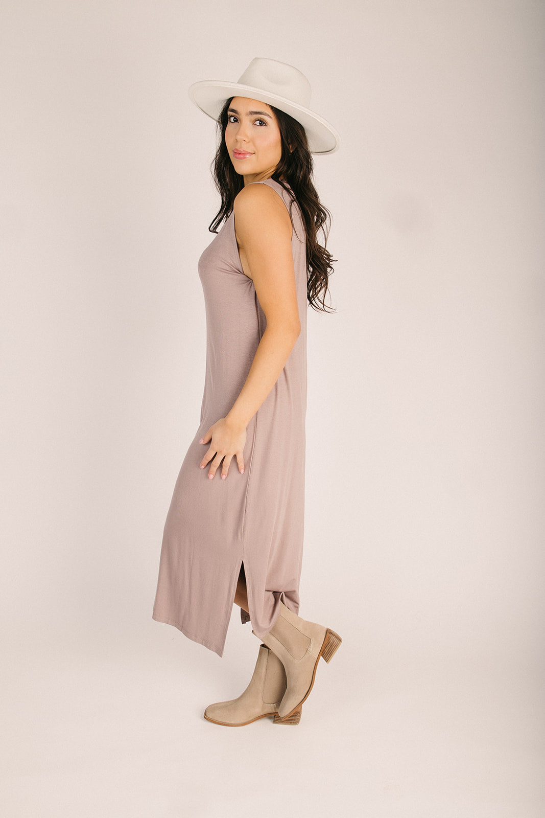 Slip into effortless elegance with this dreamy knit maxi tank dress. The soft taupe hue pairs with everything in your closet, while the sleek tank silhouette keeps things cool and comfortable. Perfect for lazy days that deserve a little polish, or nights out when you want to look put-together without trying too hard. Layer it, style it solo, or throw it over your favorite tee—this versatile piece is your new go-to for looking casually chic.