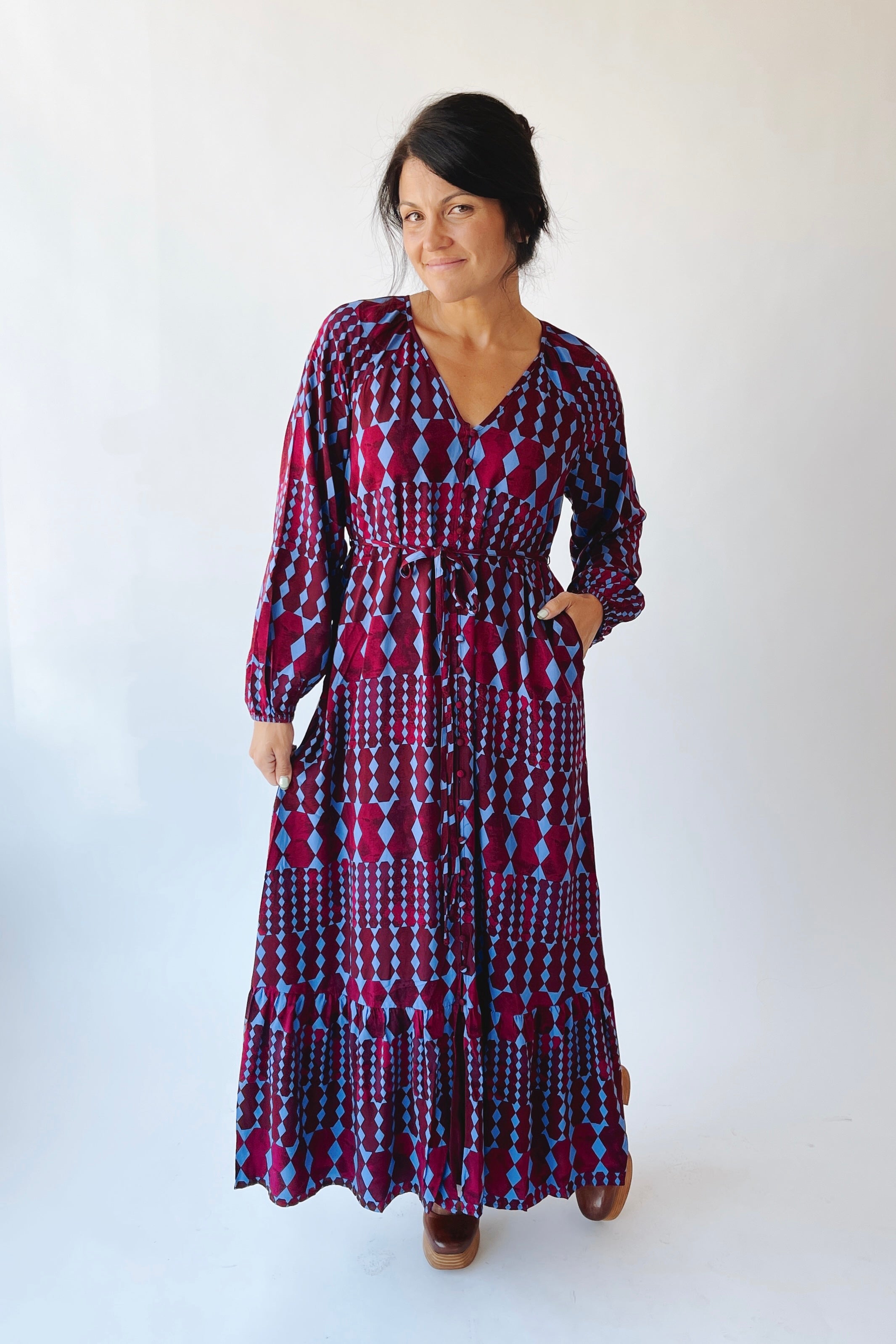 The Michelle V-Neck Patterned Dress in Burgundy + Blue