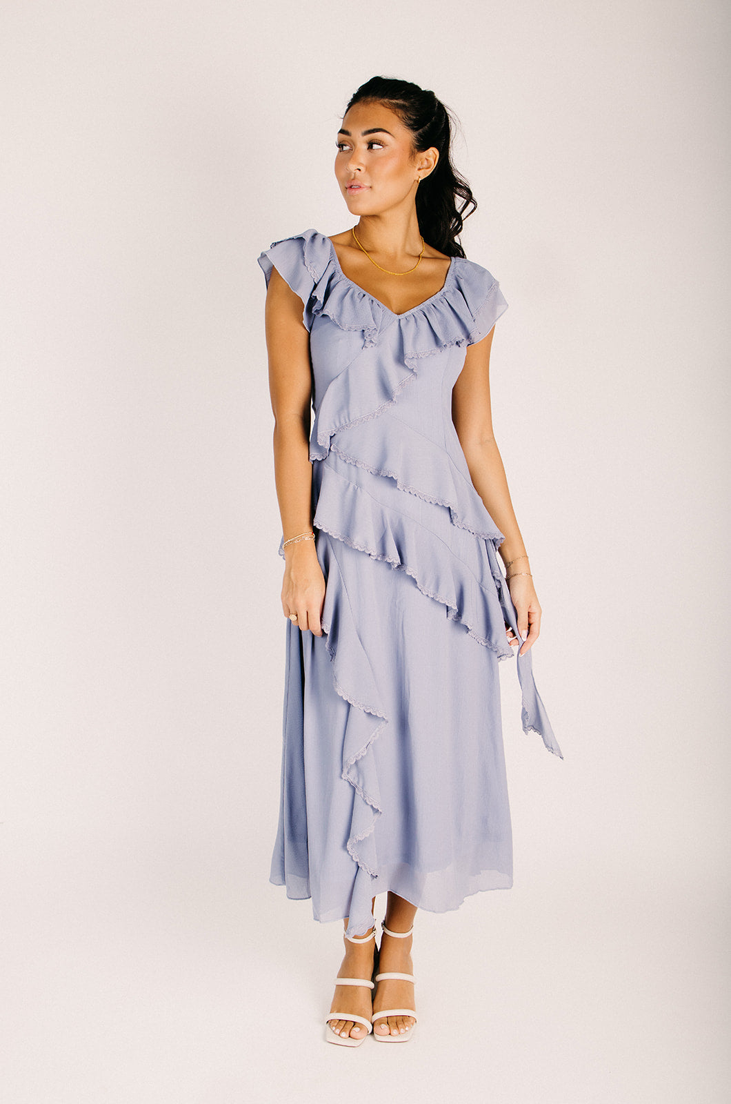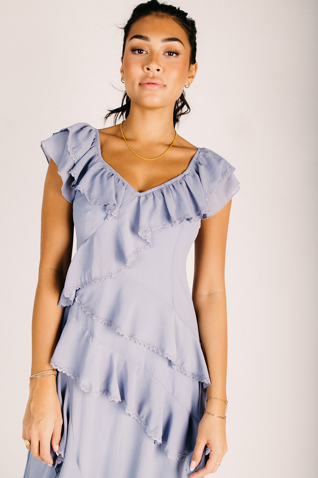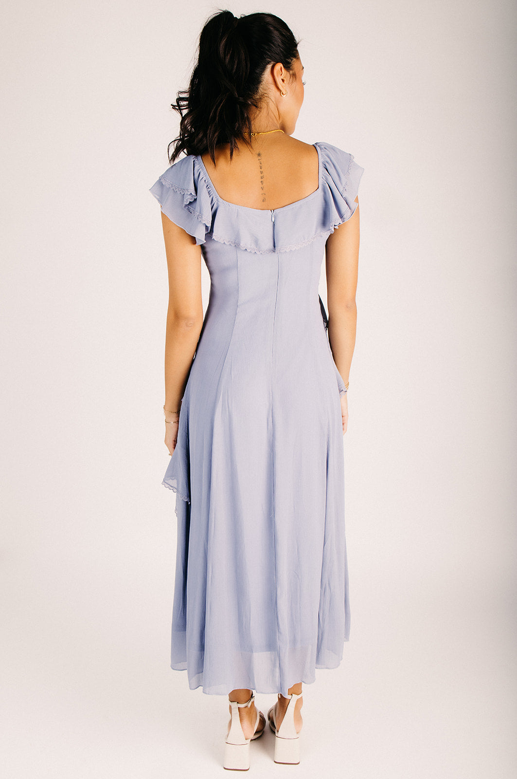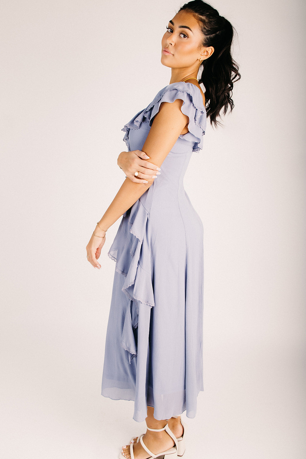 The Tenorio Ruffle Detail Maxi Dress in Dusty Blue