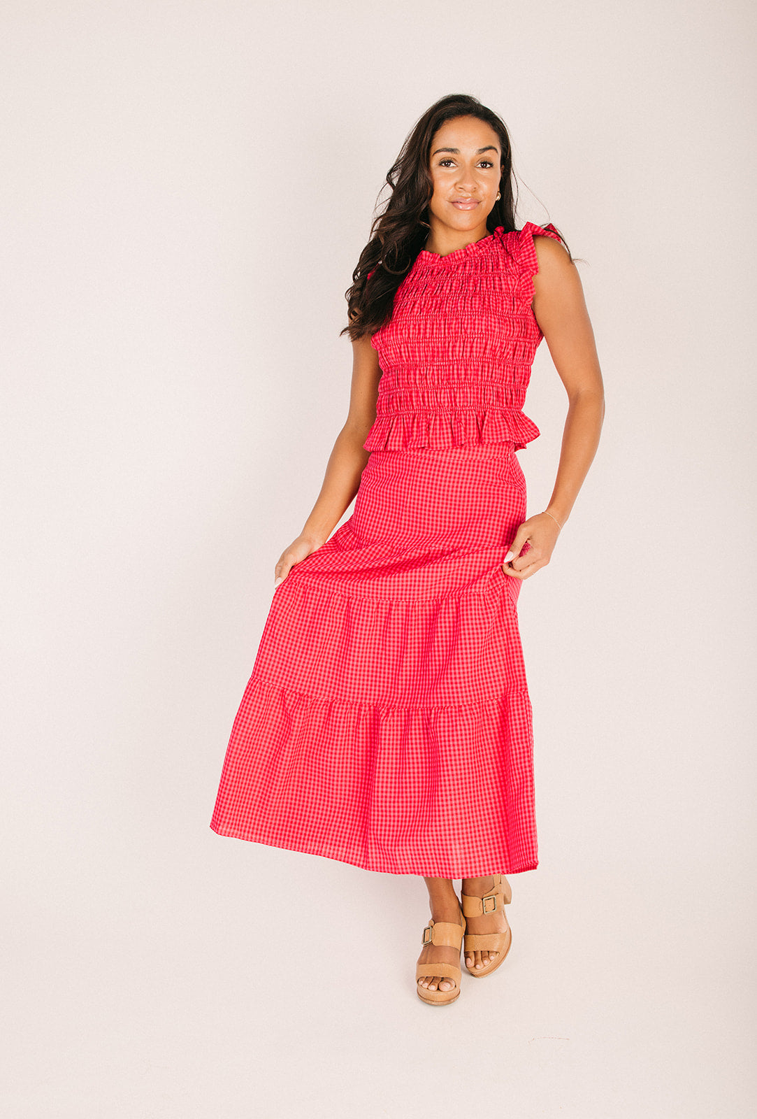 The Warnick Gingham Smocked Tank in Red is your new go-to for effortless summer style. This charming tank features a classic red gingham pattern with delicate smocking details that add texture and visual interest. The relaxed fit keeps you comfortable all day long, while the timeless design pairs perfectly with everything from denim to linen pants. Whether you're heading to brunch or running errands, this versatile piece brings a pop of color and vintage-inspired charm to any casual outfit.