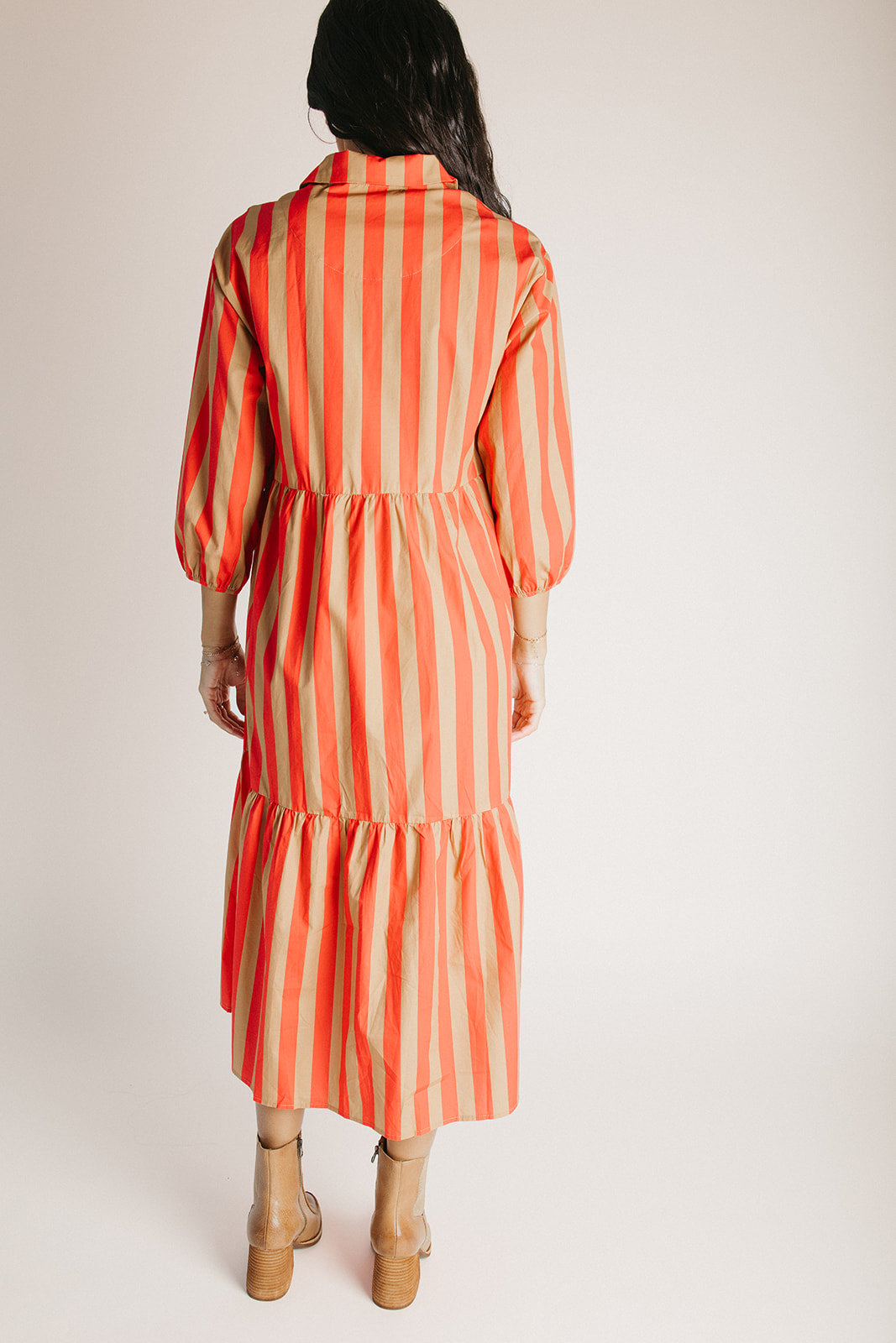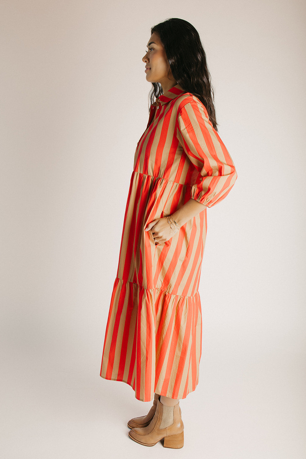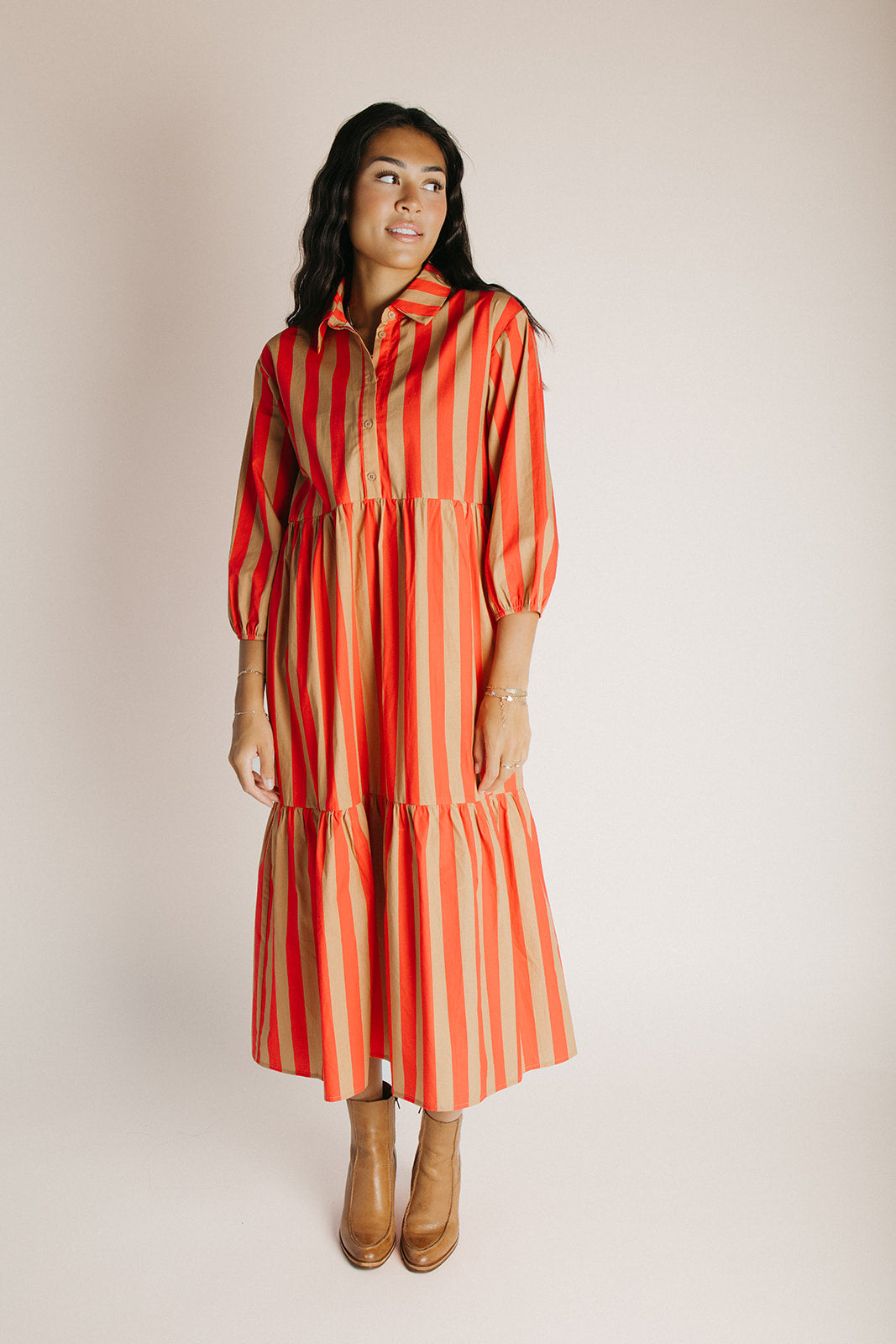 The Barton Tiered Midi Dress in Red + Taupe Stripe