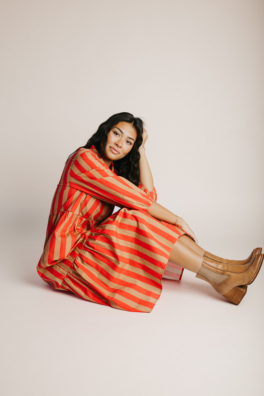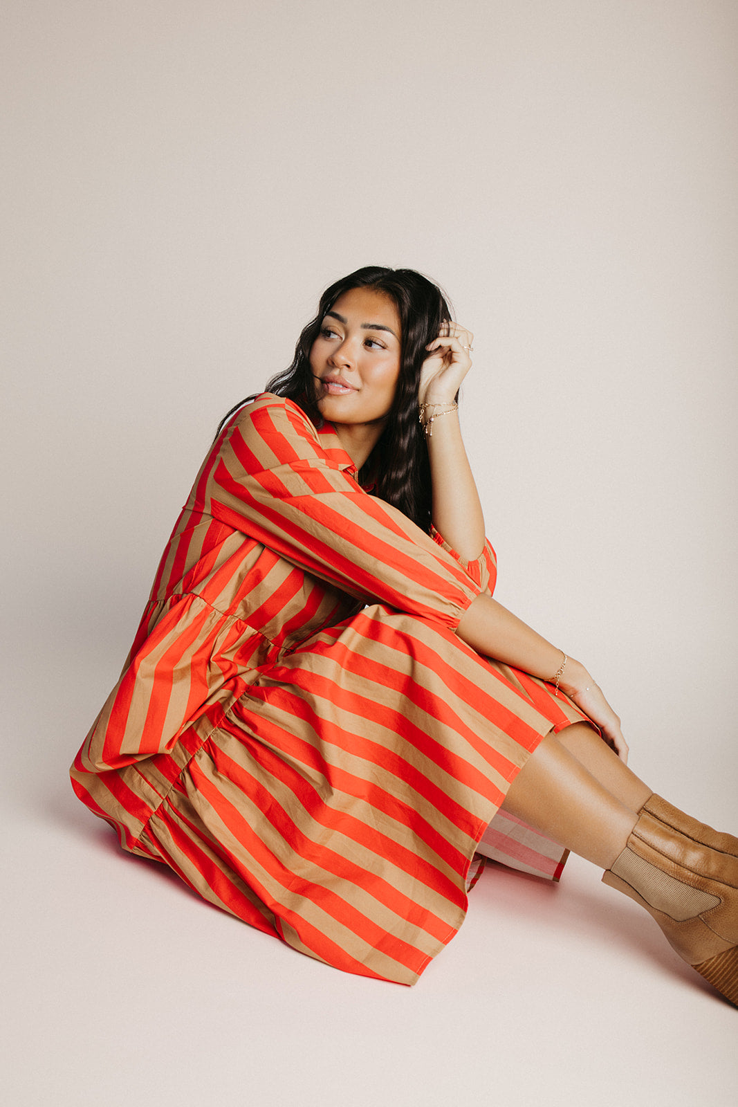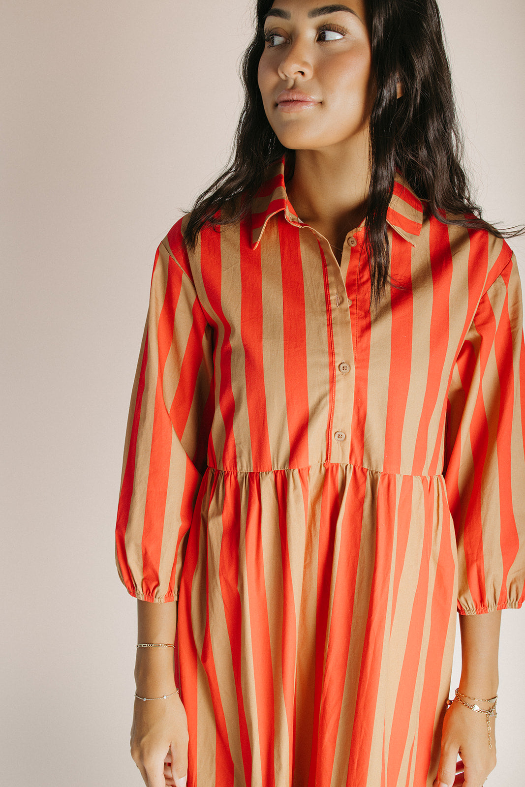 The Barton Tiered Midi Dress in Red + Taupe Stripe