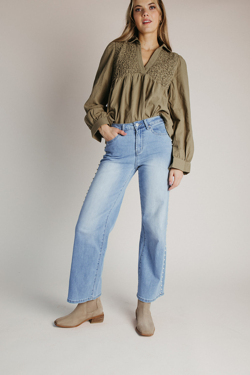 The Alder Mid Rise Wide Leg Jean in Beige Washed Denim