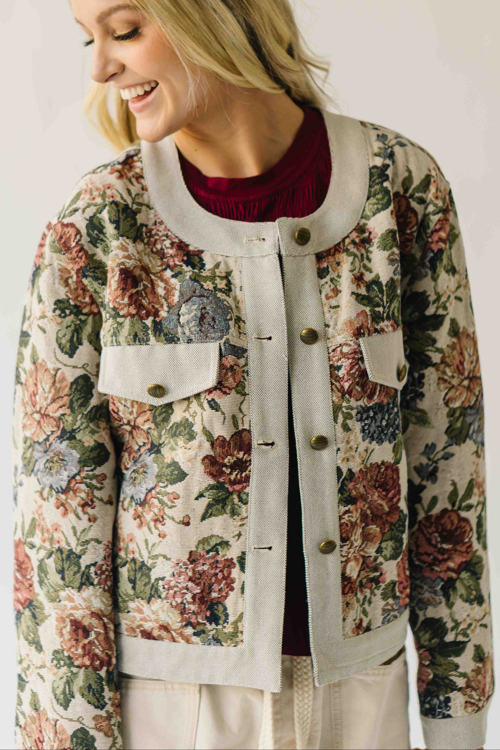 The Macey Floral Button-Up Jacquard Jacket in Stone