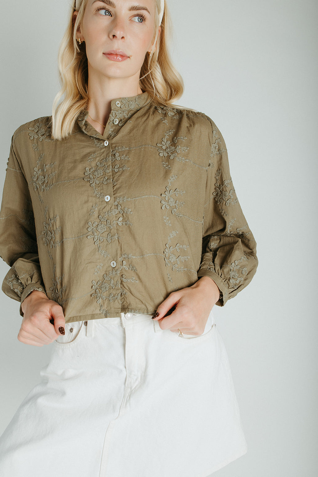 The Daniella Lace Button-Up Blouse in Olive