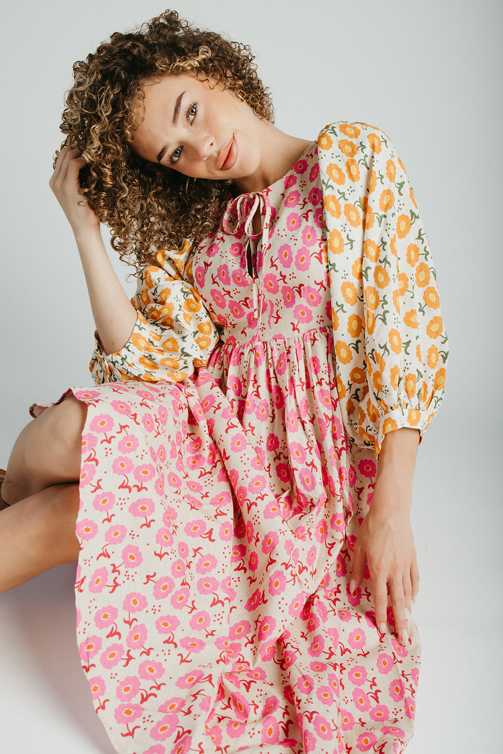 The Libby Blossom Linen Midi Dress in Pink + Orange