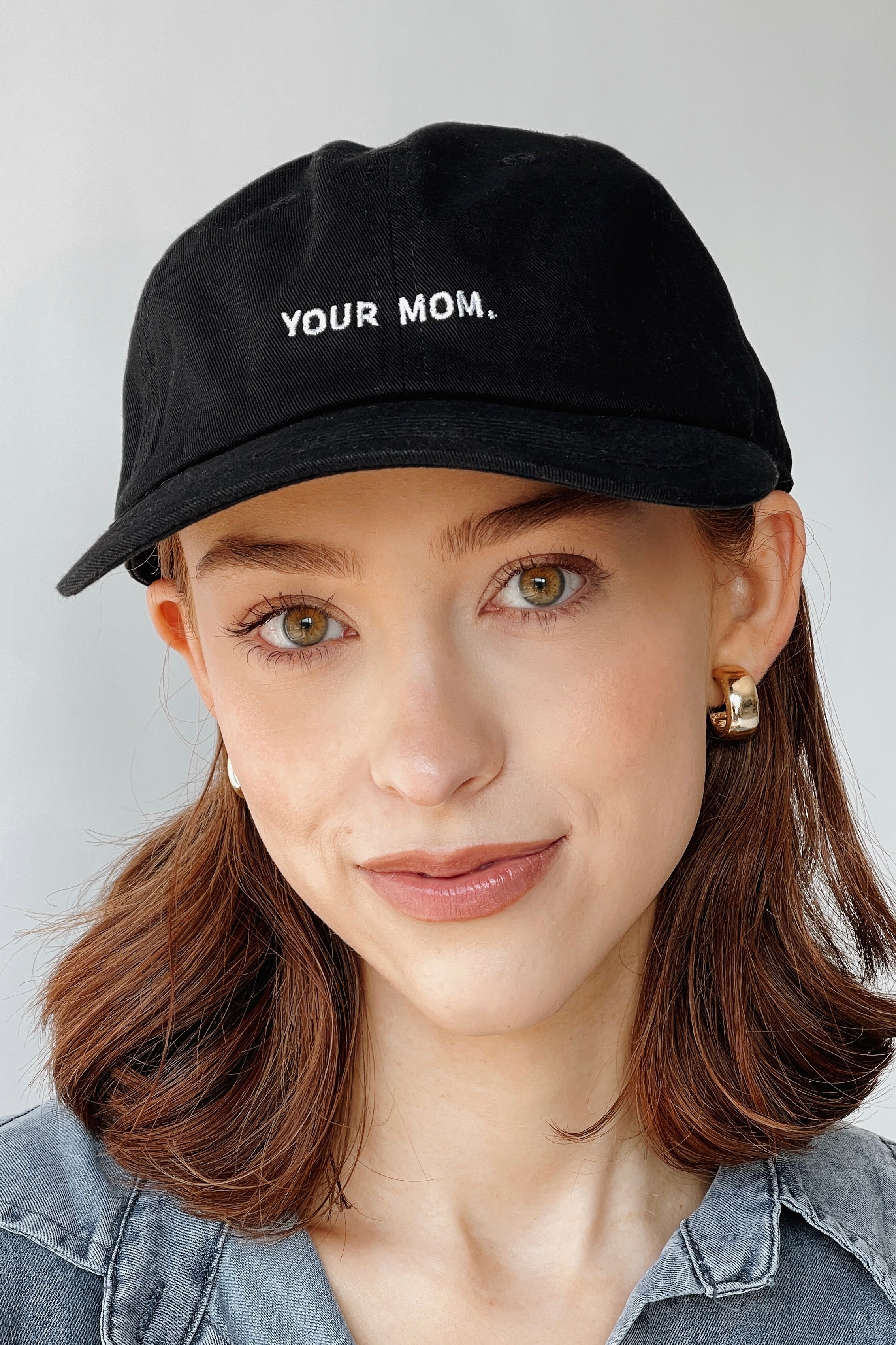 • Black 6-Panel Dad Hat • 100% Cotton • Adjustable strap • Embroidered Your Mom text • Ships worldwide