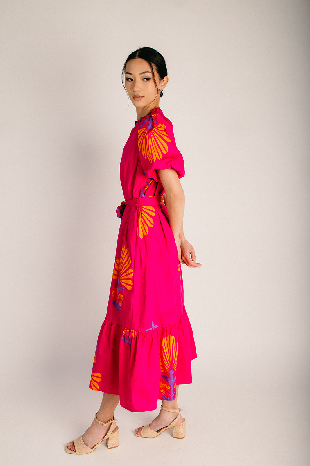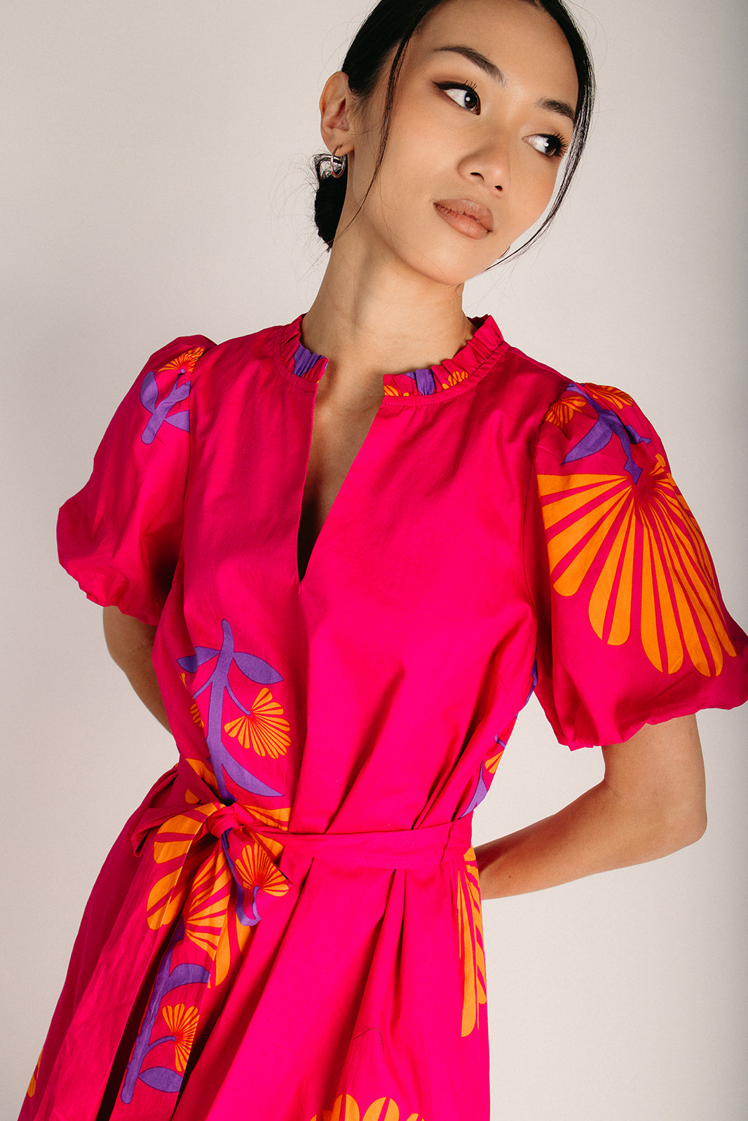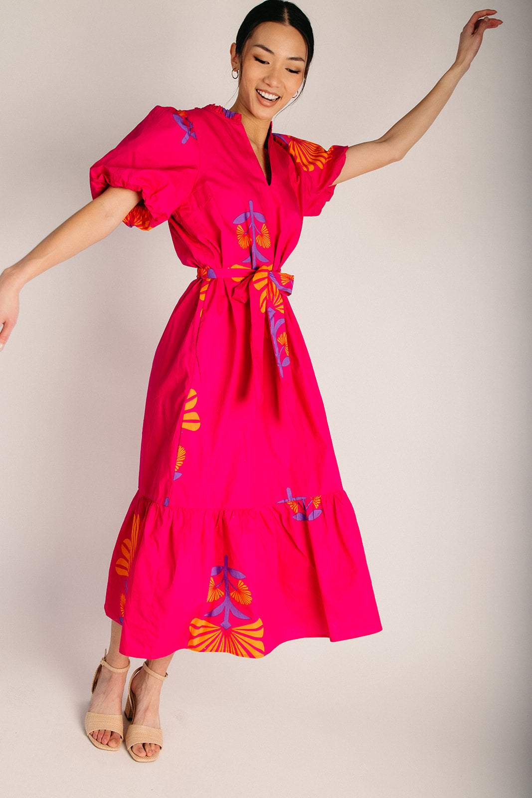 The Krane Puff Sleeve Midi Dress in Fuchsia + Orange