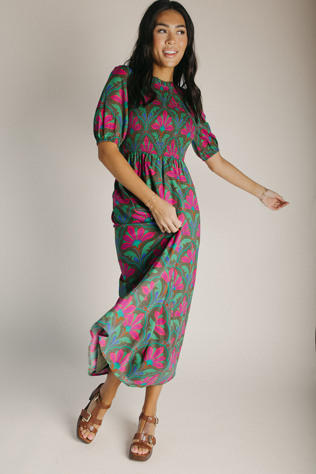 The Kristin Floral Smocked Maxi Dress in Kelly Green + Pink