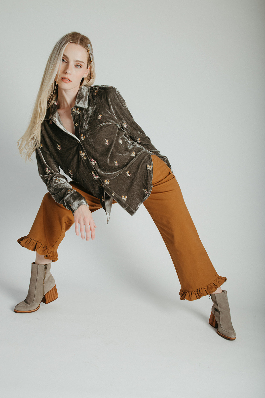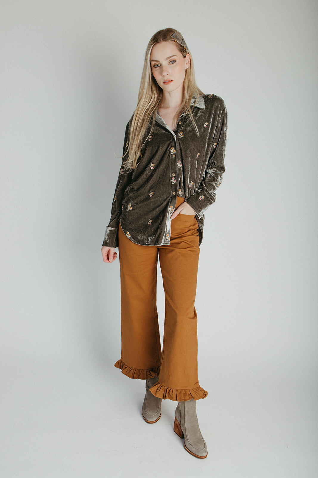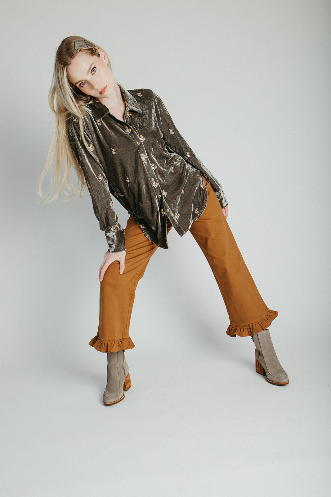 The Layna Ruffle Hem Pant in Mocha adds a fun twist to your everyday look with its playful ruffle detail at the hem. Crafted in a warm mocha shade, these pants blend comfort and style effortlessly. Perfect for dressing up or down, they bring a subtle flair that makes every step lively and lighthearted.