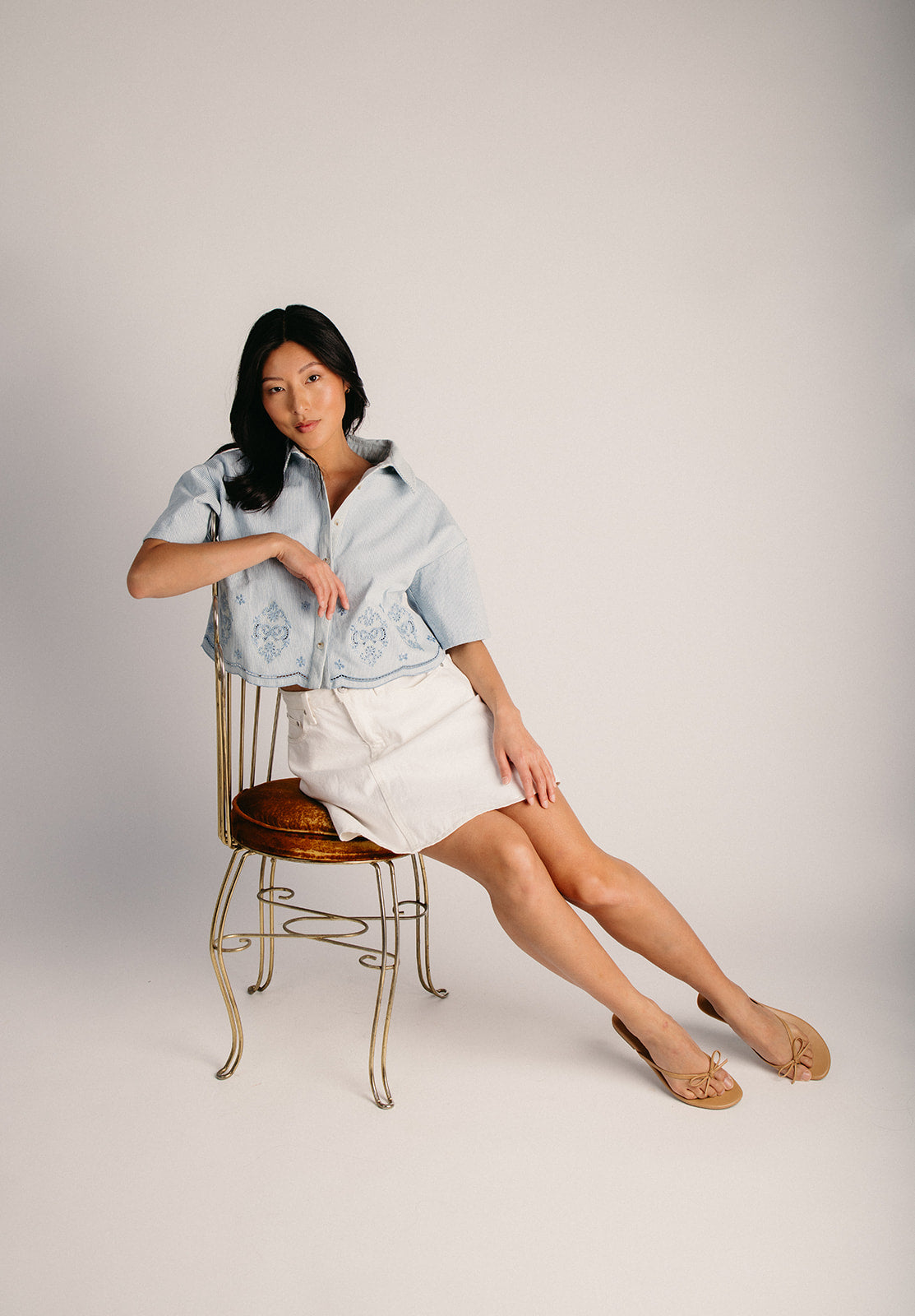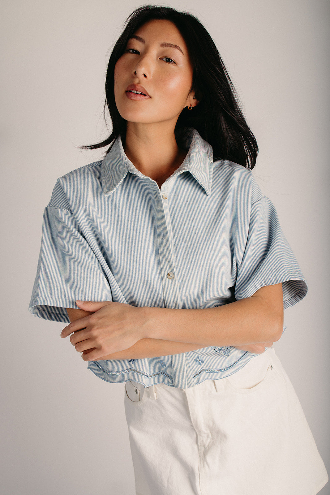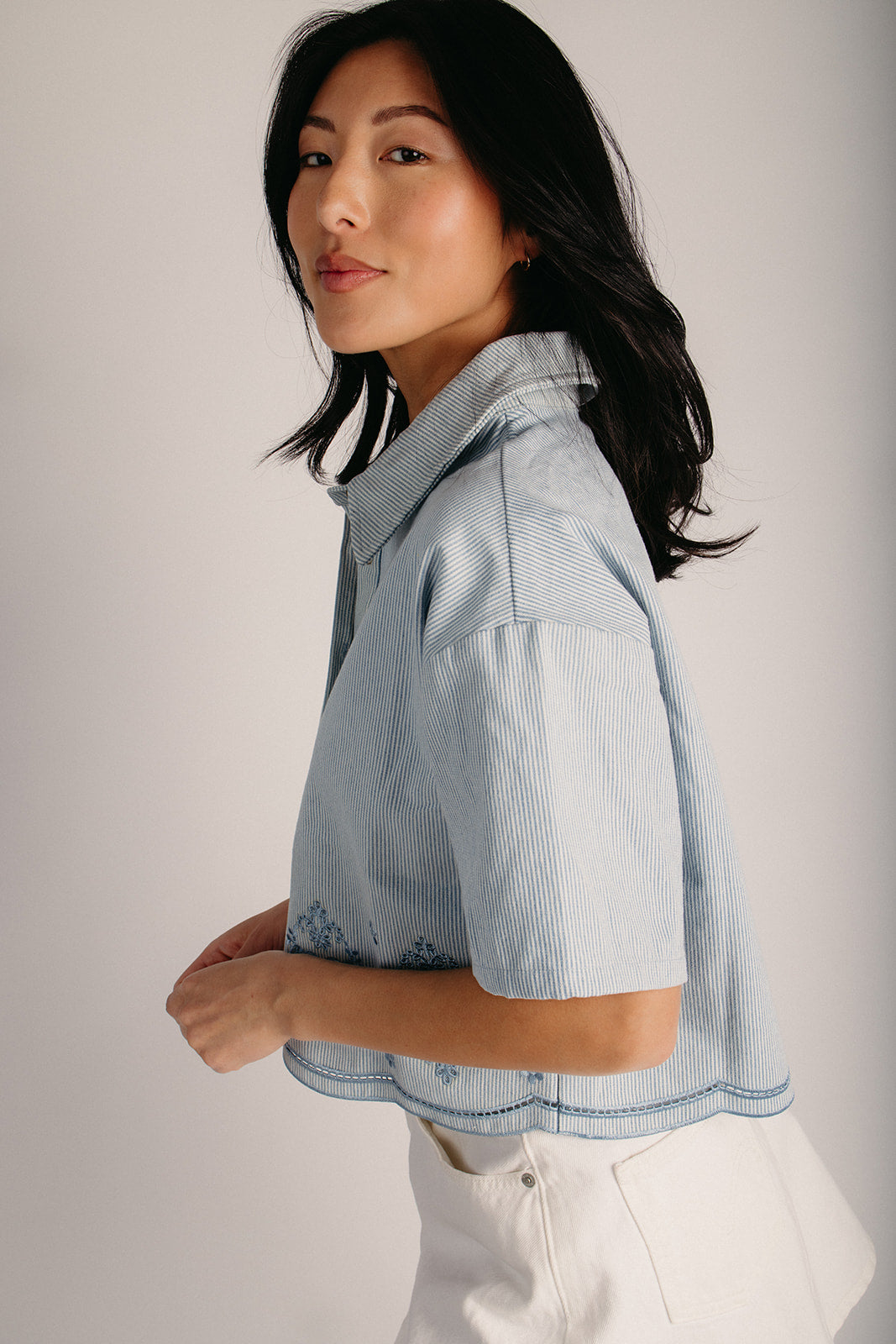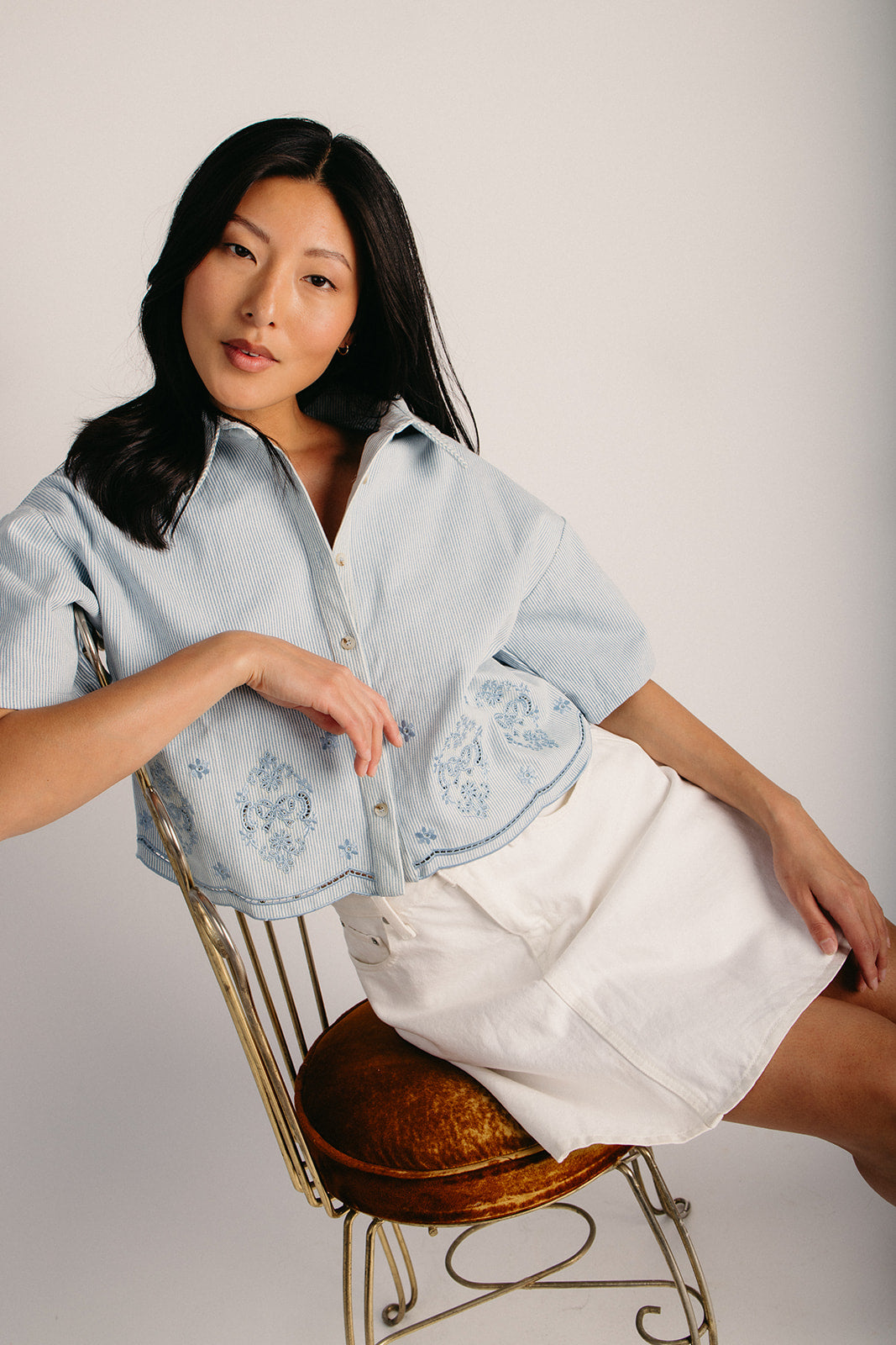 Light up your wardrobe with the Pembrook Eyelet Embroidered Blouse—a charming denim essential that's equal parts sweet and versatile. Delicate eyelet embroidery adds a playful touch to this classic light denim piece, perfect for layering or wearing solo. A timeless staple that works as hard as you do.