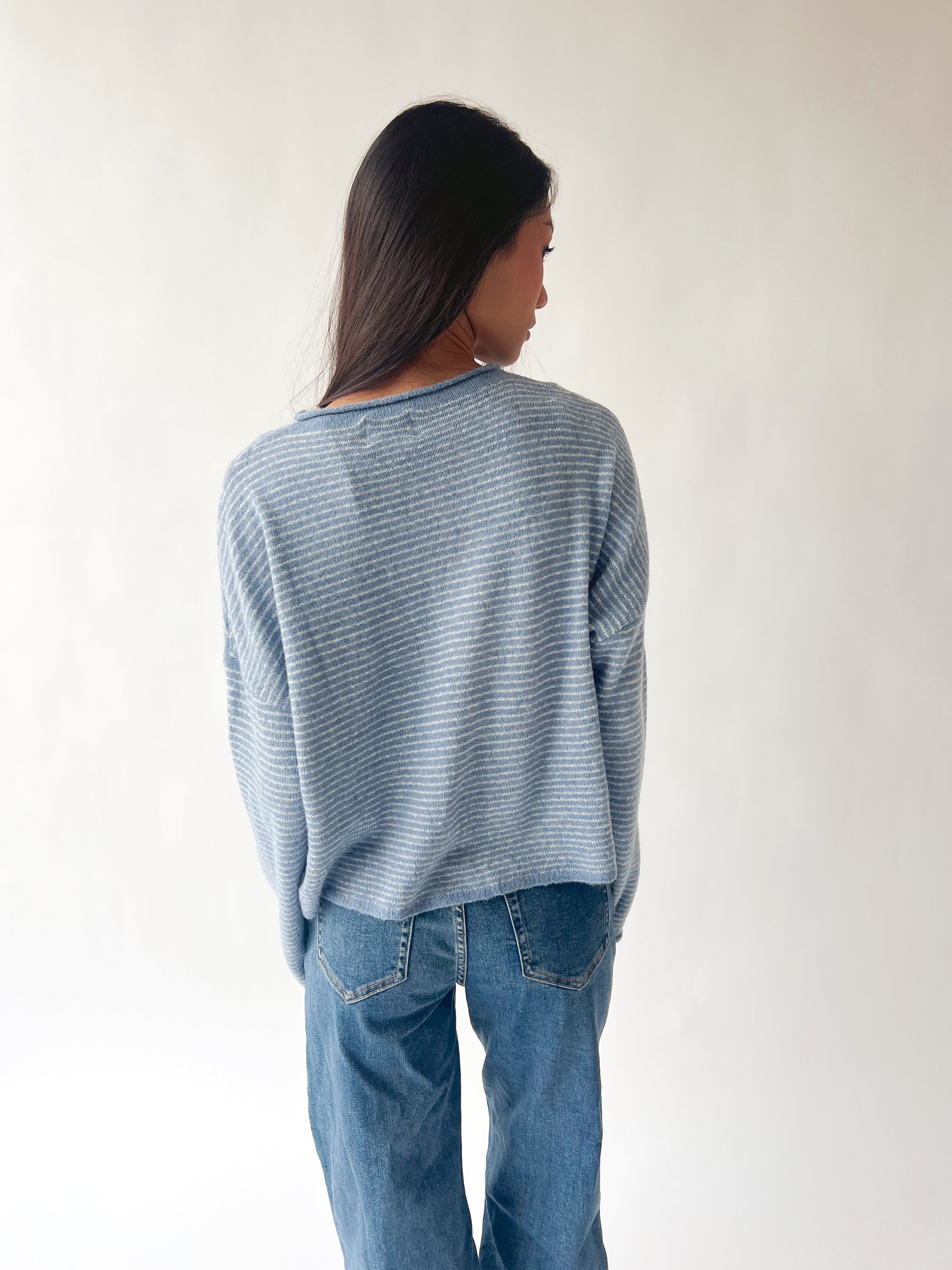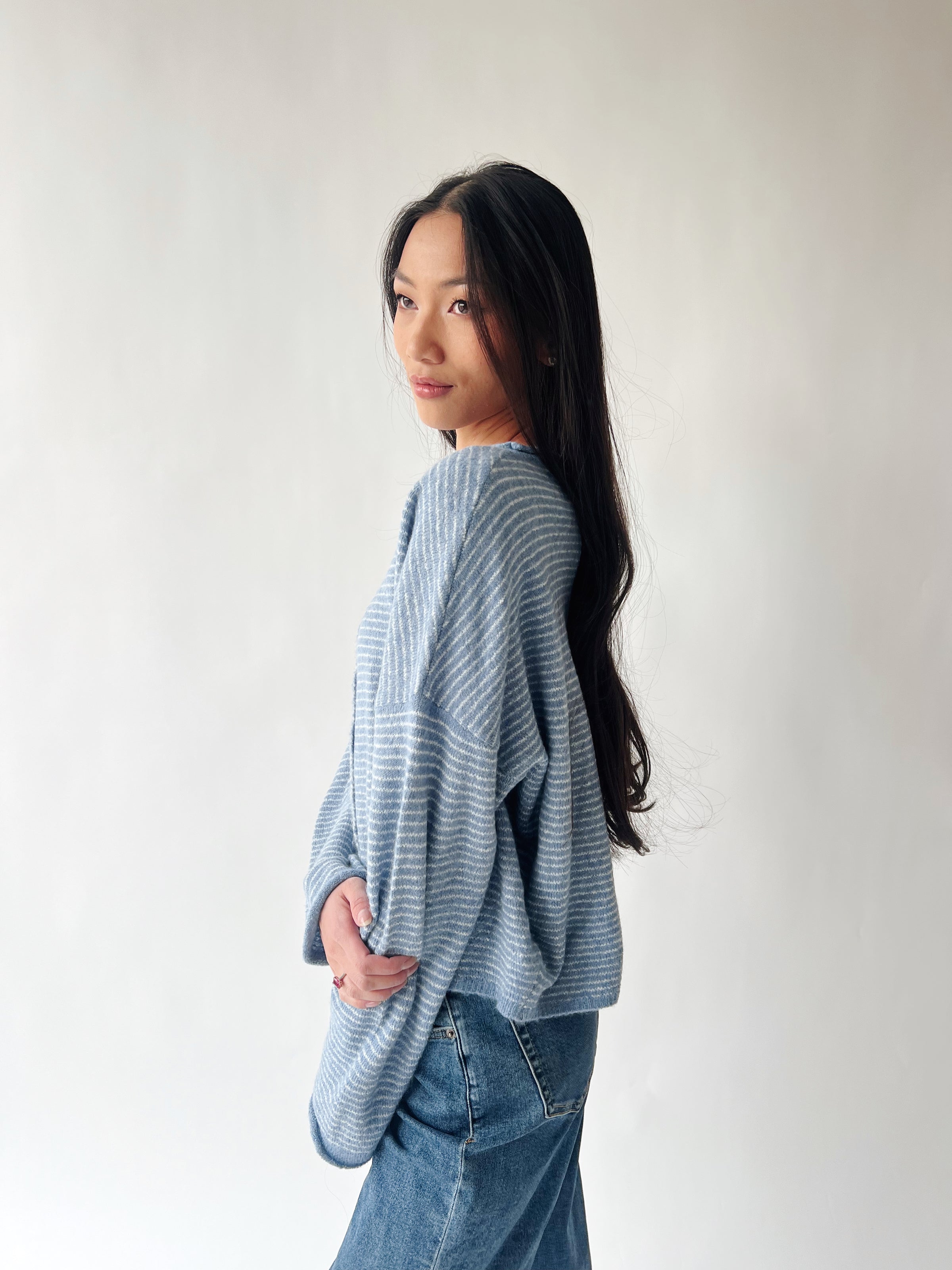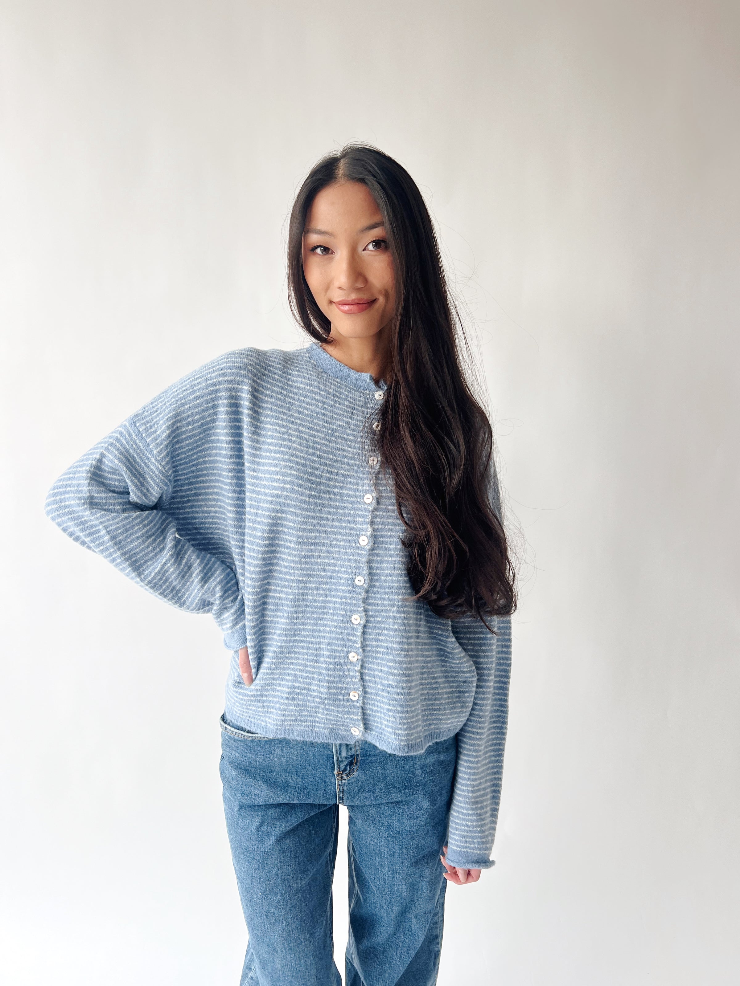 The Riggs Button-Down Sweater in Dusty Blue + Ivory Mini Stripe is your new go-to for effortless style. This charming knit layers beautifully over tees or stands solo as a polished piece. The classic mini stripe pattern adds visual interest while the soft, breathable fabric keeps you cozy without the bulk. Button-down front makes it easy to adjust your vibe throughout the day—buttoned up for put-together moments or left open for relaxed weekend energy. A wardrobe essential that works harder than it looks.