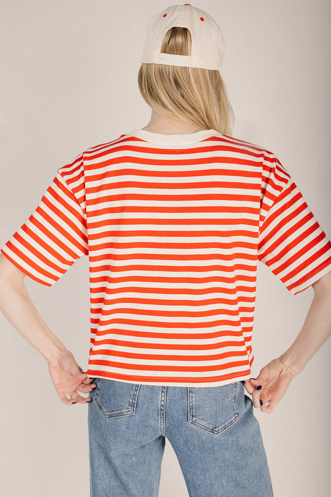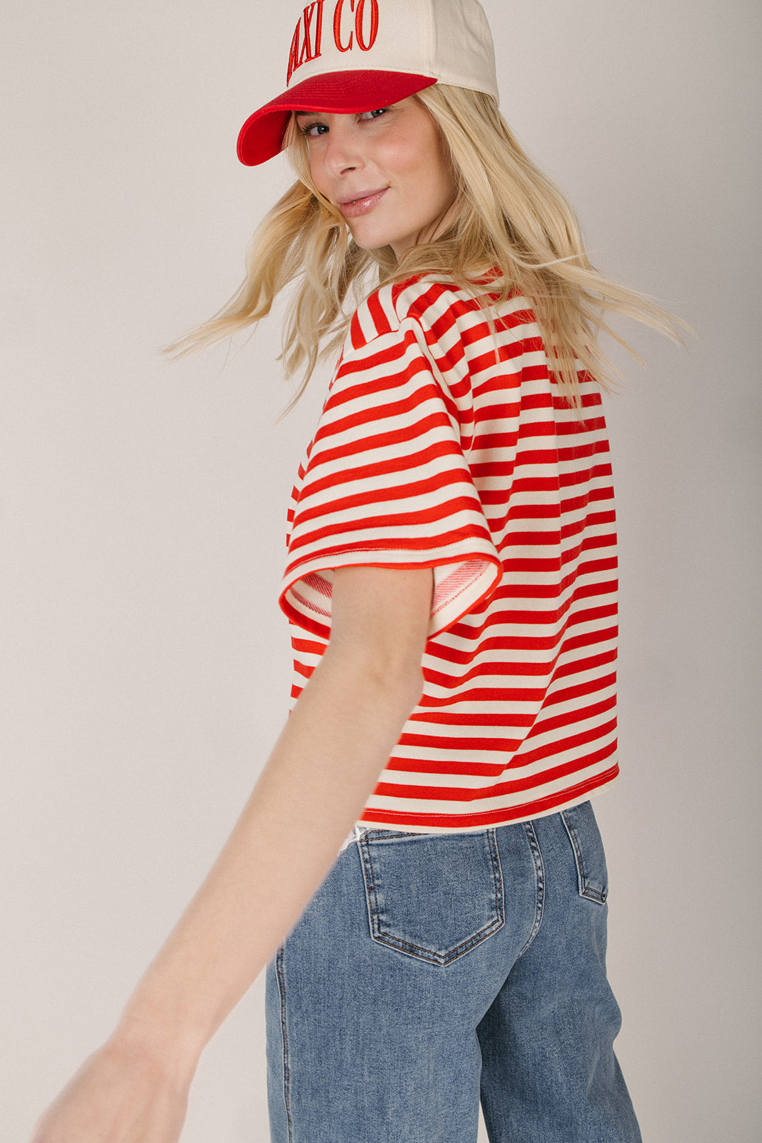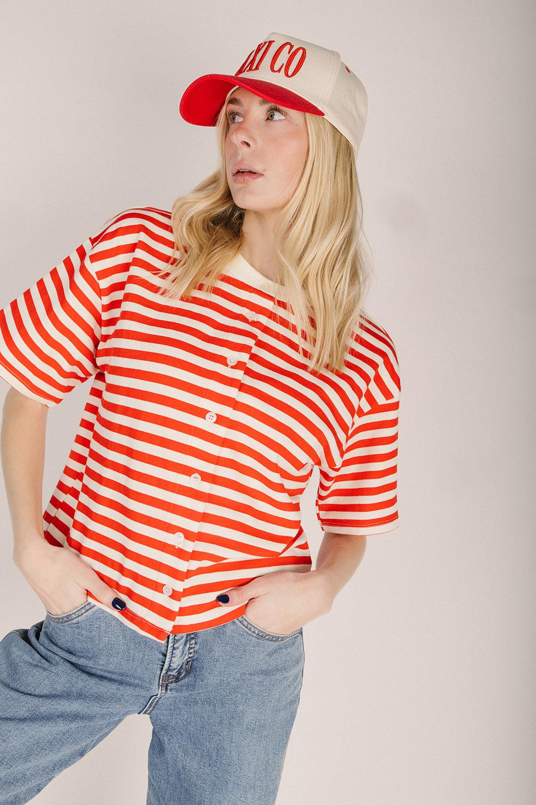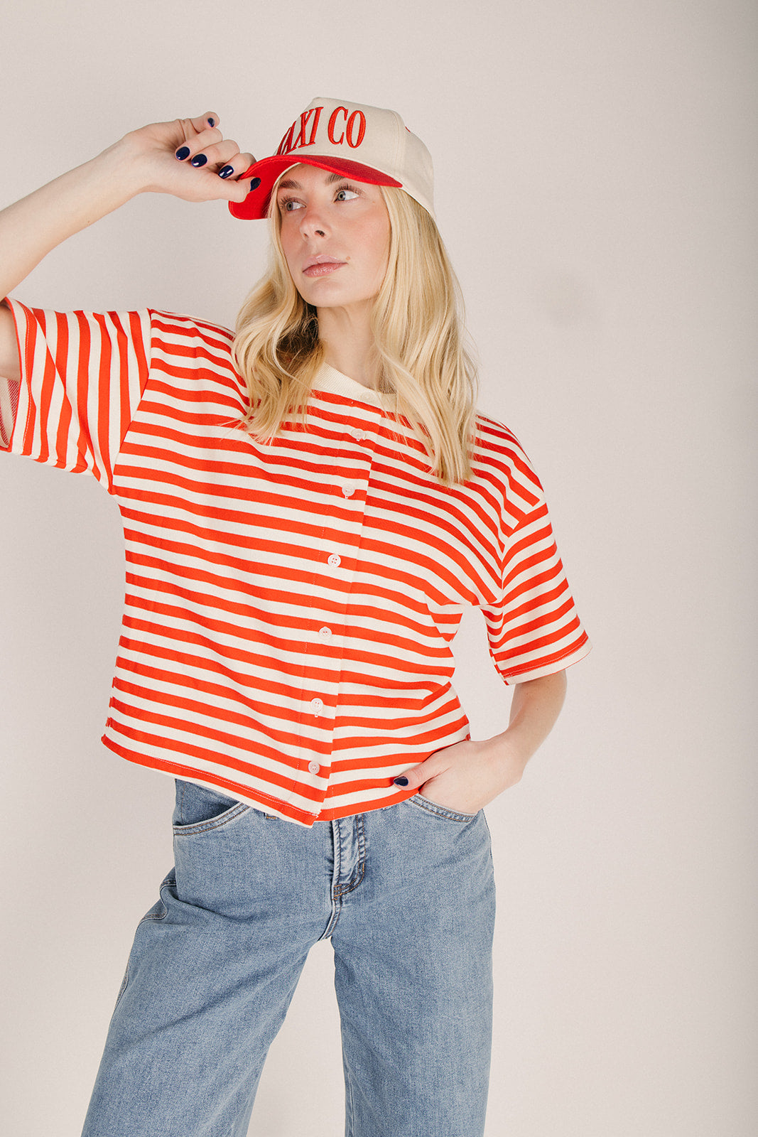 The Splendora Striped Button-Up Blouse in Red + Cream
