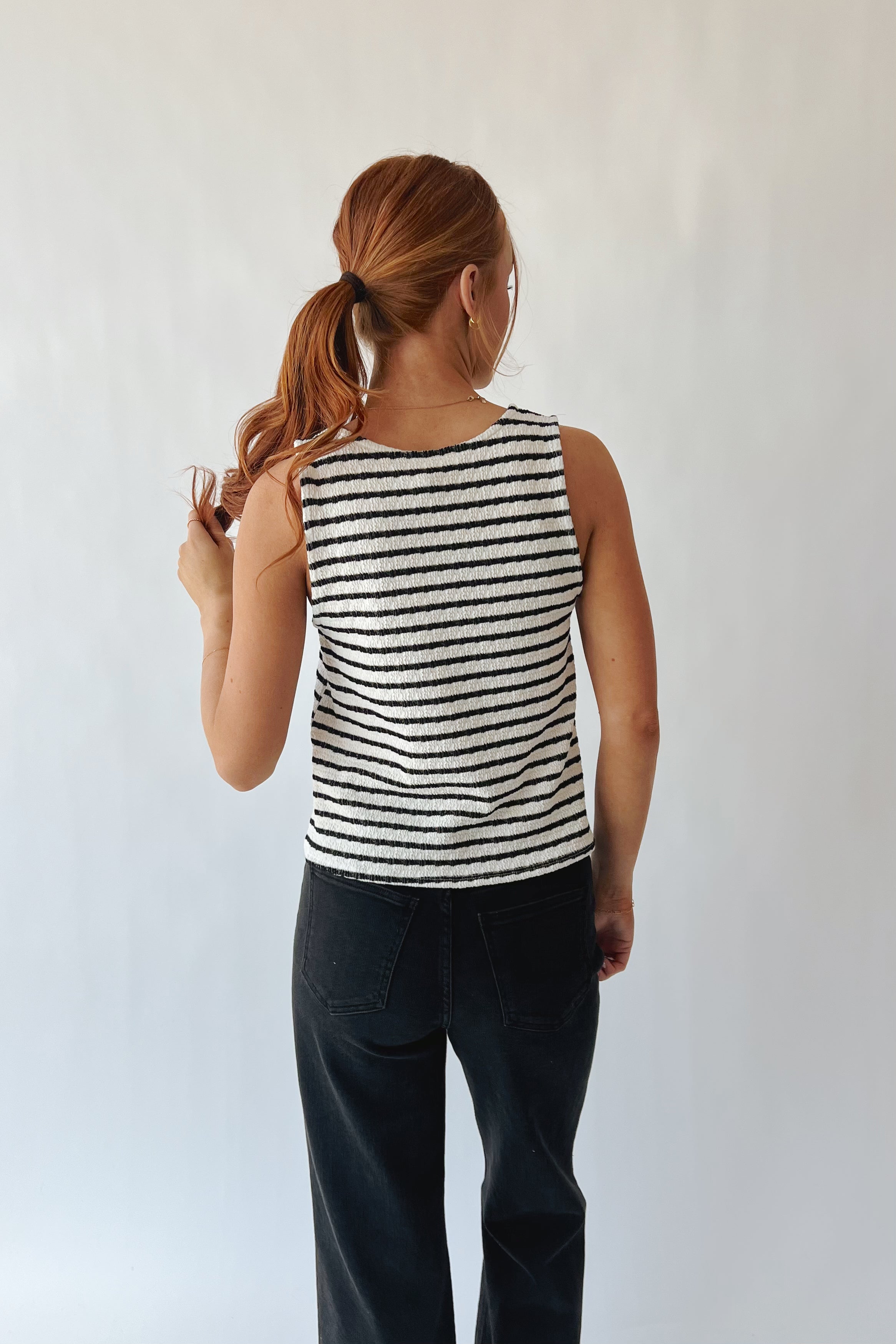 Stripes never go out of style—and this textured tank proves it. The Tatiana pairs classic black and white stripes with a relaxed, easy-to-wear silhouette that works from brunch to evening plans. It's the perfect layering piece or standalone essential. Effortless, timeless, and ready for anything.