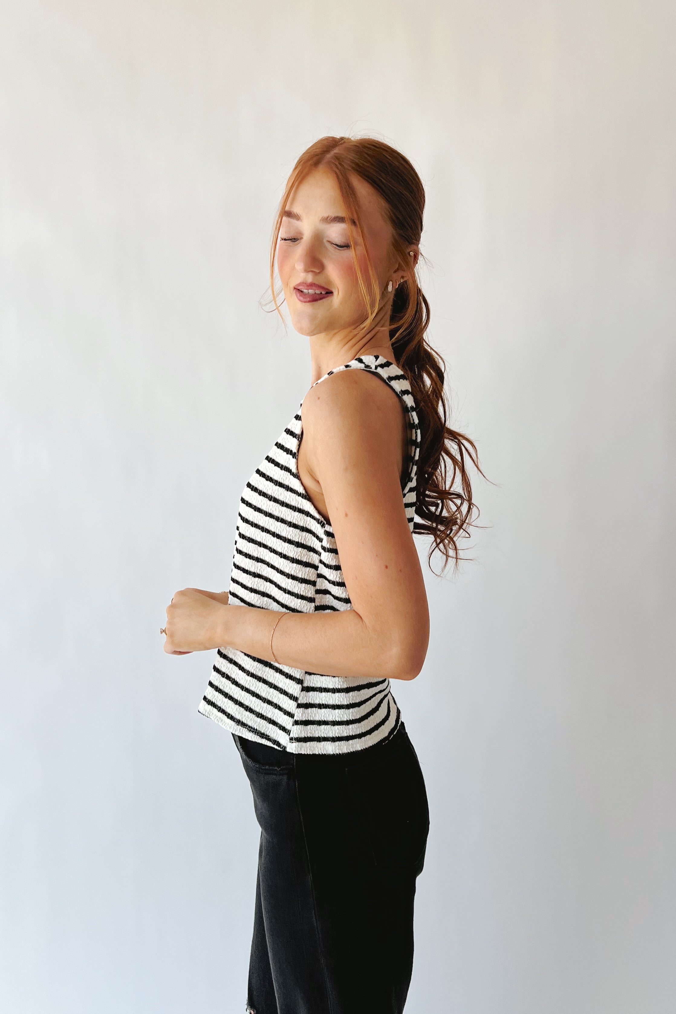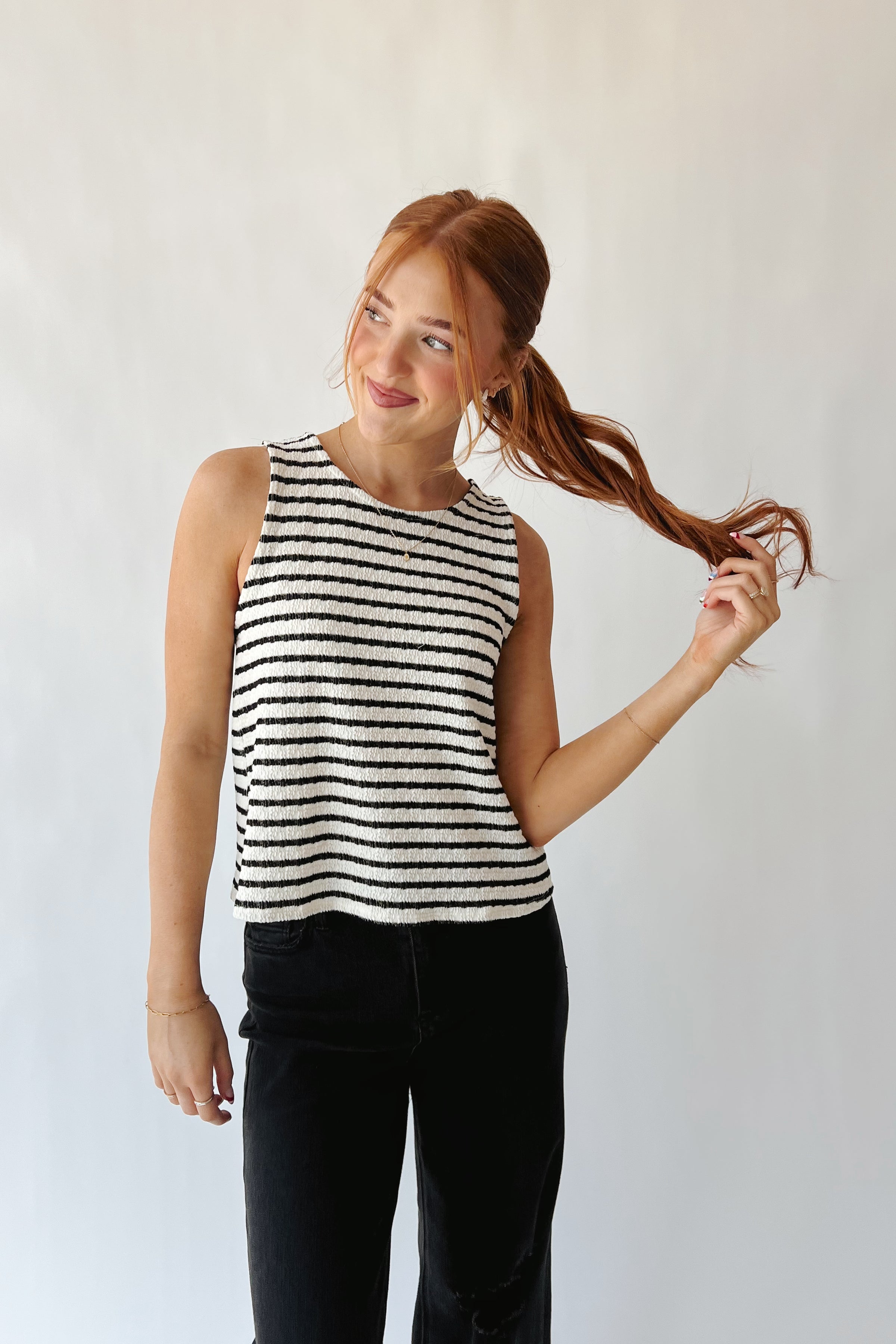 The Tatiana Textured Tank in Black + White Stripe