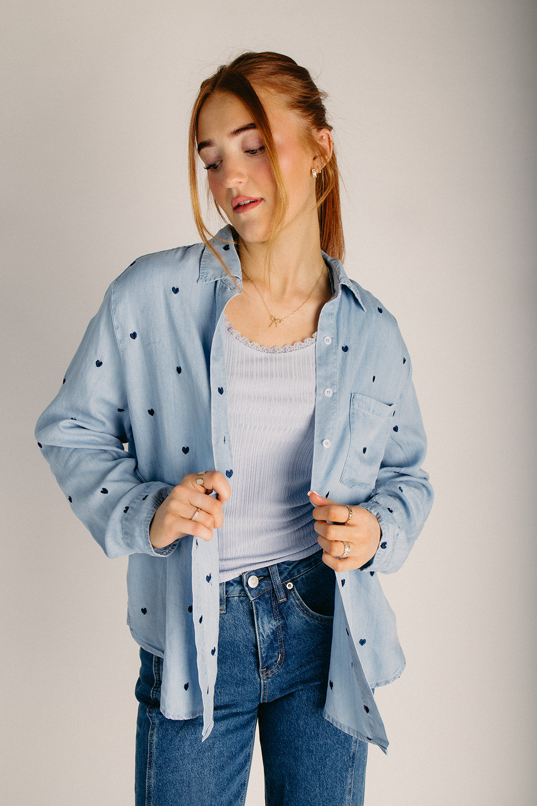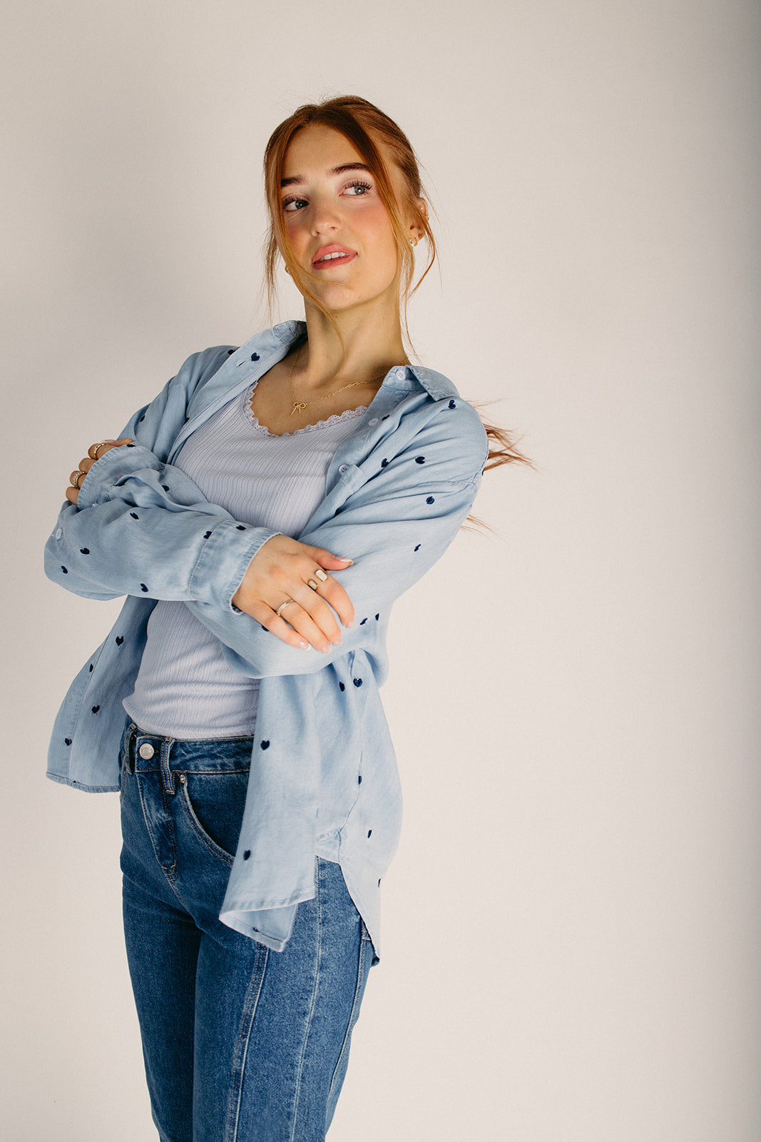 Meet your new favorite wardrobe essential—the Tirsa Heart Button-Up Blouse in Denim! This charming piece combines timeless denim style with playful heart details that'll make you smile every time you wear it. Whether you're dressing it up for a night out or keeping it casual with your favorite jeans, this blouse is the versatile companion you didn't know you needed. Button up, stand out, and let your style do the talking!