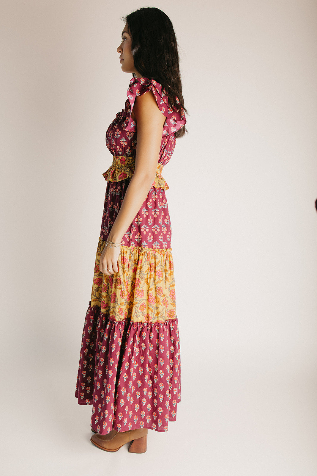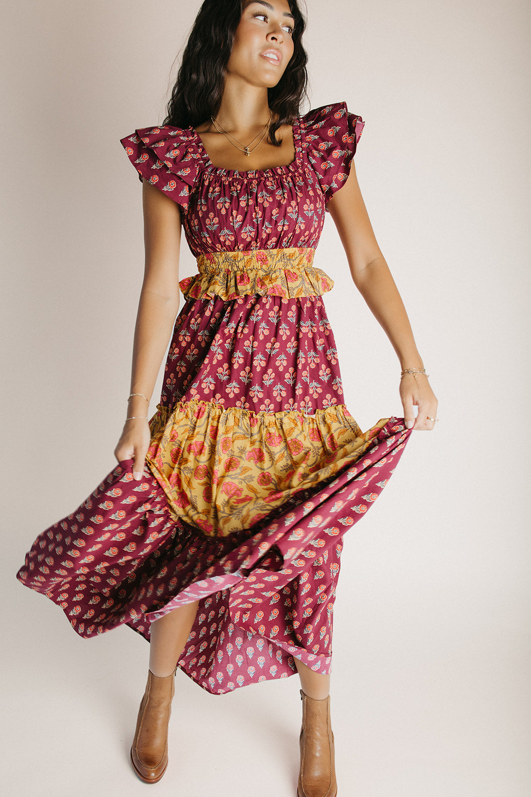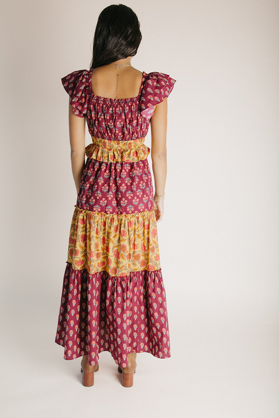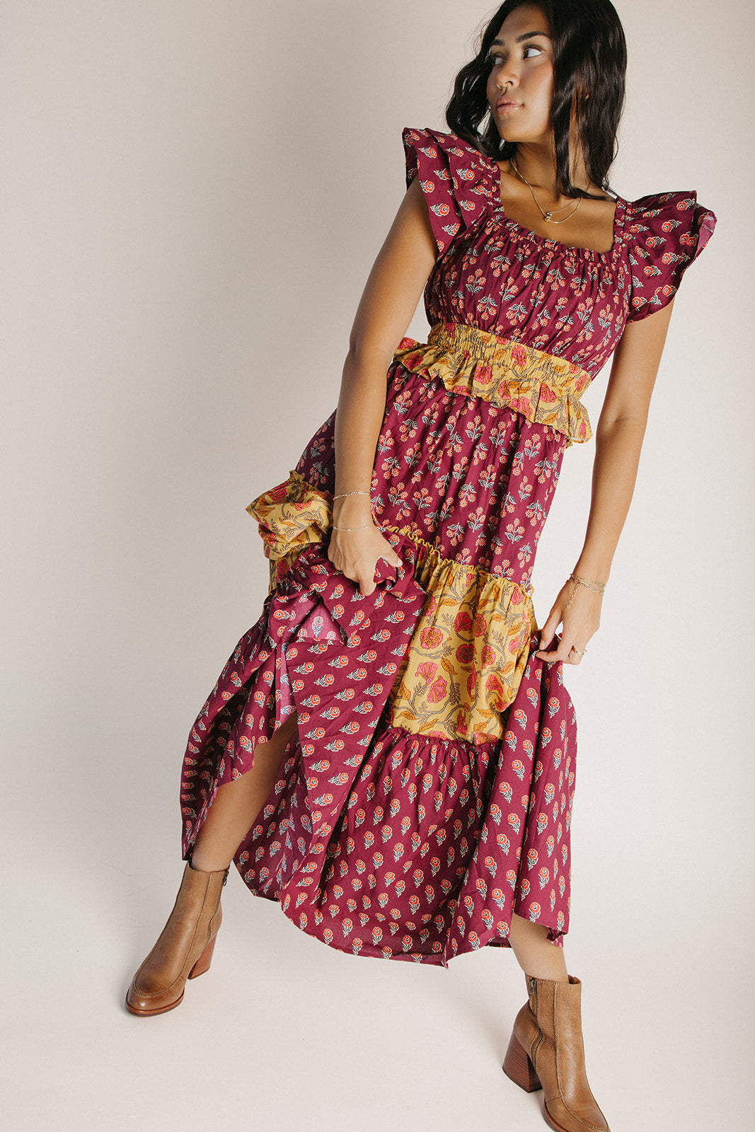 The Widmer Mixed Print Maxi Dress in Burgundy + Gold