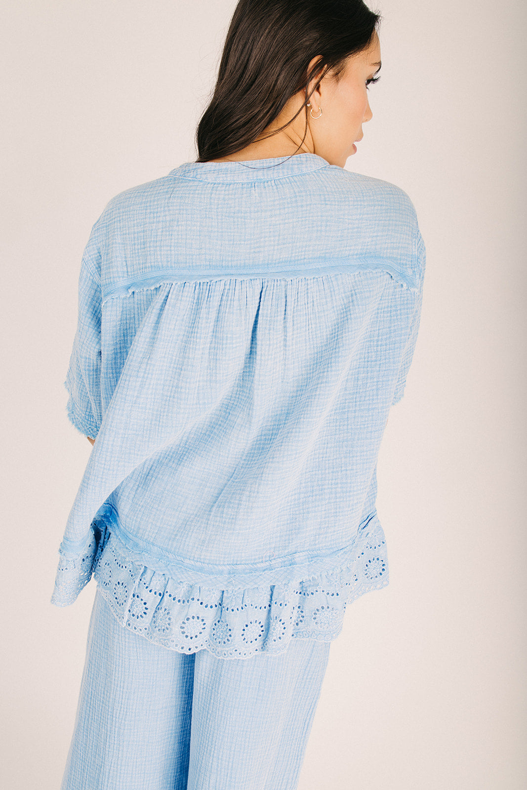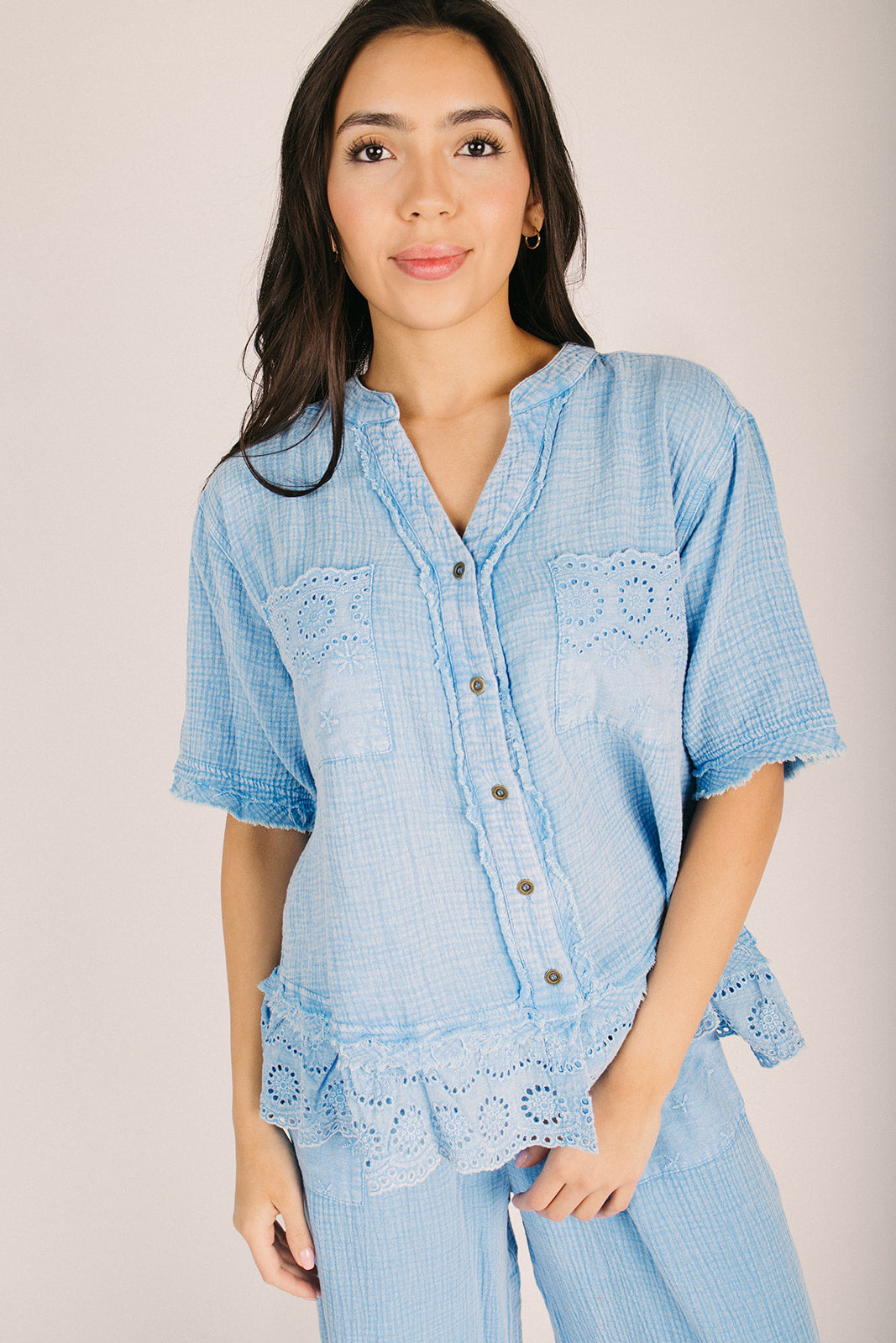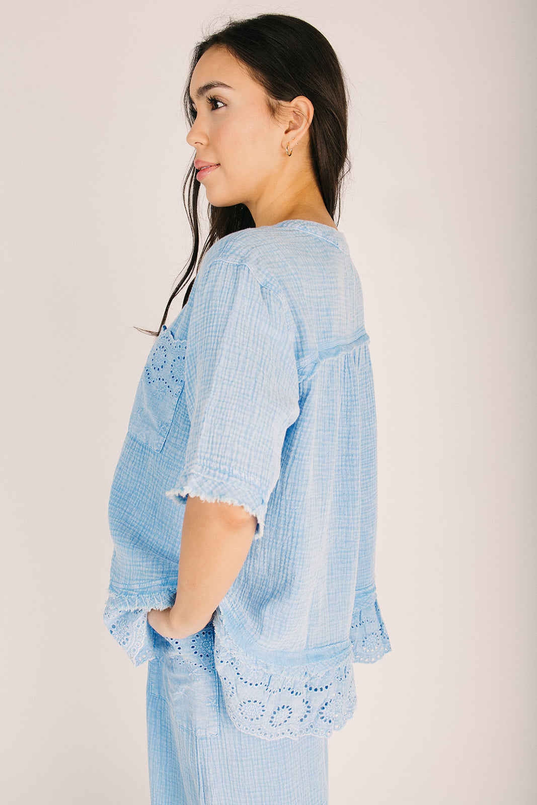 The Cutler Crochet Detail Blouse in Day Blue is your new go-to for effortless style. This charming blouse features delicate crochet detailing that adds texture and visual interest without trying too hard. The soft day blue hue pairs beautifully with everything from denim to tailored trousers, making it endlessly versatile. Perfect for casual outings or dressing up with the right accessories, this piece brings a touch of handcrafted elegance to your everyday wardrobe.