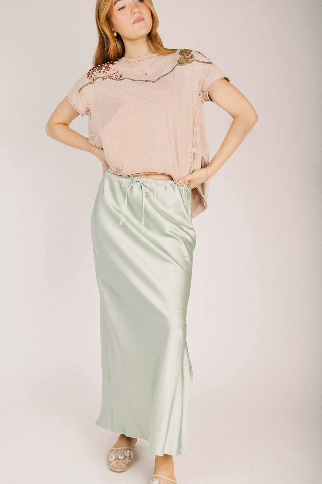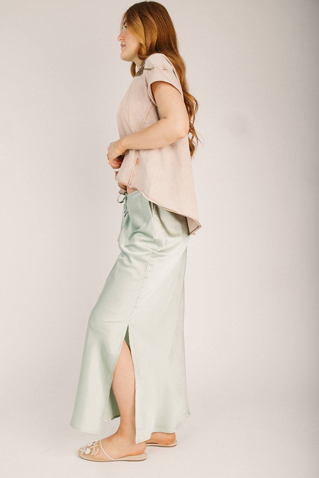 Slip into effortless elegance with the Ladonia Satin Midi Skirt in Sage. This luxe piece features a silky-smooth satin finish that catches the light beautifully, while the midi length offers a sophisticated vibe that works for everything from brunch dates to evening adventures. The sage hue is that perfect neutral-meets-cool shade that plays well with practically anything in your closet. Comfortable, chic, and ready to become your new go-to favorite.