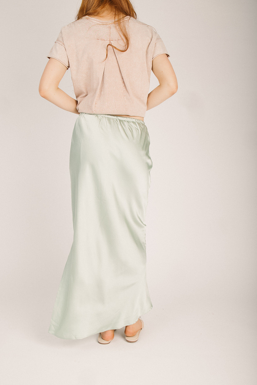 The Ladonia Satin Midi Skirt in Sage