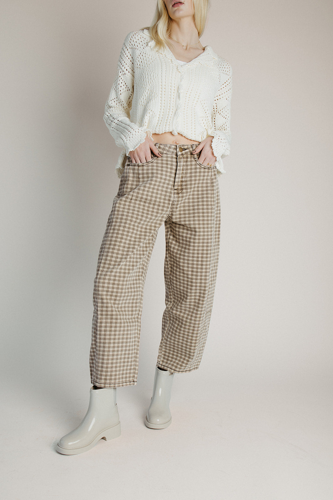 Step into style with The Bettini Checkered Barrel Pant in Tan + Brown! These pants bring a fun twist to your wardrobe with their eye-catching checkered pattern and flattering barrel shape. Perfect for mixing and matching, they add a playful vibe while keeping you comfy all day long. Whether you're dressing up or going casual, these pants know how to steal the spotlight with every step you take.