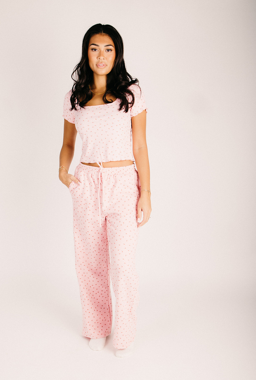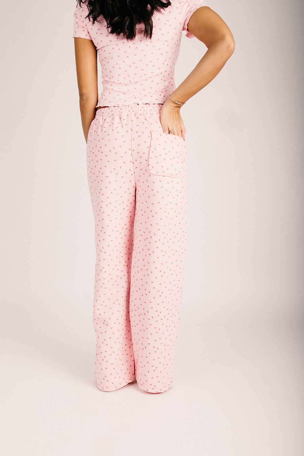 Kick back in style with these cherry-printed lounge pants that prove comfort doesn't have to be boring. Soft, breathable fabric keeps you cozy whether you're lounging at home or running errands around town. The relaxed fit and playful cherry print add a fun pop of personality to your everyday wardrobe. Perfect for those days when you want to feel put-together without sacrificing comfort. Available in a gorgeous pink that's equal parts sweet and chic. Pairs perfectly with The Asper Scoop Neck Cherry Print Tee in Pink!