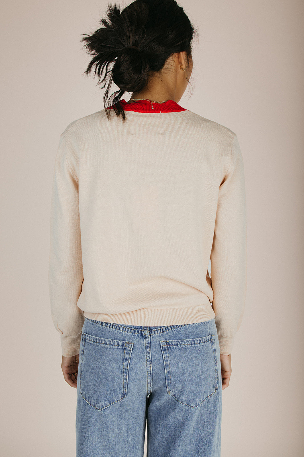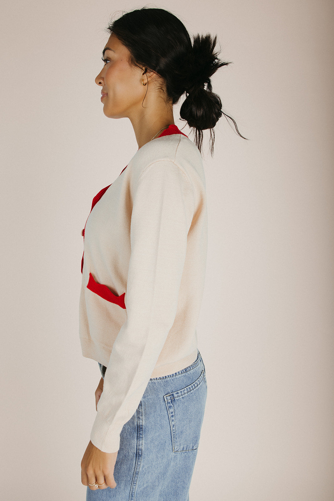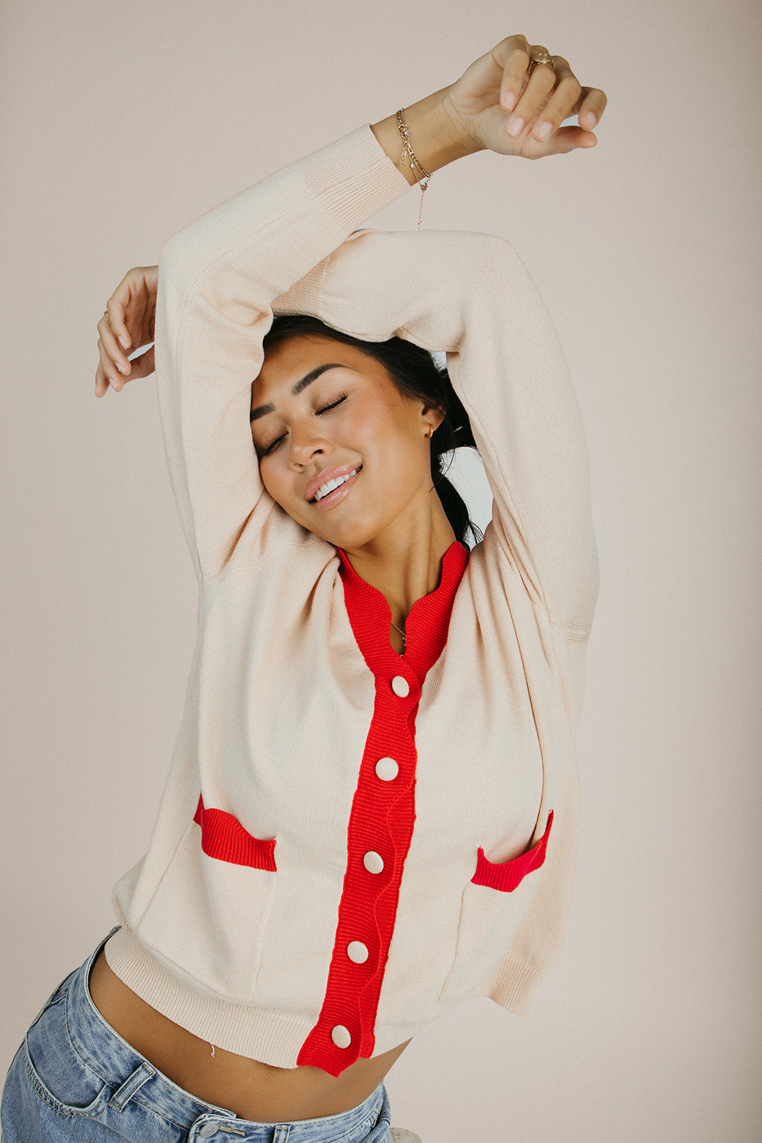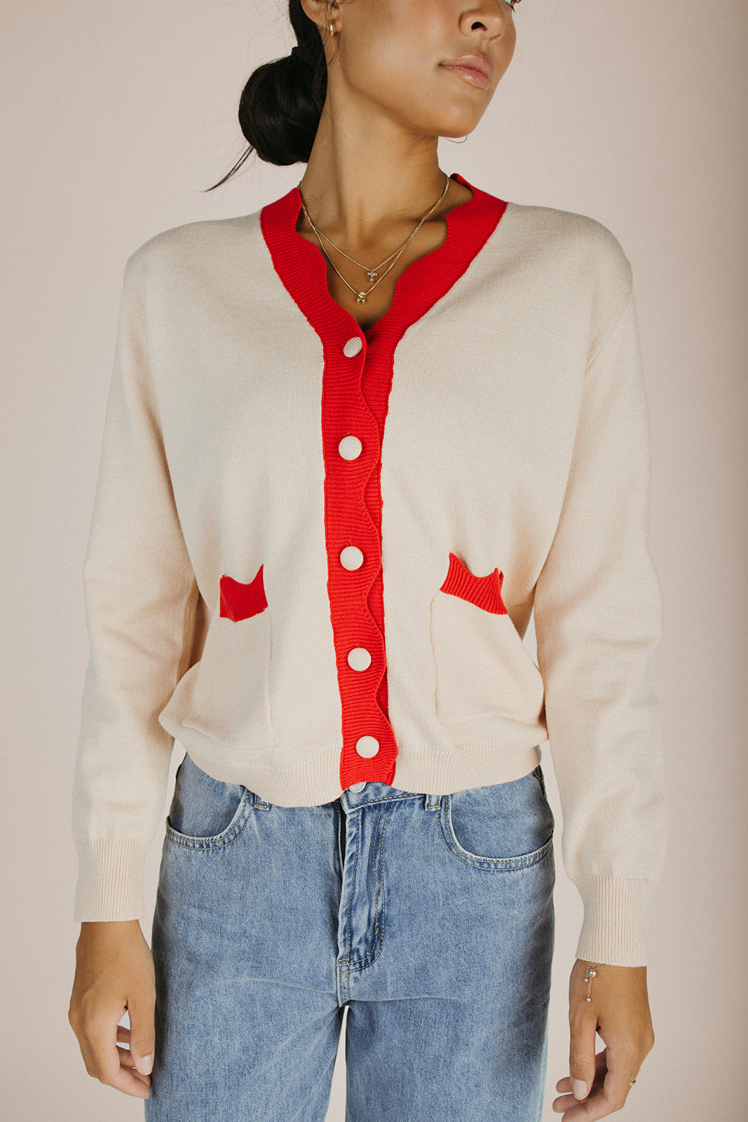 The Lonnie Scalloped Detail Cardigan in Cream + Red